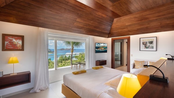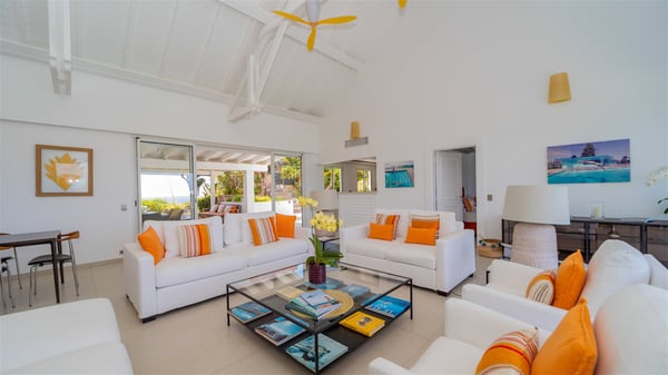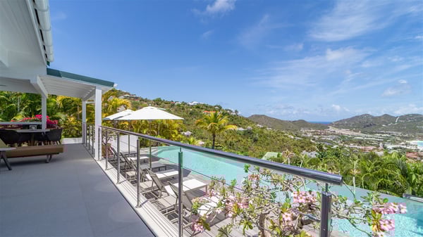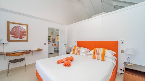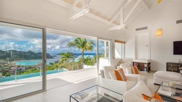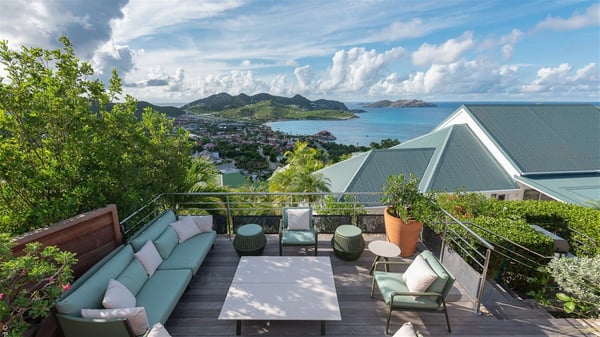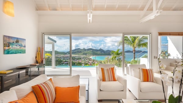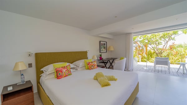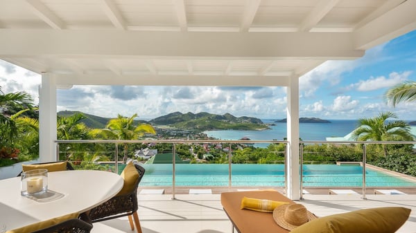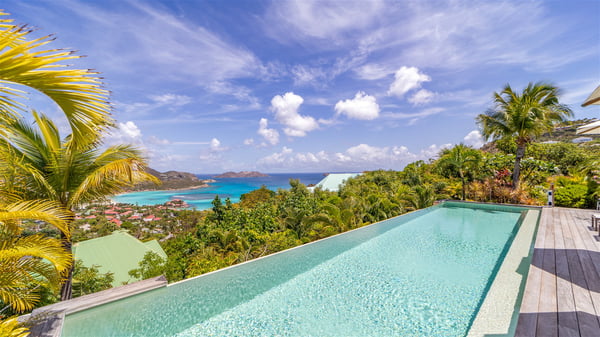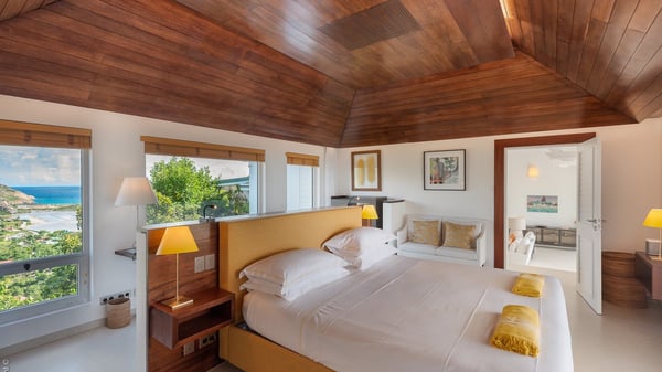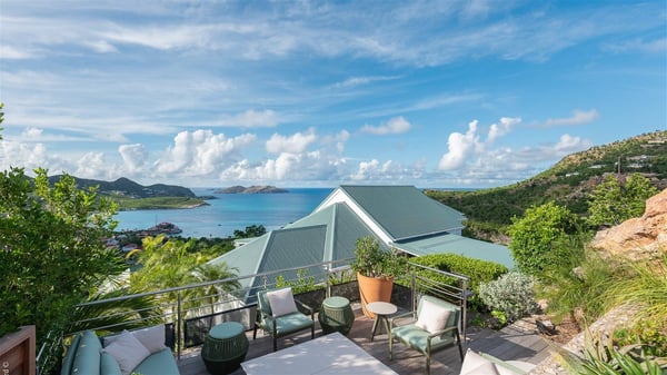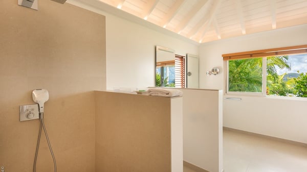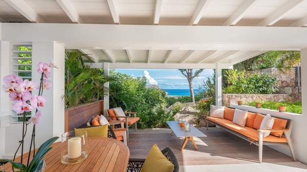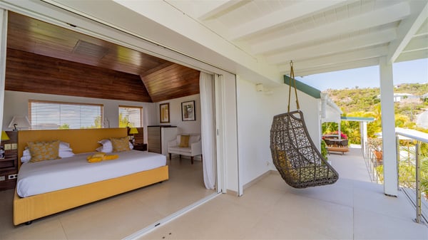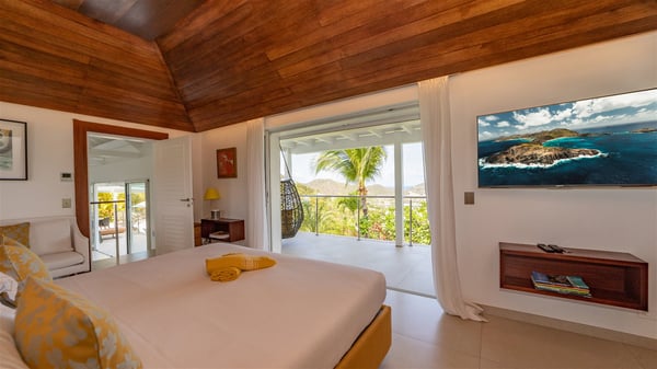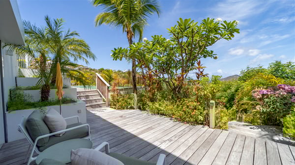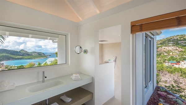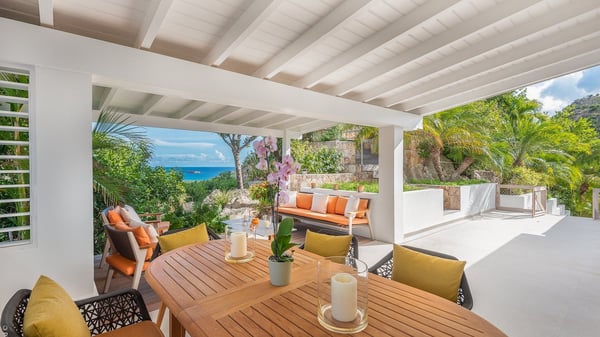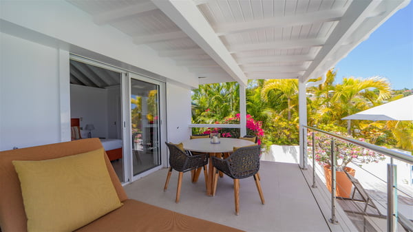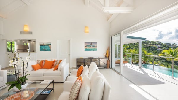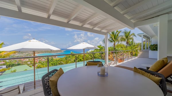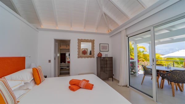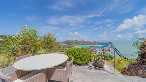 The luxury villa OTT in St-Barths is a magnificent four-bedroom property with panoramic views over St-Jean Bay up to Saline. Nestled in the heart of the tropical vegetation, this spacious vacation rental welcomes groups of up to eight people in a privileged environment and upscale amenities, for an unforgettable stay in St-Barths with family or friends. Built over two levels, villa OTT is ideally located in St-Jean, with stunning ocean views that can be enjoyed from both the front and back of the property. The air-conditioned living room features a comfortable lounge with light tones illuminated by orange cushions, as well as the indoor dining room under the high vaulted ceiling. In this cozy setting, the large windows let in the beautiful Caribbean light and the amazing view over the deep-blue ocean. What’s more, the well-equipped kitchen has everything you need to cook delicious meals and prepare cocktails to sip in the gentle trade winds. The terrace of villa OTT is located at the front of the property and offers a gorgeous view over St-Jean bay surrounded by the green Caribbean hills. In front of the ocean, the infinity swimming pool sparkles under the sun, close to the comfy deck chairs in a very private atmosphere. Under the covered area, you’ll find the pleasant outdoor lounge where you’ll enjoy relaxing and restful moments, as well as the outdoor dining room to dine al fresco in the tropical beauty. The lush, flowering plants of the property create an idyllic atmosphere, perfect to relax and marvel at nature’s beauty. There is also a lovely gazebo which overlooks the view and features a comfortable lounge. A barbecue is also at your disposal to cook under the starry sky in a romantic atmosphere. The villa rental OTT consists of four air-conditioned bedrooms with en-suite bathrooms. They are spread over two levels, two of which are on the main level on either side of the living room, and the other two ones on the lower level. All feature king-size beds and open onto beautiful terraces overlooking the ocean and the fine garden. In the warm and cozy decor, the atmosphere is serene, the ideal set up to rest and quietly relax in the Caribbean beauty. Close to St-Jean beach, the luxurious villa rental OTT is the perfect place for a fantastic getaway in St-Barths.