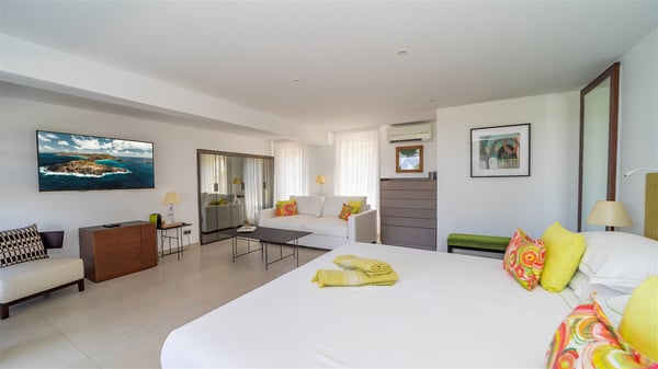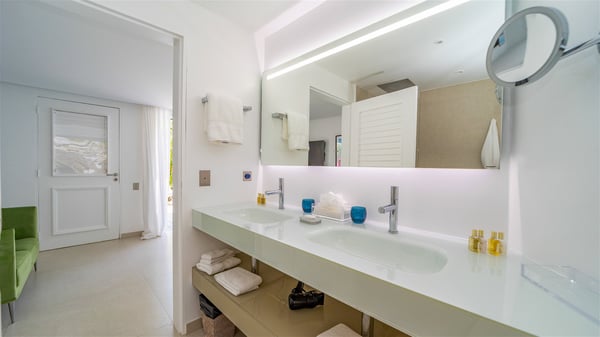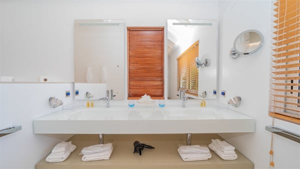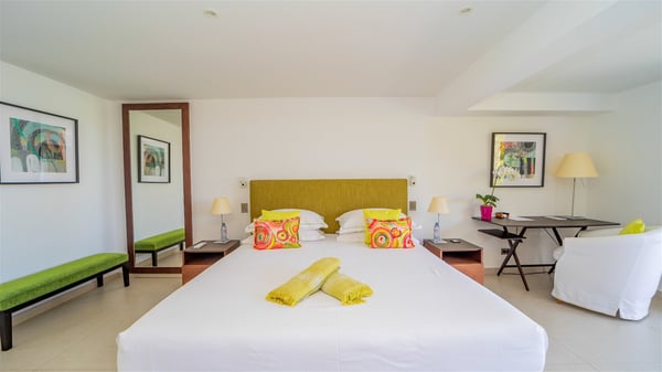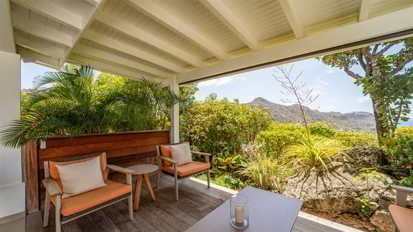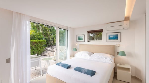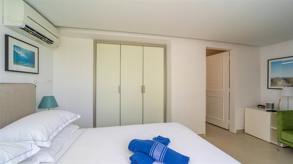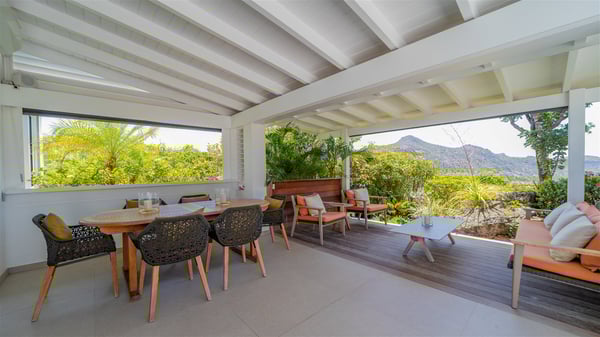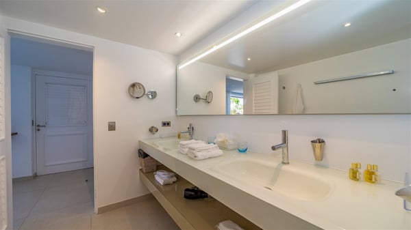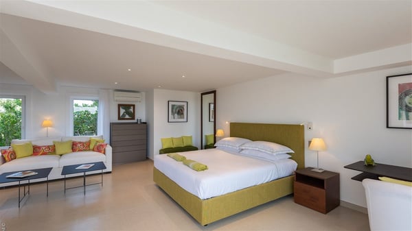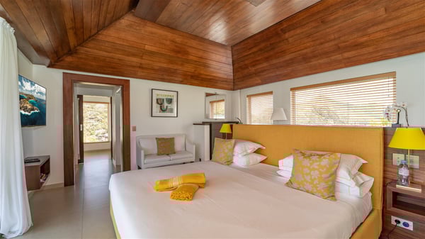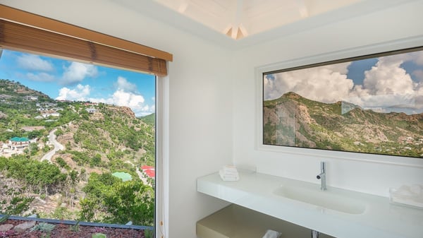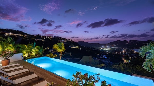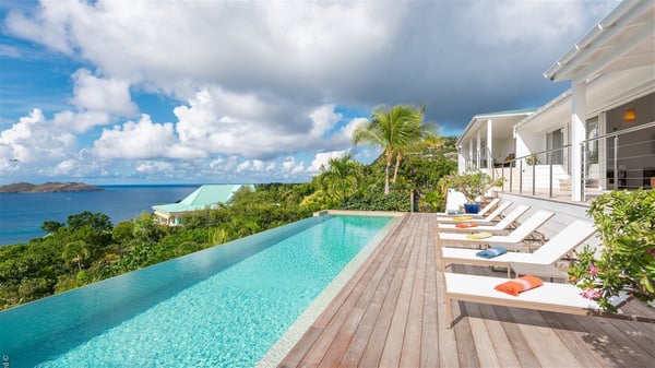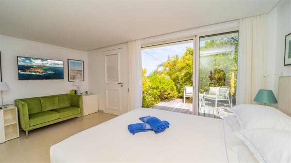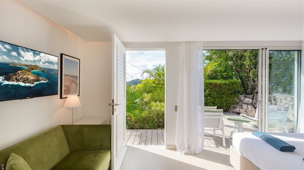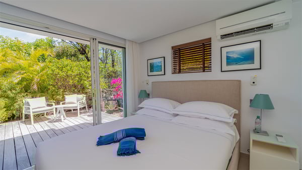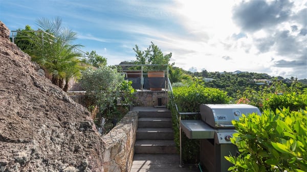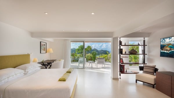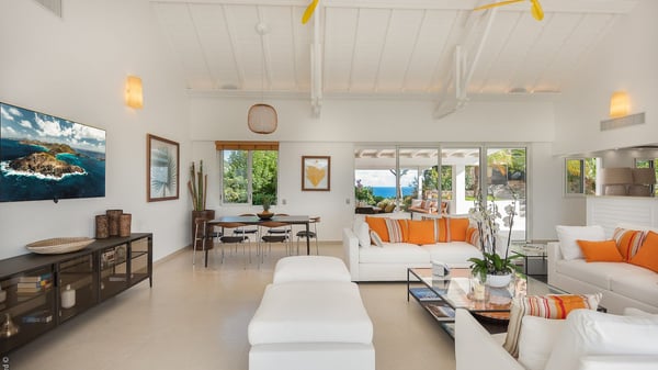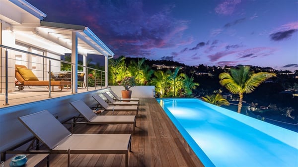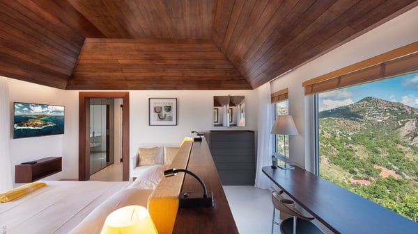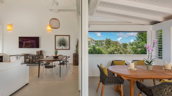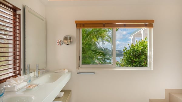 The luxury villa OTT in St-Barths is a magnificent four-bedroom property with panoramic views over St-Jean Bay up to Saline. Nestled in the heart of the tropical vegetation, this spacious vacation rental welcomes groups of up to eight people in a privileged environment and upscale amenities, for an unforgettable stay in St-Barths with family or friends. Built over two levels, villa OTT is ideally located in St-Jean, with stunning ocean views that can be enjoyed from both the front and back of the property. The air-conditioned living room features a comfortable lounge with light tones illuminated by orange cushions, as well as the indoor dining room under the high vaulted ceiling. In this cozy setting, the large windows let in the beautiful Caribbean light and the amazing view over the deep-blue ocean. What’s more, the well-equipped kitchen has everything you need to cook delicious meals and prepare cocktails to sip in the gentle trade winds. The terrace of villa OTT is located at the front of the property and offers a gorgeous view over St-Jean bay surrounded by the green Caribbean hills. In front of the ocean, the infinity swimming pool sparkles under the sun, close to the comfy deck chairs in a very private atmosphere. Under the covered area, you’ll find the pleasant outdoor lounge where you’ll enjoy relaxing and restful moments, as well as the outdoor dining room to dine al fresco in the tropical beauty. The lush, flowering plants of the property create an idyllic atmosphere, perfect to relax and marvel at nature’s beauty. There is also a lovely gazebo which overlooks the view and features a comfortable lounge. A barbecue is also at your disposal to cook under the starry sky in a romantic atmosphere. The villa rental OTT consists of four air-conditioned bedrooms with en-suite bathrooms. They are spread over two levels, two of which are on the main level on either side of the living room, and the other two ones on the lower level. All feature king-size beds and open onto beautiful terraces overlooking the ocean and the fine garden. In the warm and cozy decor, the atmosphere is serene, the ideal set up to rest and quietly relax in the Caribbean beauty. Close to St-Jean beach, the luxurious villa rental OTT is the perfect place for a fantastic getaway in St-Barths.