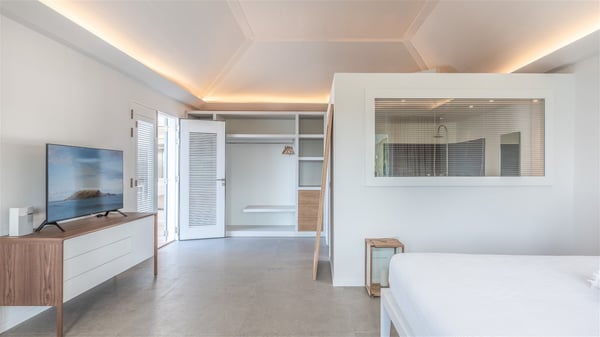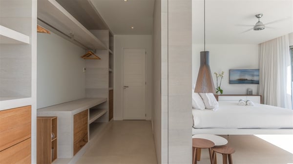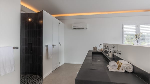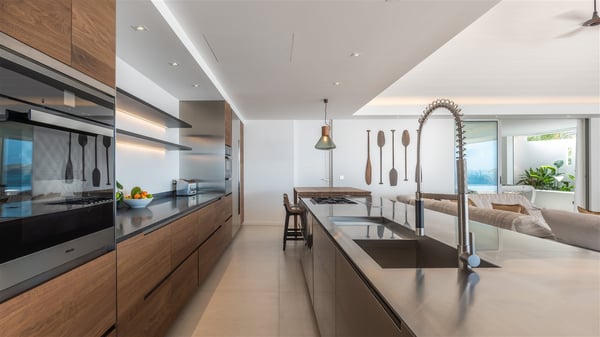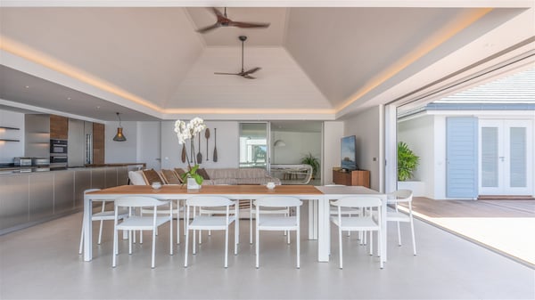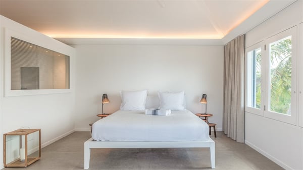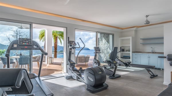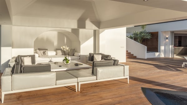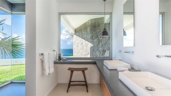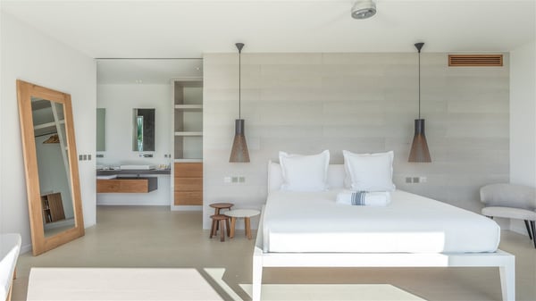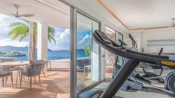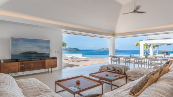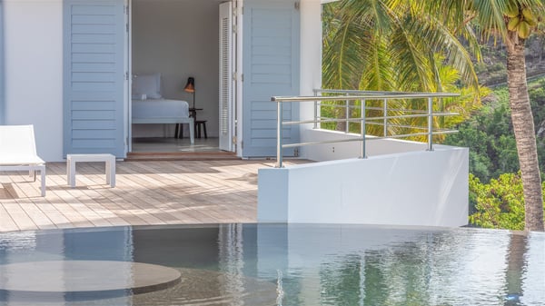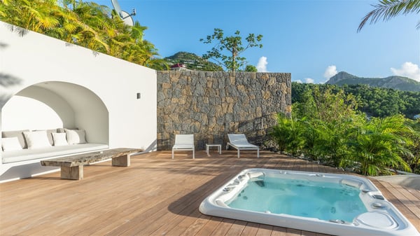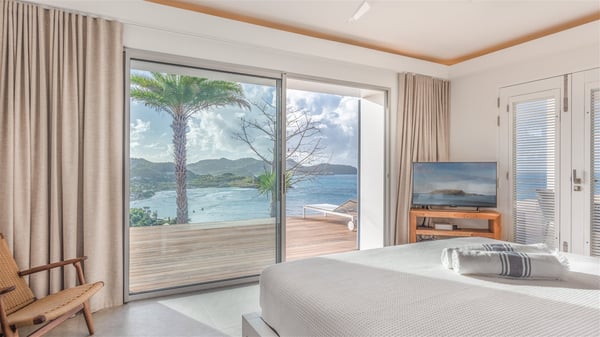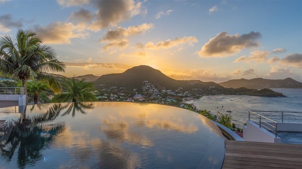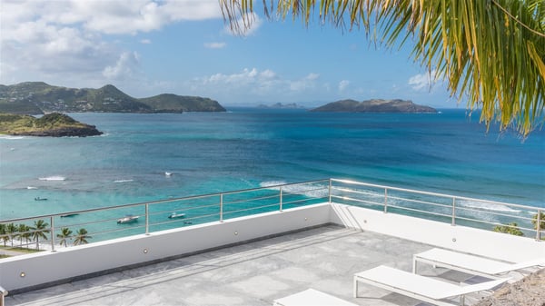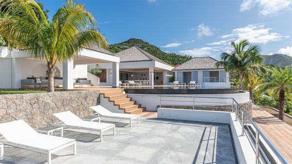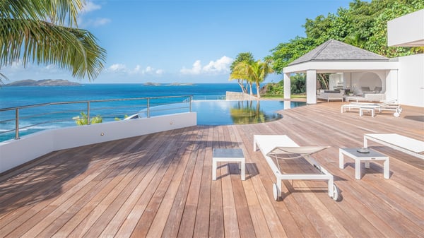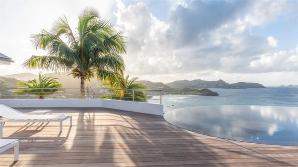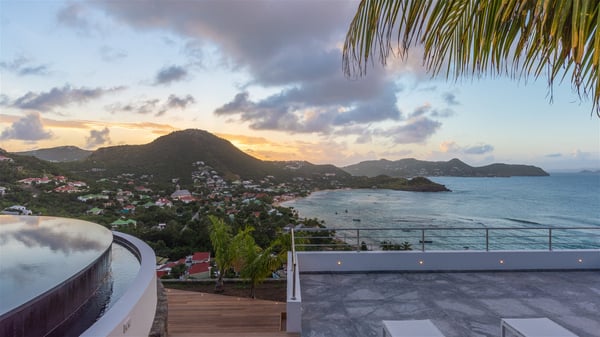 The splendid luxury vacation villa Coco is located on the heights of Lorient in Saint Barths and offers a spectacular sunset vista, as well as panoramic views over Lorient Bay and the nearby islands. It is very private and elegant, bright and uncluttered: everything is beautiful, right in the middle of an exceptional tropical atmosphere where you'll love dreaming. Fully renovated in a minimalist and modern design, this luxury St-Barts property is all about the glamorous and sophisticated way of life in St. Barts. The very comfortable living room of this stunning contemporary villa comes with a corner sofa and wooden coffee tables, all in a gorgeous medley of creamy neutral colours and wood contrasting with the blue hints of the ocean. An amazing white pool table is in the adjoining room for great moments with family or friends. The refined open dining room accommodates up to ten guests, a perfect setup for enjoying meals prepared in the well-equipped open kitchen, with a square table ideal for breakfasts or daytime snacks. All the spaces of the villa are designed to enjoy the stunning views and the sunsets, and the charming expansive terrace creates a serene and quiet atmosphere. A splendid nautilus-shaped infinity swimming pool seems to blend with the ocean. Sunbeds are there for pleasant moments of relaxation or reading times. Near the pool, there is a modern outdoor lounge with large sofas under a large patio, perfect for entertaining or just relaxing, while sunseekers will love the loungers near the pool. On the lower-level terrace, you’ll enjoy more loungers overlooking the bay, and the cozy jacuzzi. The luxury vacation rental Villa Coco consists of three beautiful air-conditioned bedrooms with ocean and hill views. They all have king-size beds with cushions in a soft and refined Caribbean style, as well as en-suite bathrooms. Two bedrooms are on the main level, close to the indoor living area, while the third bedroom is on the lower level. This one is slightly larger and has access to its own private terrace where there is an outdoor lounge and a jacuzzi. On the same level, there is a very well-equipped fitness room. Between ocean, hills and coconut trees, villa Coco is a true haven of peace in the heart of the Caribbean.