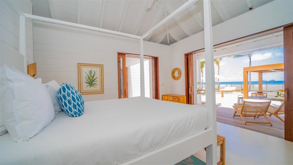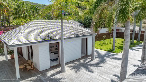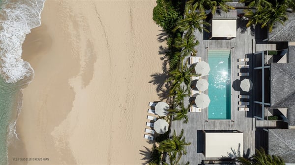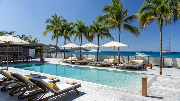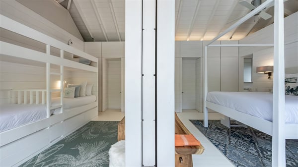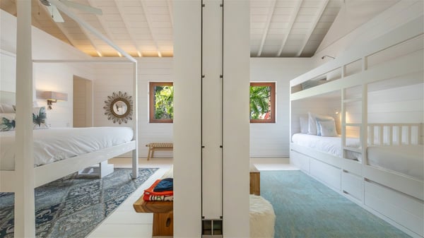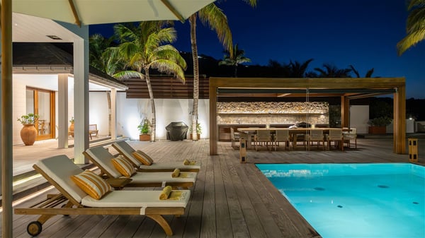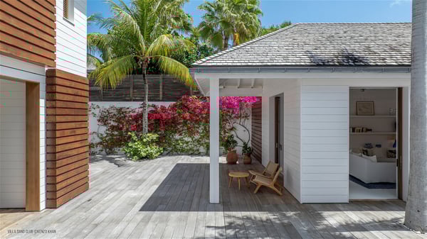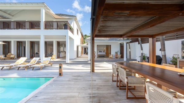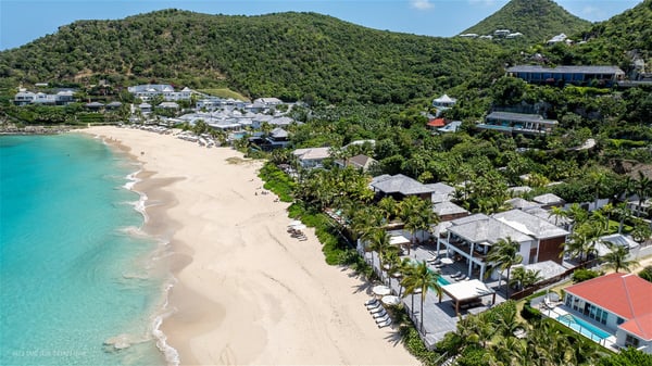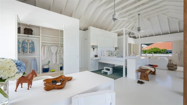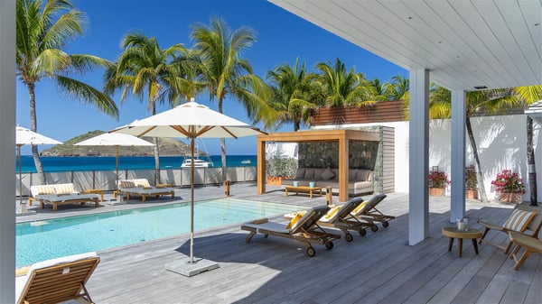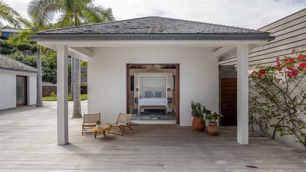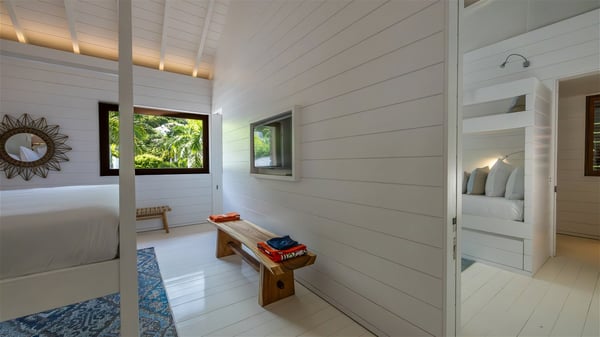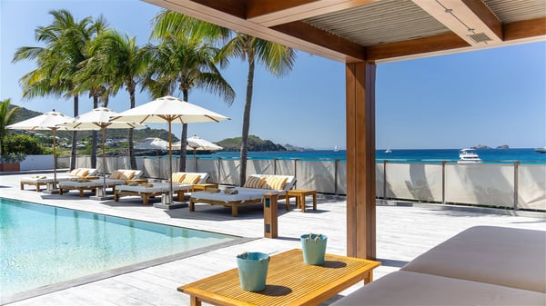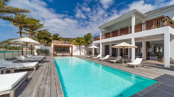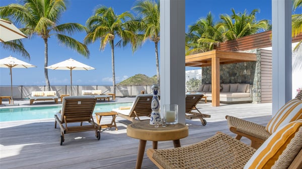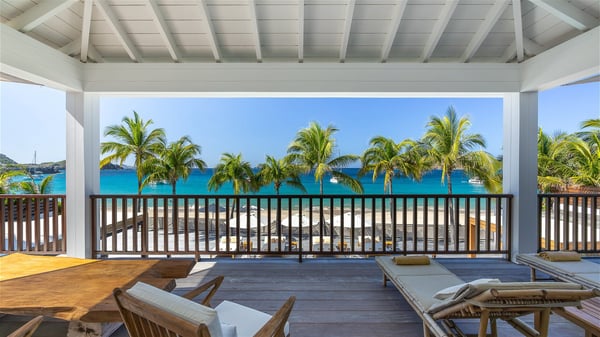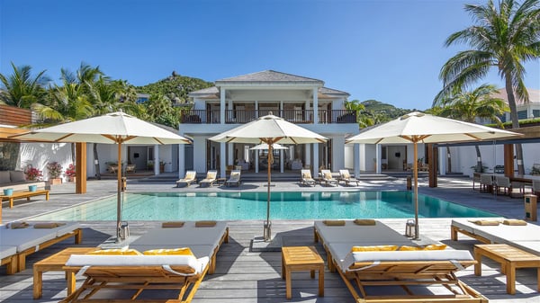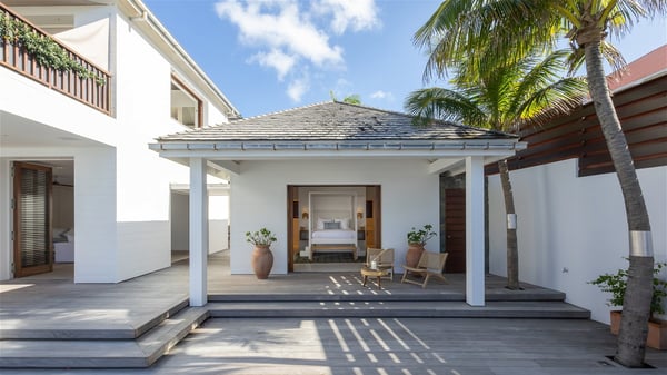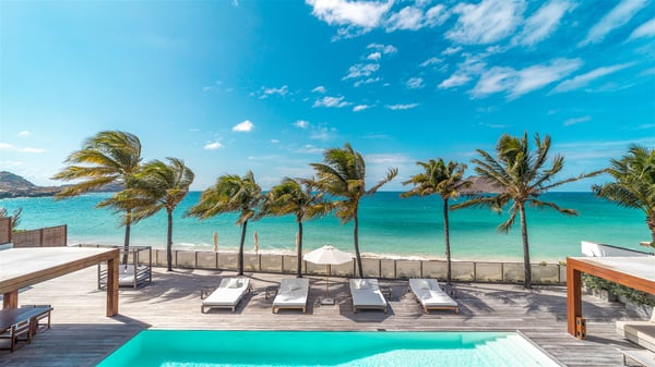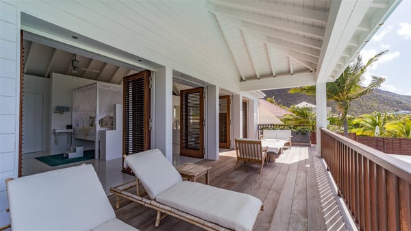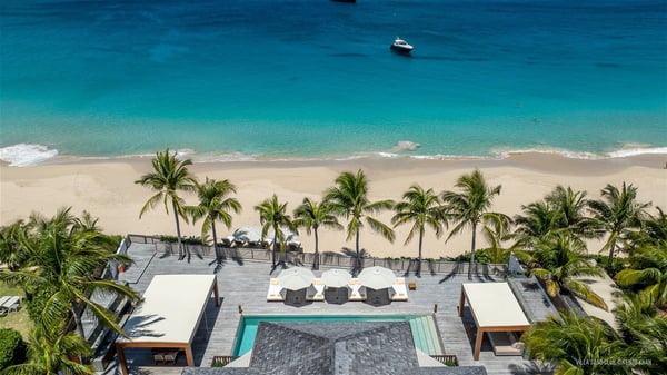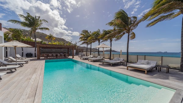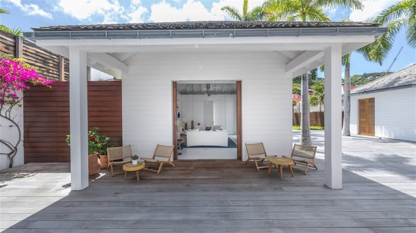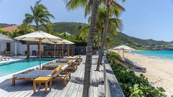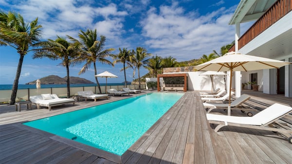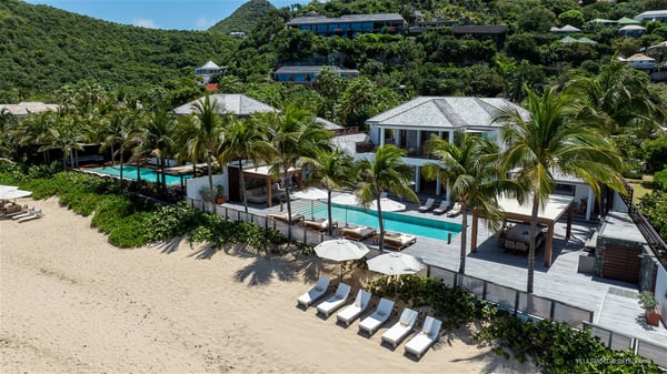 With a large entrance opening onto a woody palm tree ground and a perfect lawn, the luxurious rental villa Sand Club is one of the most outstanding properties in St. Barths, and among the most impressive beachfront villas located on the Flamands Beach. This modern colonial-style mansion is a true treasure, an ode to dreams and relaxation. The villa Sand Club is built on several pavilions while the main house is built on two levels. The very contemporary living room features expansive sofas and armchairs with blue-sprinkled cushions: a perfect setup for spending delicious moments listening to the sound of the waves. In an oceanic atmosphere coming with white walls and a very refined decoration, while the shutters filter Saint-Barth’s light, all is quiet and soothing. The magnificent indoor dining room table made of white wood will be the perfect spot for your delicious gastronomic moments. At the back of the living room, the perfectly designed and equipped kitchen is a heaven place for preparing meals or calling upon a private chef. The view over the main alley planted with palm trees provides a great feeling of perfect space symmetry. In the bungalow at the back, a second modern living room is dedicated to entertainment for movie nights and relaxation. Facing the beach, the large terrace extends over a wooden deck with a superb long heated swimming pool surrounded by lounge chairs and umbrellas. There is also a day-bed with curtains whenever you wish to have a rest under the ajoupa. On the other side of the pool, a spacious gazebo is set up with a dining table for pleasant outdoor evenings. A private access leads you to the beach of Flamands from this exceptional terrace. The luxurious villa Sand Club has six large air-conditioned suites, furnished with king or queen-size beds, canopies, curtains and cushions, all in a cozy atmosphere. On the upper level of the villa, there is a master suite with a private balcony. Two bedrooms are located at the back of the storey, one of which can accommodate four children on bunk beds. Three other suites are located in independent bungalows and open directly onto the terrace, providing guests utmost privacy. A building located at the entrance of the villa has three bedrooms and a kitchenette, ideal for teenagers or staff.