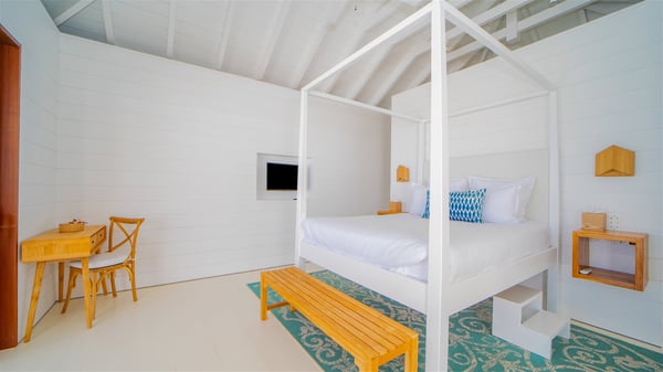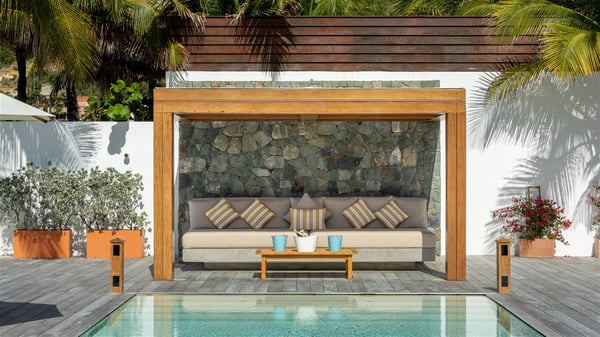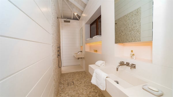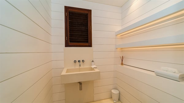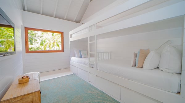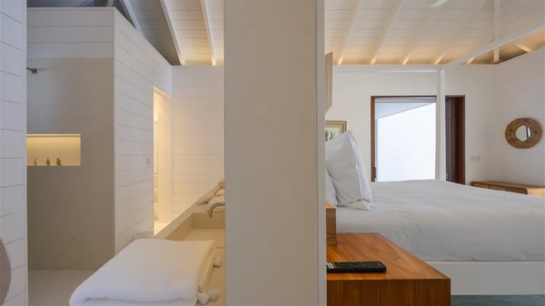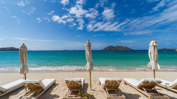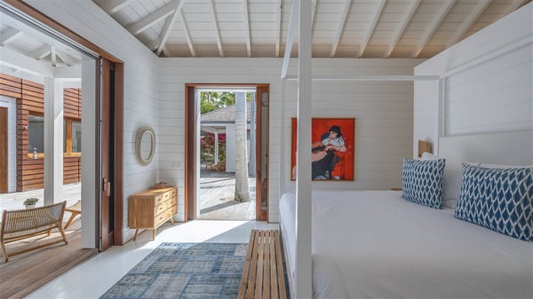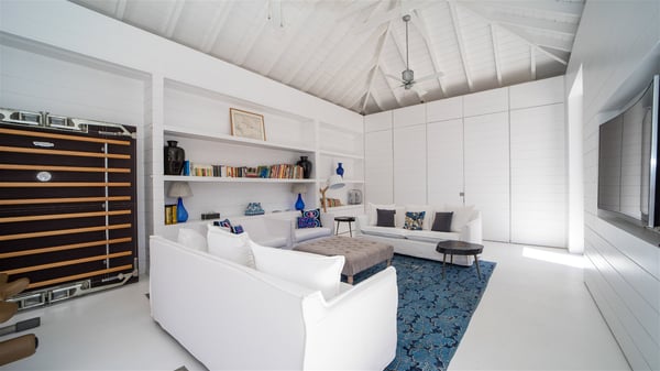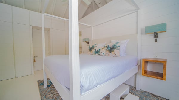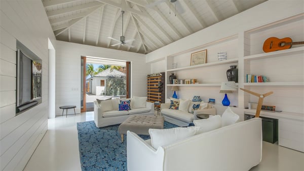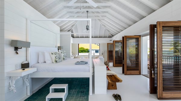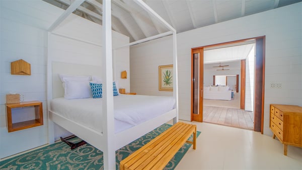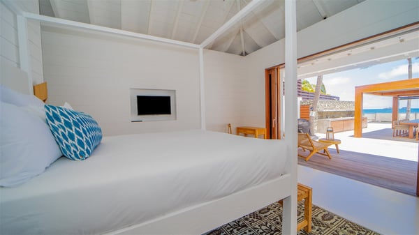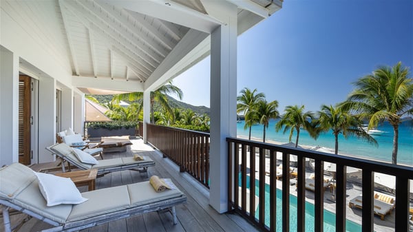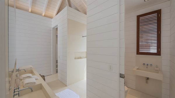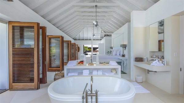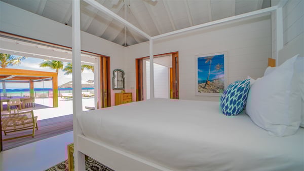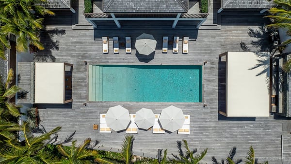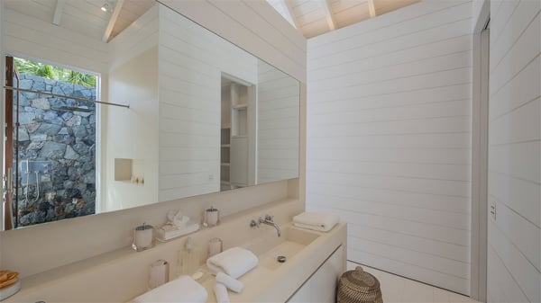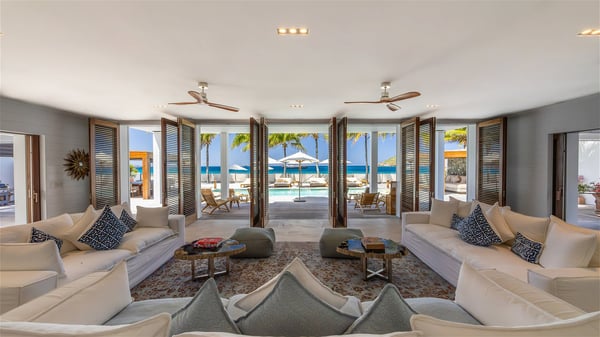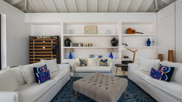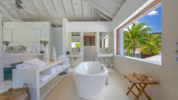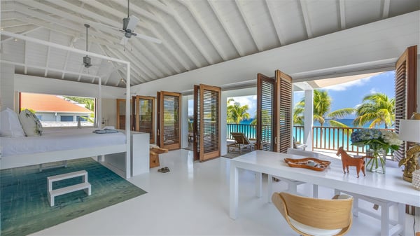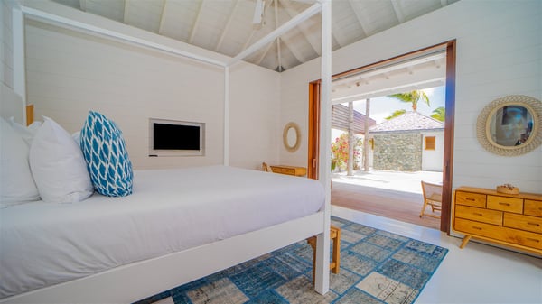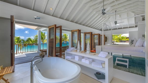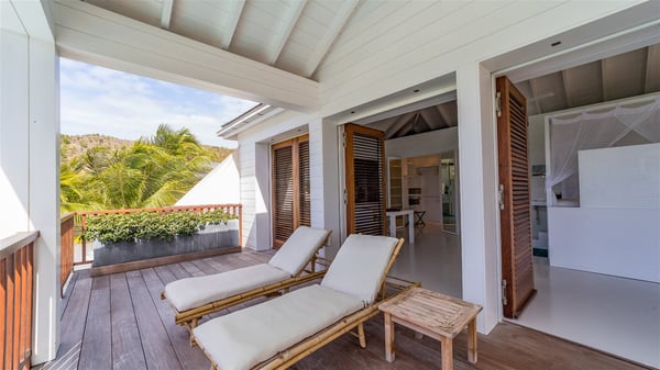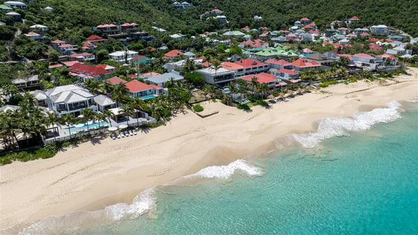With a large entrance opening onto a woody palm tree ground and a perfect lawn, the luxurious rental villa Sand Club is one of the most outstanding properties in St. Barths, and among the most impressive beachfront villas located on the Flamands Beach. This modern colonial-style mansion is a true treasure, an ode to dreams and relaxation. The villa Sand Club is built on several pavilions while the main house is built on two levels. The very contemporary living room features expansive sofas and armchairs with blue-sprinkled cushions: a perfect setup for spending delicious moments listening to the sound of the waves. In an oceanic atmosphere coming with white walls and a very refined decoration, while the shutters filter Saint-Barth’s light, all is quiet and soothing. The magnificent indoor dining room table made of white wood will be the perfect spot for your delicious gastronomic moments. At the back of the living room, the perfectly designed and equipped kitchen is a heaven place for preparing meals or calling upon a private chef. The view over the main alley planted with palm trees provides a great feeling of perfect space symmetry. In the bungalow at the back, a second modern living room is dedicated to entertainment for movie nights and relaxation. Facing the beach, the large terrace extends over a wooden deck with a superb long heated swimming pool surrounded by lounge chairs and umbrellas. There is also a day-bed with curtains whenever you wish to have a rest under the ajoupa. On the other side of the pool, a spacious gazebo is set up with a dining table for pleasant outdoor evenings. A private access leads you to the beach of Flamands from this exceptional terrace. The luxurious villa Sand Club has six large air-conditioned suites, furnished with king or queen-size beds, canopies, curtains and cushions, all in a cozy atmosphere. On the upper level of the villa, there is a master suite with a private balcony. Two bedrooms are located at the back of the storey, one of which can accommodate four children on bunk beds. Three other suites are located in independent bungalows and open directly onto the terrace, providing guests utmost privacy. A building located at the entrance of the villa has three bedrooms and a kitchenette, ideal for teenagers or staff.