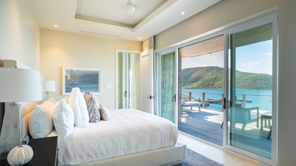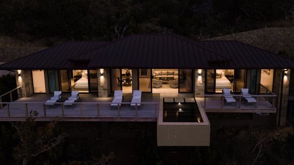 This contemporary BVI villa rental boasts sweeping views of Deep Bay, Eustatia Sound and Oil Nut Bay’s Marina. An open living concept is characterized by floor-to-ceiling glass doors that open onto a capacious deck and sparkling plunge pool. The great room and kitchen are flanked by twin master suites, each with their own luxurious bathroom. Luxury living with breathtaking views await!