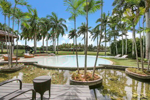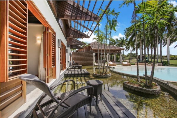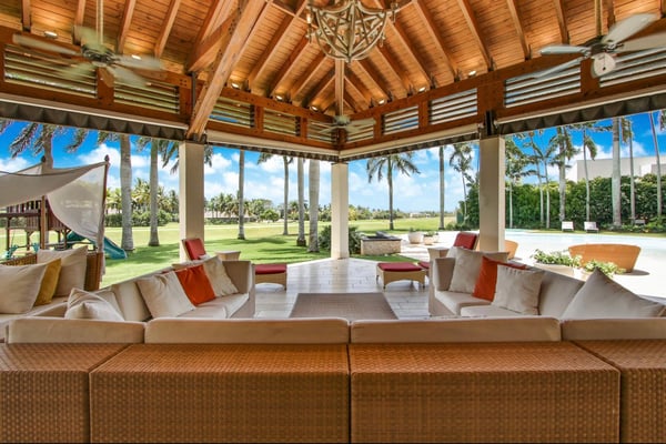All guests must register with the Casa de Campo Concierge office, and for a small daily fee ($30 per adult per night & $15 per child per night), are granted access to resort areas and amenities. Casa de Campo Resort facilities and amenities include golf courses ($), the fitness centre ($), racquet center ($), restaurants ($) and bars ($). Contact Rental Escapes for more information about pricing. Luxurious villa located in Casa de Campo walking distance to La Marina, near Altos de Chavon and minutes away from the many amenities that Casa de Campo has to offer. Located within Casa de Campo at the base of the 9th hole of the La Romana Country Club Golf course, offering beautiful views of the Caribbean Sea from an outdoor gazebo and its ample backyard with an infinite edge pool and jacuzzi. Enjoy warm ocean breezes and the luxury of a spacious vacation retreat conveniently located in the heart of Casa de Campo in the exclusive area of Las Palmas. This villa features an open floor plan and beautifully decorated with lots of comfortable furniture, marble floors and baths, double height ceilings. Eight air-conditioned rooms with en suite modern bathrooms and walk-in closets, flat screen TVs and Blu-Ray DVDs. An expansive climate-controlled family entertainment living room with TV/DVD/ Ipod dock radio, opens to a covered terrace overlooking the ocean and connects to the outer deck and pool. All living areas and master suites command sensational views of the golf course and the Caribbean Sea. Additional Movie room with 120” big-screen and projector for Blu-Ray DVDs and high fidelity surround system. Lots of fun for kids – swings, trampoline. Fully equipped granite kitchen with commercial restaurant appliances, interior formal air-conditioned dining room with seating for 16. Two additional service quarters bedrooms with a separate kitchen, baths and bunk beds are available for staff. Full-time housekeeper, cook and gardener.
