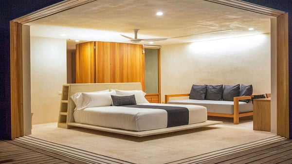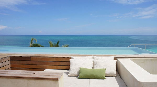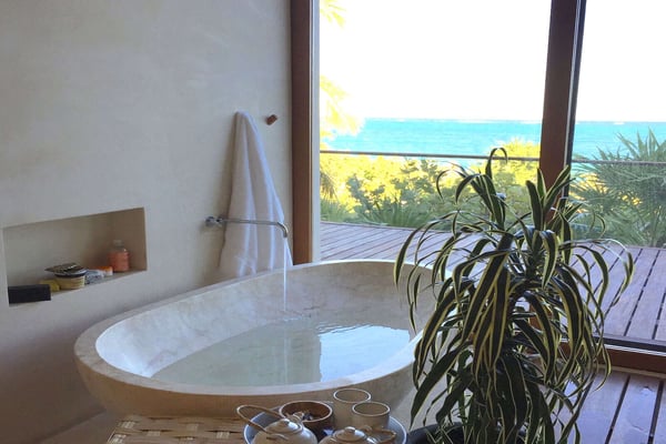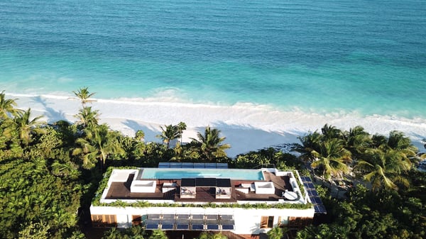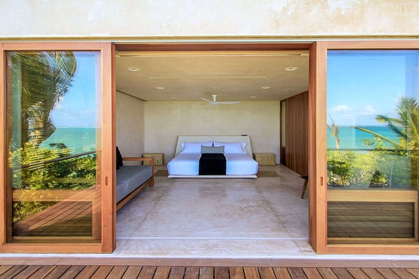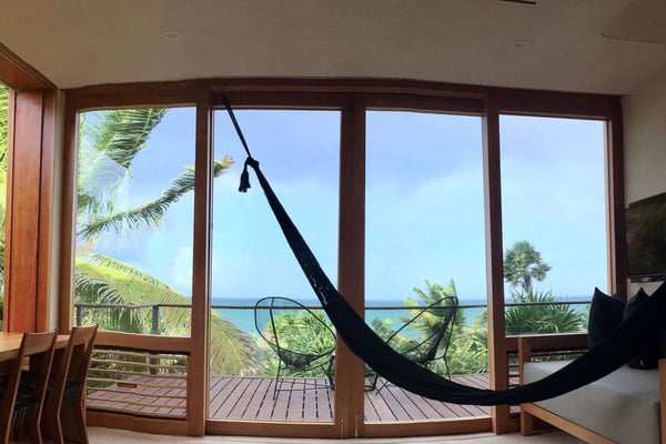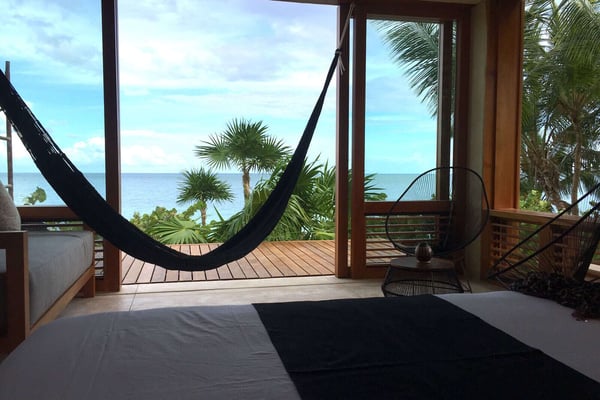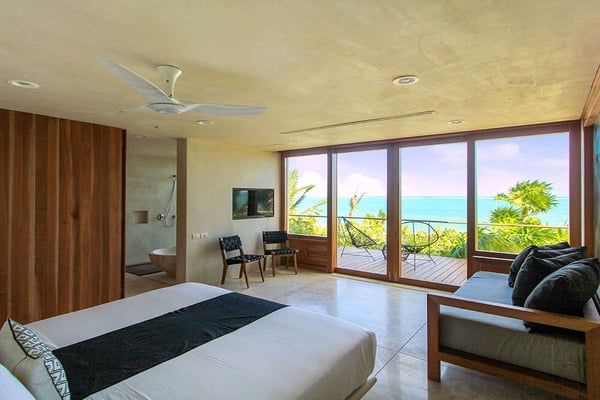 The roads in Sian Ka'an are unpaved and therefore distances and times may vary depending on the season and road quality and conditions. Villa Na'iik is simply stunning. In its privacy, originality, attention to detail and quality throughout, it is the epitome of luxury. And best of all, you will enjoy world-class full service in the middle of the jungle; your own hidden eco-sanctuary without a neighbor in sight. A leafy estate nestled between the Caribbean Sea and a Mayan lagoon where you can dream and play to your hear's content. With the warm wind in your hair and a cool drink in your hand, you will revel in the exclusive haven we've named Na'iik, the Mayan word for 'House of Air.' Plenty of spaces designed for you to play and dream. Seafront, you can relax and tan on the beach beds with a pina colada from our estate-grown coconuts, snorkel around the reef or paddle out on the kayak. Or, step a few feet from the water and you are in the dappled shade of the coco palm lounge, fitted with stylish loungers and handmade hammocks from nearby Merida. Your lunch can be served under the coco palms while you sit back and watch the osprey dive for their prey. Another day, you may choose to have your lunch on the rooftop, take in the 360-degree view, do some laps in the chlorine-free pool, hang out on the sunbeds and take a siesta. The rooftop is an idyllic spot for happy hour as you watch the sunset on the lagoon and the light bugs dance in the treetops. Inside, you can sit back and enjoy the home theatre, turn up the volume and boogie down on the coffee table or look up through the ceiling to see what's going on in the glass-bottomed pool. When it comes time to chill in one of the four master suites, you may want to lounge in the handmade stone tub while you sip champagne or refresh yourself in your leafy shower. From your king bed, you can watch HDTV, adjust your air conditioning and overhead fan or raise the blackout blinds. Each suite has its own extensive deck space with sea view where you can kick back in private. Lovers of ultimate privacy and pampering, contemporary design, slick architecture and gourmet food will find it all in the high standards at Na’iik. Please note, due to Sian Ka’an being a protected reserve, it is not permitted to bring external ATVs, water sports equipment such as kiteboards, or audio equipment. It is also forbidden to fish, in order to protect the endangered sea life. Additionally, pets are not allowed.