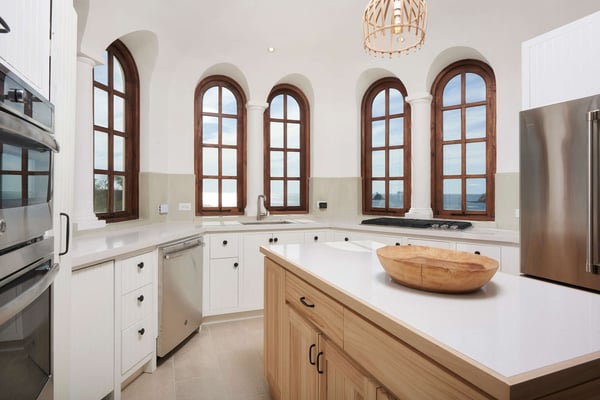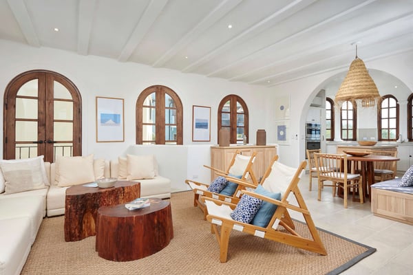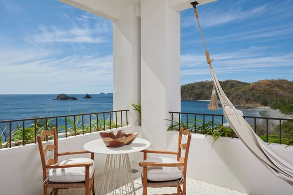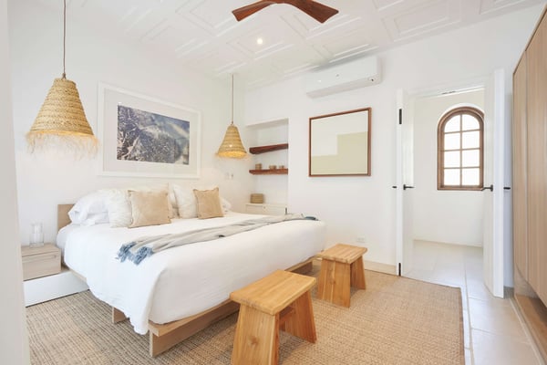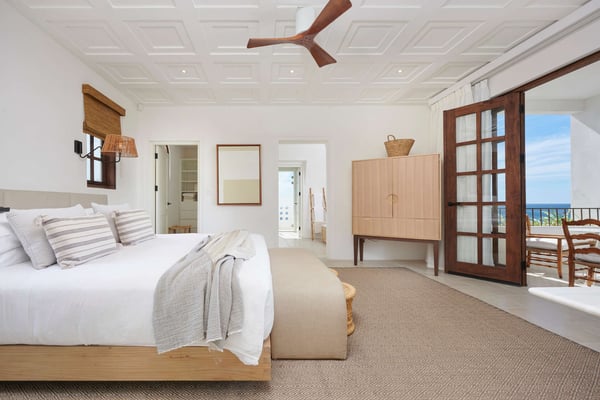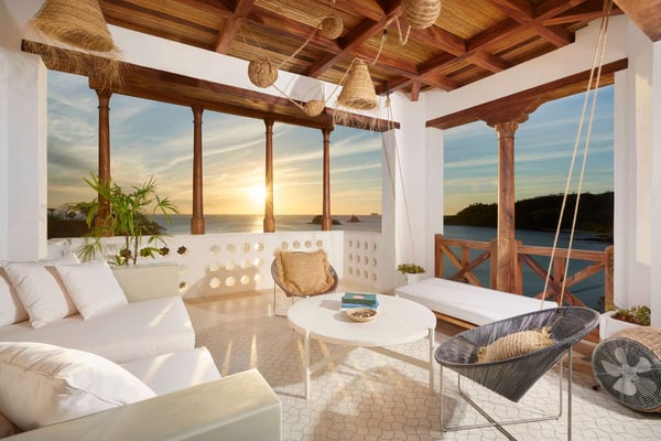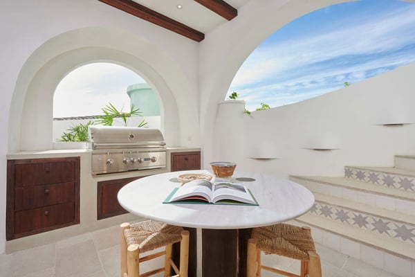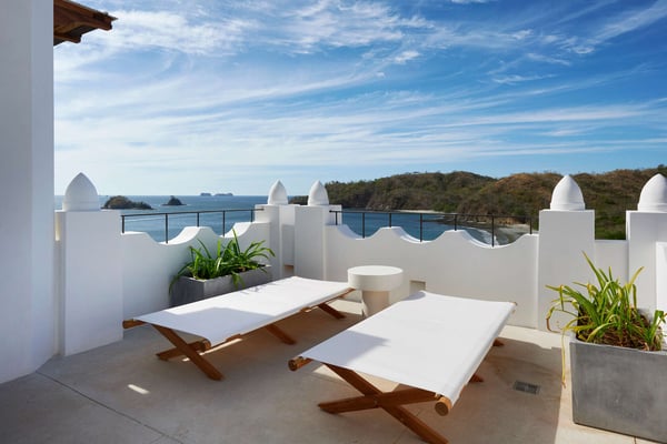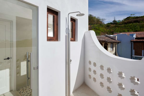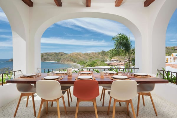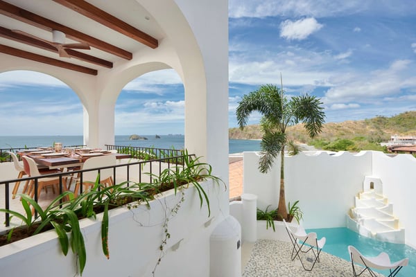 Perched atop the hillside street of Calle Virginia in Las Catalinas, Casa Encantada's large rooftop terrace opens up to expansive ocean views of the sunset and the Catalina Islands, where an outdoor grilling area and large rustic dining table is set up to host meals together. Panoramic ocean views continue back inside on the top floor, with windows bathing the open concept living room and full chef's kitchen in golden natural light. The downstairs leads to the den, another patio with it's own plunge pool, and an additional grilling area for outdoor cooking. The house is large enough to sleep multiple families at once while still providing privacy, with four separate bedrooms, each with its own ensuite bathroom. To ensure a care-free vacation, a dedicated Housemom will manage all the tasks, preparing breakfast and light snacks with guests ingredients, and coordinating housekeeping while you are out enjoying sunset barbecues on Playa Danta, wine tastings in the Cava at Copper and Stone, guided mountain biking trips on the trails, or diving off the Catalina Islands.