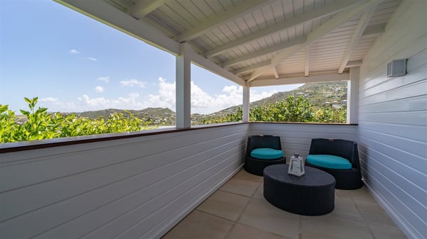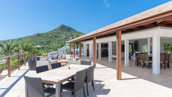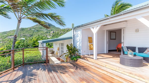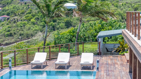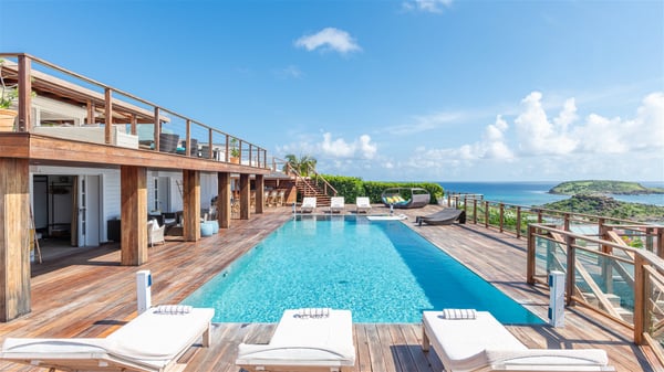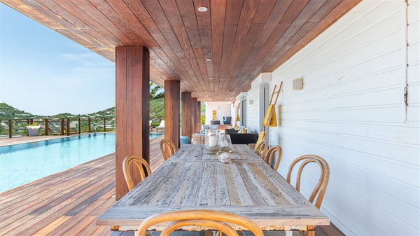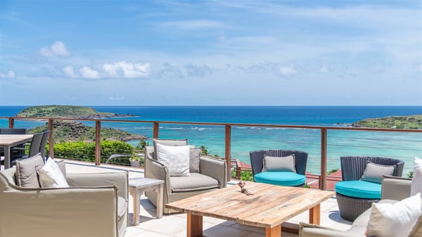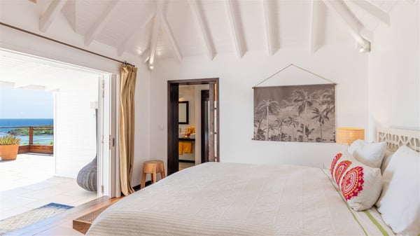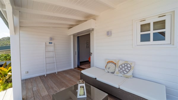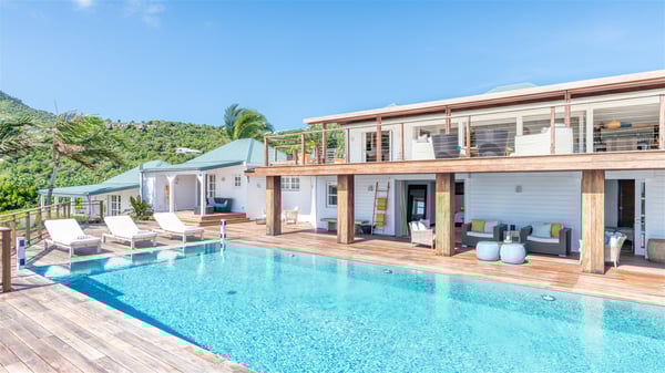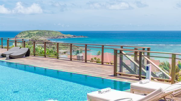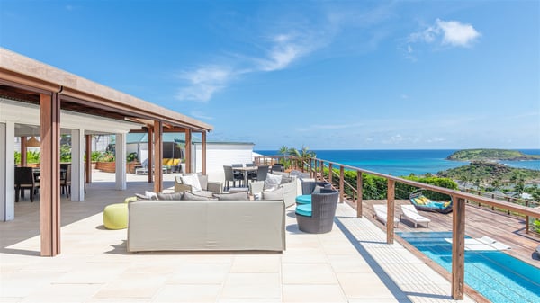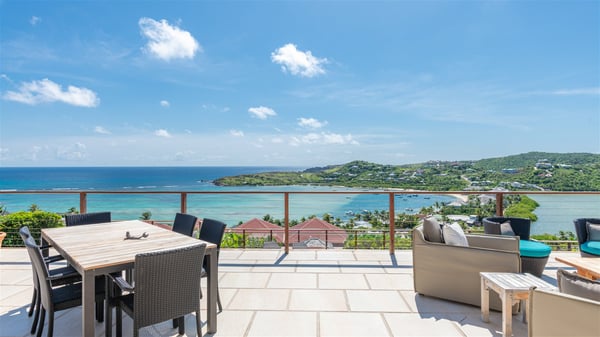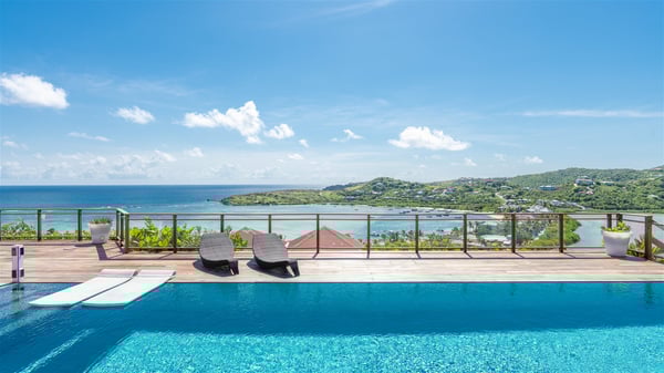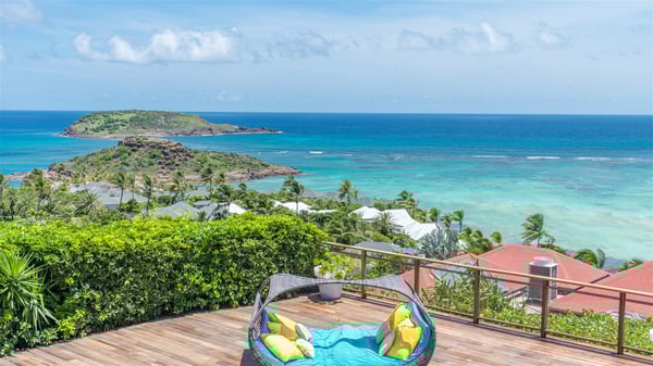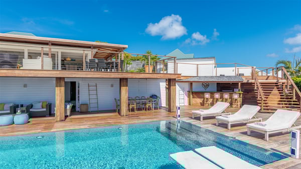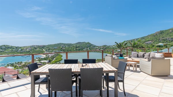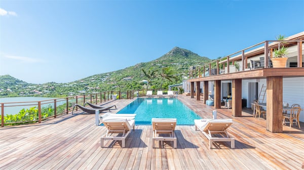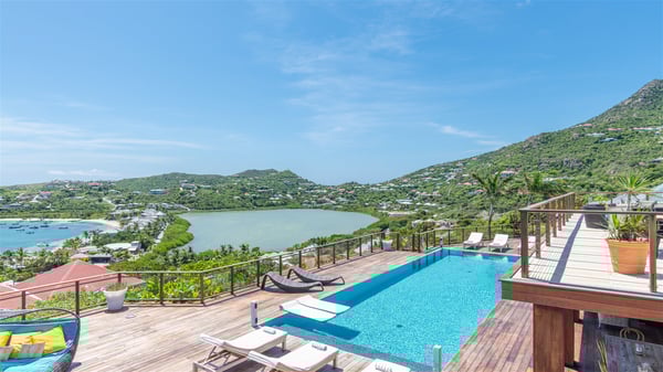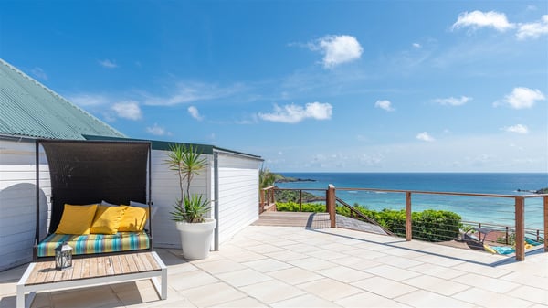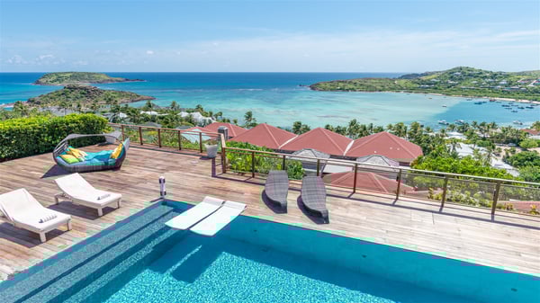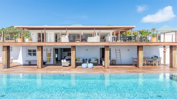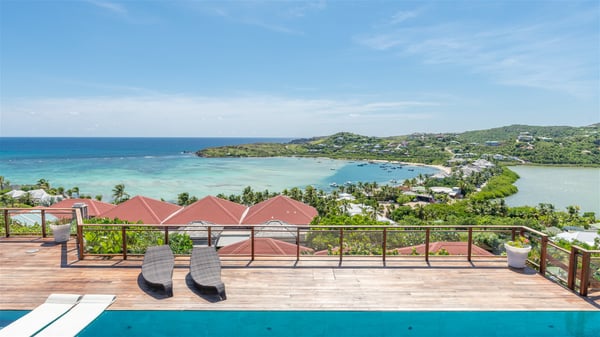 This rental villa in St. Barths Nala is a beautiful property nestled on a hill above Grand-Cul-de-Sac. This five-bedroom vacation rental is located only a few steps from the beach and water activities, a perfect place for a large family or group of friends vacationing together in Saint-Barts. Built-in a Caribbean style and facing the panoramic view over the clear-crystal lagoon of Grand-Cul-De-Sac, vacation home NALA was recently renovated by its new owners. Large living spaces and terraces surrounding the two levels of the villa make it a most luxurious place for a Caribbean vacation. There is a large open living room and an air-conditioned lounge area furnished with a comfortable white sofa, a wooden coffee table and an HDTV for pleasant movie nights. The high white vaulted ceiling provides a nice sense of volume and creates a very welcoming atmosphere. The well-equipped kitchen is modern and functional for delicious meals preparation and features a breakfast bar. The indoor dining room can accommodate up to eight guests and opens onto the breathtaking view over the crystal-clear waters of the lagoon unless you wish to dine alfresco around the two outdoor dining areas. On the front terrace, you will be stunned by the fantastic view over the bay. The beautiful swimming pool is surrounded by a large lounge and sun decks, perfect for sunbathing sessions. In addition to the outdoor dining areas, there is also a bar whenever you wish to have a drink. This is the very right place to sip a cocktail under the stars and relax in an enchanting environment. Consisting of five air-conditioned rooms, the rental villa in St. Barths NALA welcomes large groups and families. All rooms feature king size beds and en-suite bathrooms. They are very spacious and come with sitting areas or access to the villa's terraces. In a refined and warm décor, the five bedrooms are a true haven of peace that you’ll enjoy every evening after days exploring Saint-Bart’s.