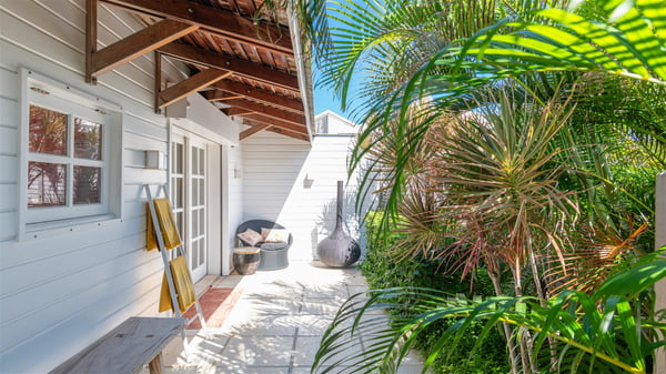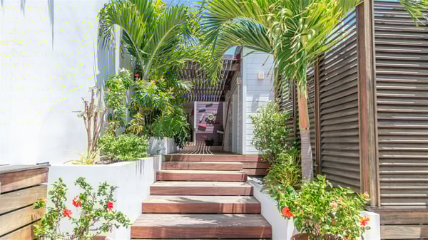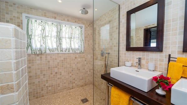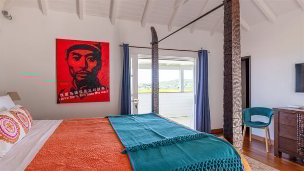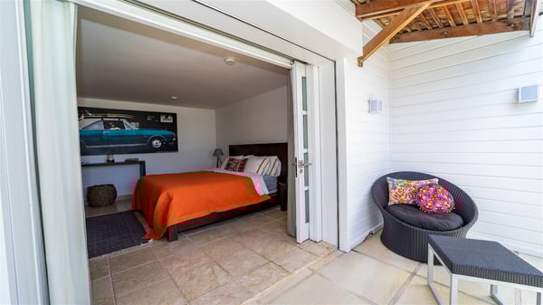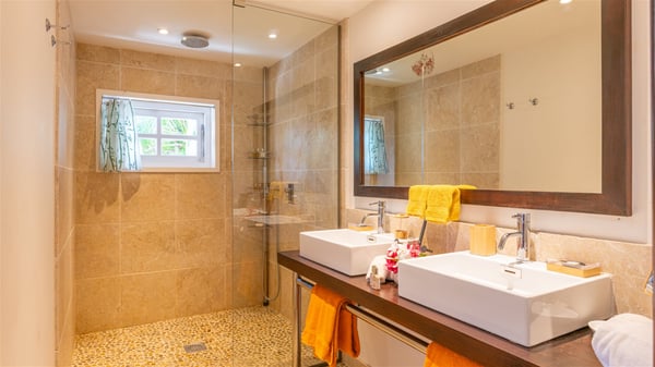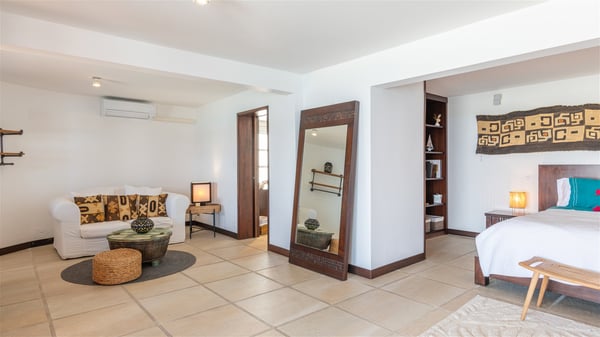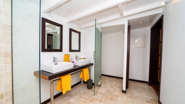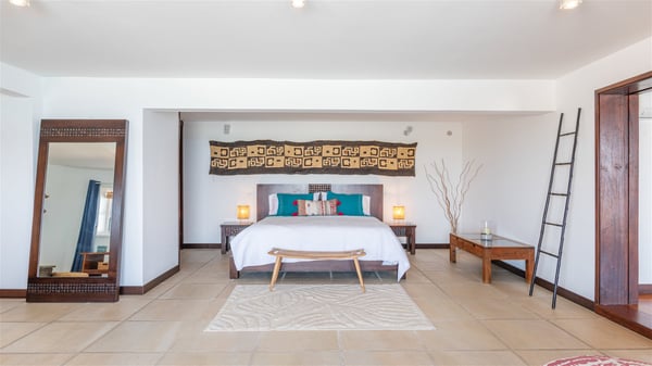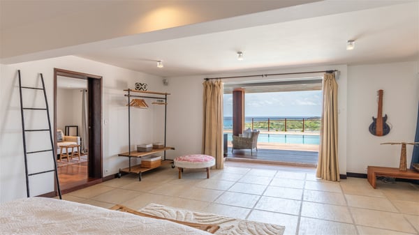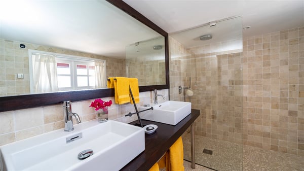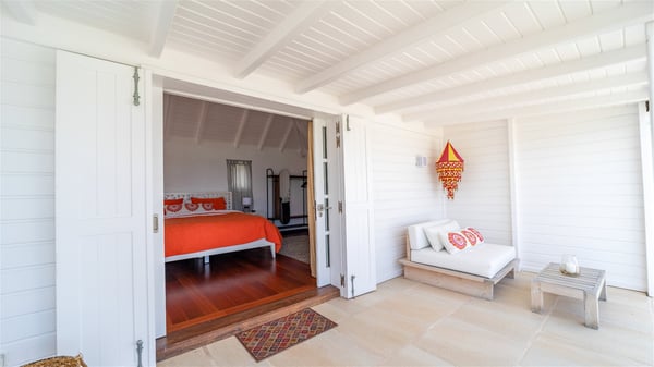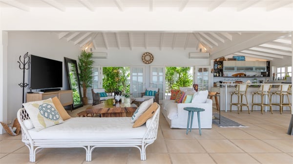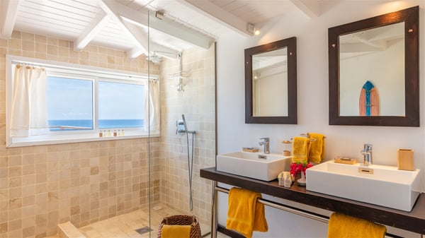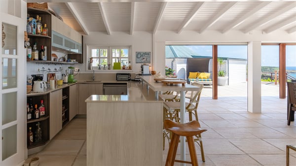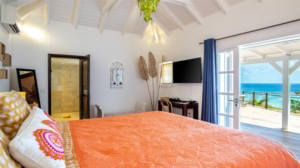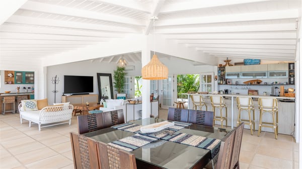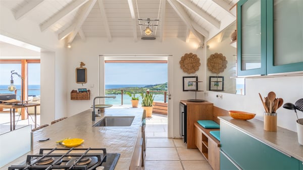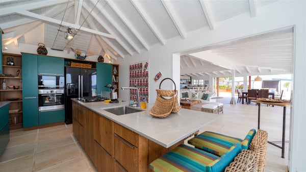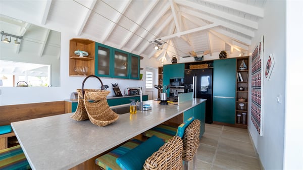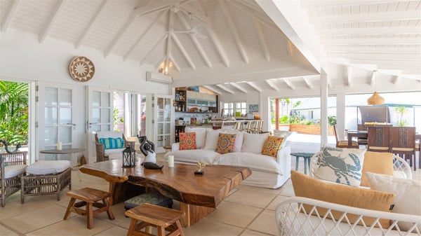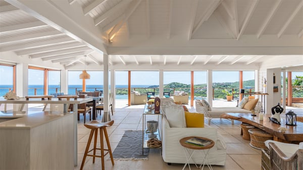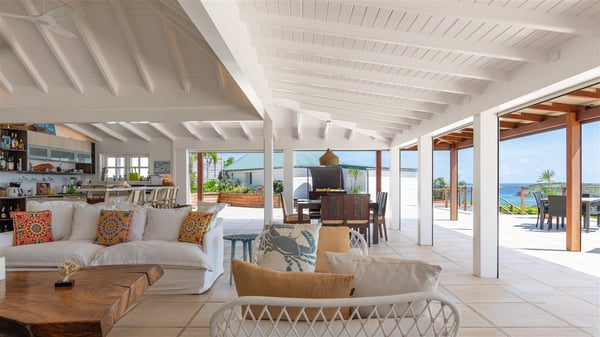 This rental villa in St. Barths Nala is a beautiful property nestled on a hill above Grand-Cul-de-Sac. This five-bedroom vacation rental is located only a few steps from the beach and water activities, a perfect place for a large family or group of friends vacationing together in Saint-Barts. Built-in a Caribbean style and facing the panoramic view over the clear-crystal lagoon of Grand-Cul-De-Sac, vacation home NALA was recently renovated by its new owners. Large living spaces and terraces surrounding the two levels of the villa make it a most luxurious place for a Caribbean vacation. There is a large open living room and an air-conditioned lounge area furnished with a comfortable white sofa, a wooden coffee table and an HDTV for pleasant movie nights. The high white vaulted ceiling provides a nice sense of volume and creates a very welcoming atmosphere. The well-equipped kitchen is modern and functional for delicious meals preparation and features a breakfast bar. The indoor dining room can accommodate up to eight guests and opens onto the breathtaking view over the crystal-clear waters of the lagoon unless you wish to dine alfresco around the two outdoor dining areas. On the front terrace, you will be stunned by the fantastic view over the bay. The beautiful swimming pool is surrounded by a large lounge and sun decks, perfect for sunbathing sessions. In addition to the outdoor dining areas, there is also a bar whenever you wish to have a drink. This is the very right place to sip a cocktail under the stars and relax in an enchanting environment. Consisting of five air-conditioned rooms, the rental villa in St. Barths NALA welcomes large groups and families. All rooms feature king size beds and en-suite bathrooms. They are very spacious and come with sitting areas or access to the villa's terraces. In a refined and warm décor, the five bedrooms are a true haven of peace that you’ll enjoy every evening after days exploring Saint-Bart’s.