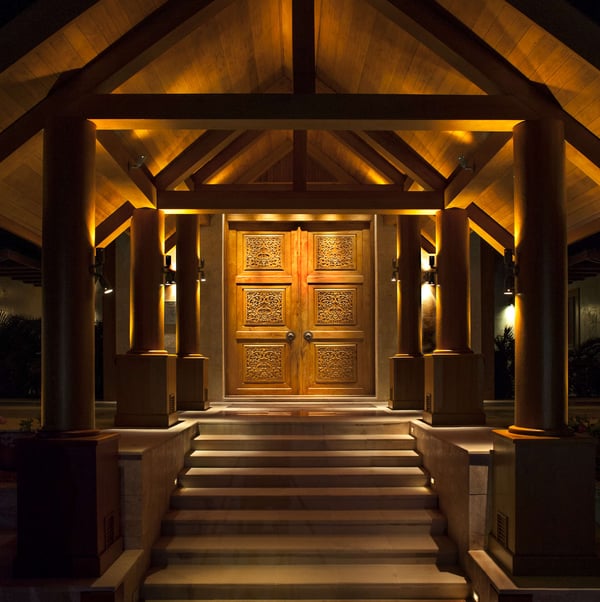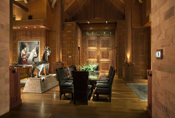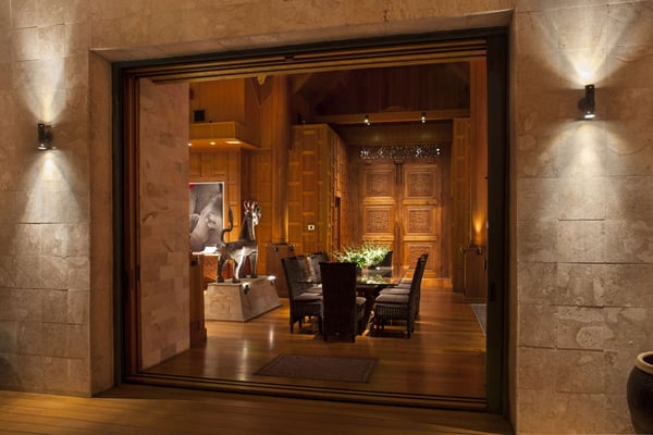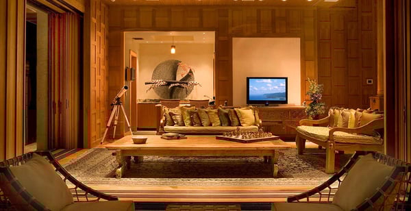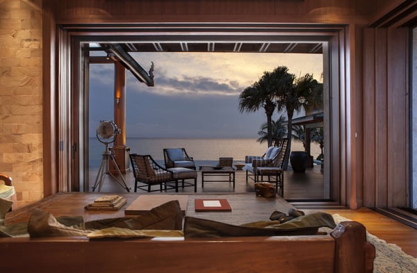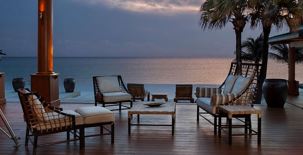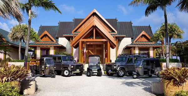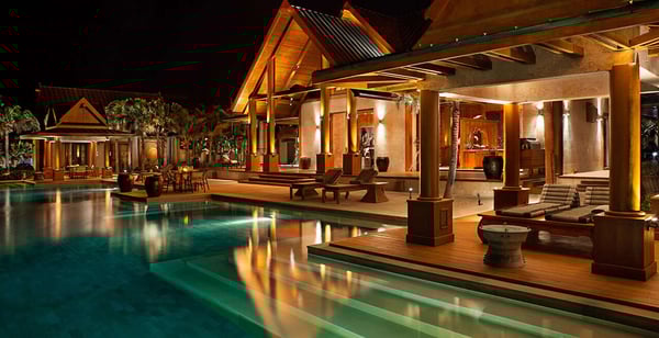 “Nandana” (which means Paradise in the ancient tongue of Sanskrit) is a large luxury estate on a secluded beach near West End, Grand Bahama. Our luxurious and exceedingly private villa compound is a fully staffed island home specifically created for intimate gatherings of up to twelve family members or friends. Nandana goes beyond the traditional villa vacation by providing guests with a wide range of luxury resort services, amenities, and activities. These include gourmet cuisine, on-site masseuse and full spa services, 120′ infinity pool, a Jacuzzi, Jet Skis, ATVs, a nearby golf course, beach volleyball, and more. Designed by a renowned architectural firm in an Asian beach house style, the property is comprised of six separate buildings. A spectacular main house with soaring 40′ ceilings is surrounded by five richly appointed and free-standing bedroom suites. The interior of the property has been constructed entirely of natural materials, with massive amounts of imported Burmese teak covering the floors, walls, and ceilings and natural stone forming most other surfaces. A professionally designed lighting system has been installed to emphasize the property’s many distinctive architectural features.