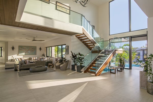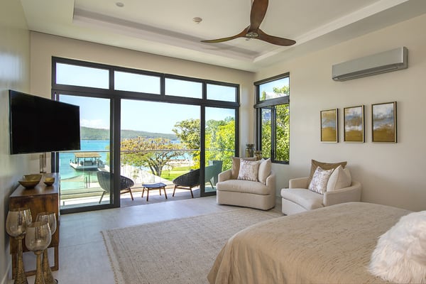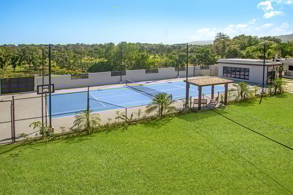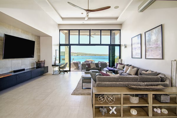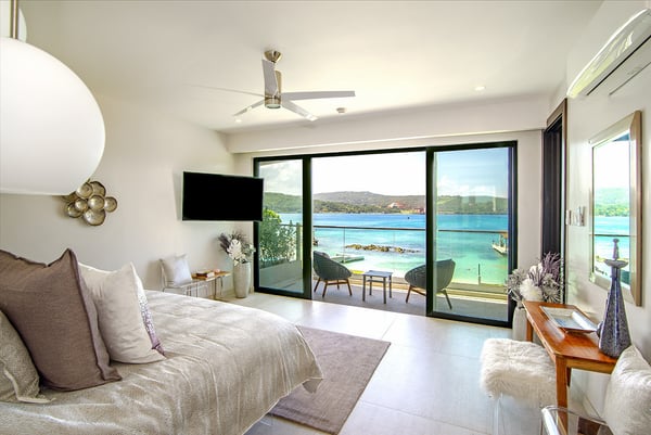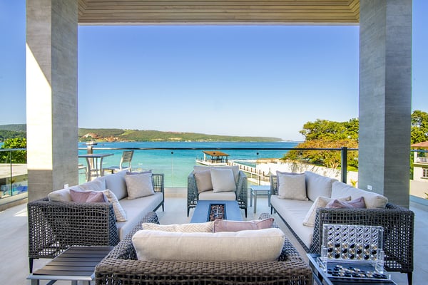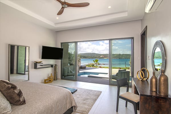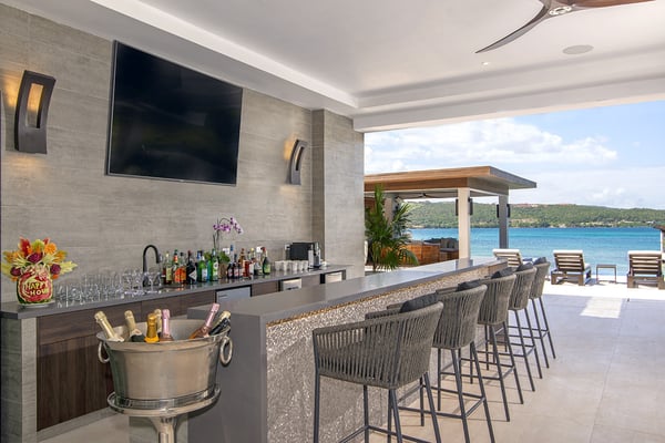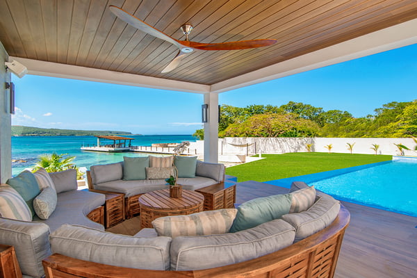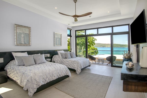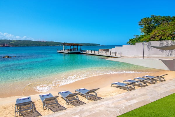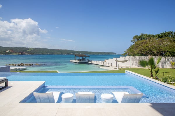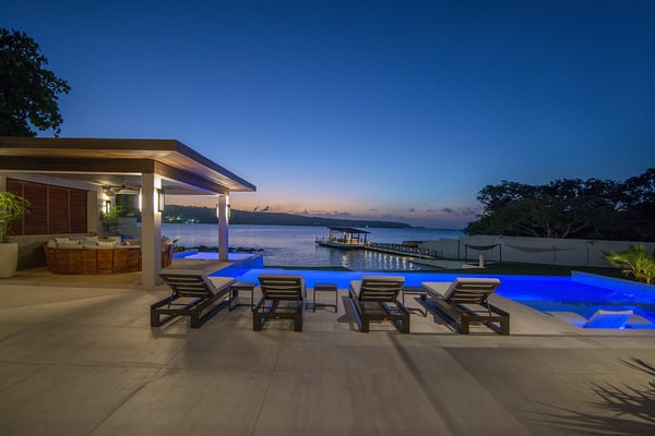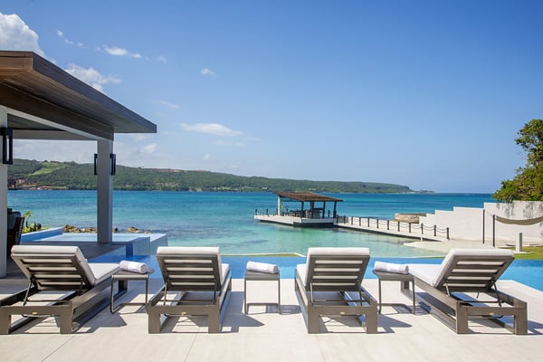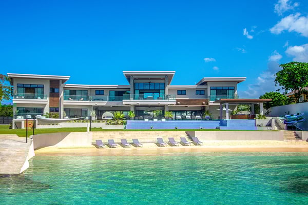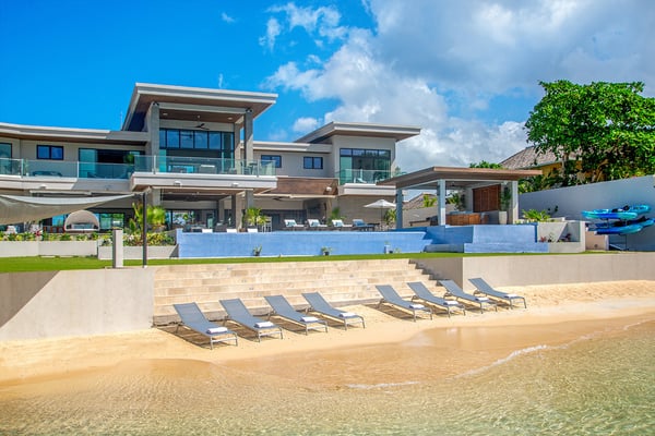 Happy Hour is truly an exquisite new home, decorated in contemporary muted tones throughout, and comfort abounds. Located in the gated community of Fortlands Road in Discovery Bay, where villas have private sandy waterfronts with calm iridescent blue swimming areas and the bay beyond, which offers the best snorkeling, kayaking or paddle boarding. On arrival through the oversized bespoke Jamaican made door, surrounded by crystal clear pools and fountains, you find yourself in a double-height entrance hall, welcoming you into the main indoor outdoor living areas and the beach and bay beyond. The formal dining area on the left is curtained by a wall of windows, allowing the sounds of the fountains to murmur through the villa. On the right is the comfortable sitting room, furnished with soft, deep leather sofas - both areas capture the Tradewinds breeze, keeping the villa cool at all times. Walk directly through one of three, 25-foot doors onto the outdoor covered terrace, offering more dining and seating and a large bar, with an 86" TV for watching your favourite games and a JUTA D6 cappuccino/espresso station. Indoor outdoor living at its best. The covered terrace leads to the infinity pool, outdoor kitchen, more dining options for casual lunches or afternoon snacks, a gazebo overlooking the pool, a hot tub, and a grassy lawn that borders the 150-foot beach below, accessed by a 30-foot-wide set of steps. On the ground floor, there is a professional kitchen, where the Chef and Pastry Chef prepare the most incredible meals for you. The ground floor also offers two bedrooms, including one of the primary bedroom suites and the steam and sauna room. Both of these bedrooms have an overwater private terrace that can be accessed from the main outdoor living areas. The upper level has five bedrooms, including the second primary bedroom suite, two king bedrooms, one bedroom with two queen beds, all with ocean views and private balconies. The fifth bedroom has three queen beds and faces the gardens and tennis court. On this upper level, you will also find a massage/spa room with a garden-facing balcony, a super sumptuous media room with a 96" TV and its own entertaining balcony, a JUTA D6 cappuccino/espresso station, and a games room with a pool table, arcade basketball, Pacman, and a foosball table. All bedrooms have walk-in closets, modern bathrooms with walk-in showers. Some bedrooms also have soaking tubs. The beautiful artwork throughout the villa, many by renowned Jamaican artists, is stunning and complementary. Walk down the seaside jetty to a covered oceanside gazebo with comfortable seating, a bar, and a sundeck for sundowners or a shady place for an afternoon snooze. The front of the Villa is home to a full tennis court/pickle ball court - lit for night-time play, a fully equipped air-conditioned gym, and a large lawn for games.