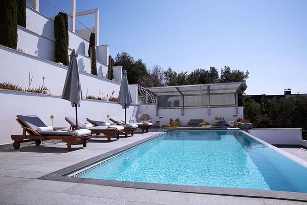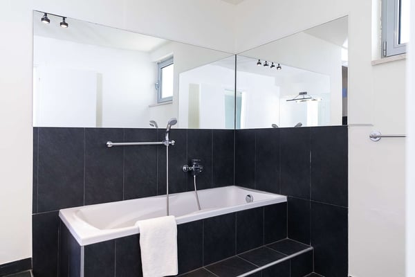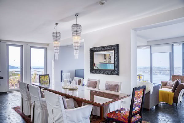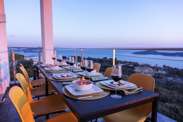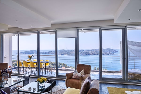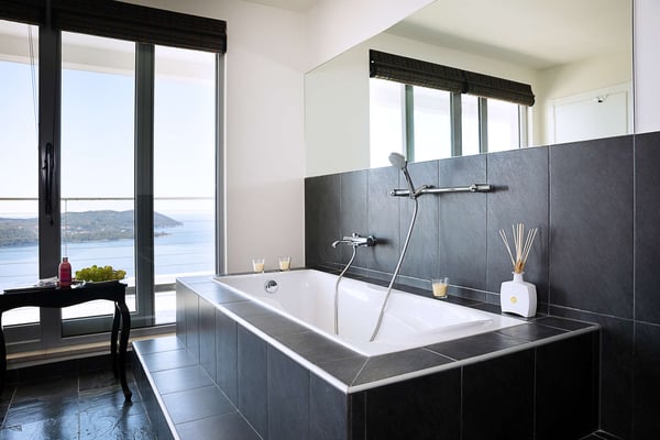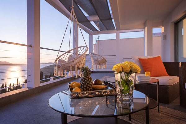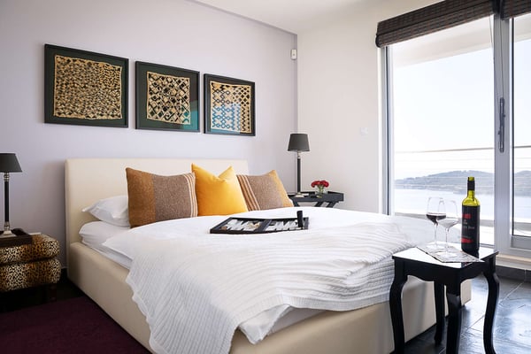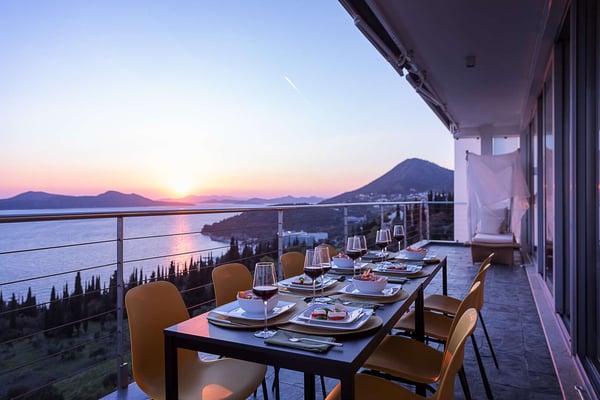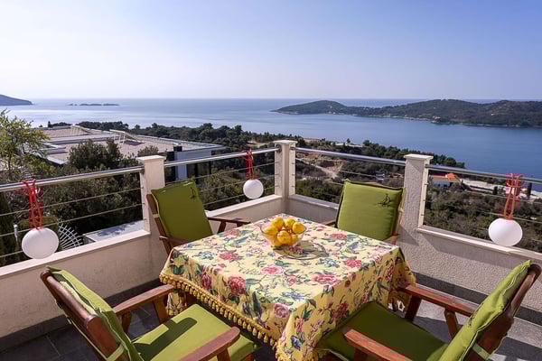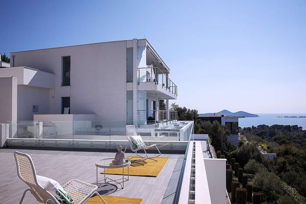 This elegantly designed, spacious villa, arranged over three floors is located in the small town of Orasac, just a few kilometres outside of the historical town of Dubrovnik. As Villa Cypress Hill is situated on a hillside, from each room and from the large terrace there are great views of the surrounding bay and coastline. If you like staying in a truly modern and luxurious villa with an unforgettable view of the sea, this is the right villa for you. Sleek and simple architectural lines of the villa and understated modern interior design, combined with comfort and luxury, define Villa Cypress Hill. It is in a fabulous location, 1km from the beach. The accommodation is on three floors, and the living area is on the top floor to maximize the view. As the villa is built on a slope, it is entered from the garden on the roadside, into the top floor info the sitting room, whilst bedrooms are on lower floors. However, these floors are also raised, since they cascade down a slope and face the sea. The open-plan modern living space is unified by its elegant dark granite floor tiles and white walls. One whole wall is made of large glass panes which enable the view of a great expanse of the sea. They can also open, and the outside terrace becomes part of the living room. There are many comfortable leather sofas and armchairs to sit, relax and enjoy the view. The next area is a modern kitchen with all the necessary appliances and a dining area. The first floor of Villa Cypress Hill consists of two modern double bedrooms; one bedroom has an en-suite bathroom with a bathtub, and the other bathroom has a bathtub and a shower as well. Both rooms share the terrace with outdoor furniture and a magnificent view. On the ground floor of the villa, which is connected with outdoor stairs, there are two modern double bedrooms with tastefully decorated private bathrooms. Each bedroom has a sea view and a shared terrace with top-of-the-range outdoor furniture. The garden is laid to terraces and planted with many Mediterranean plants and infused with a scent of rosemary and lavender. Parts of the garden are covered with beach pebbles, giving it a smart, but natural look. On the ground floor is a separate garden with an impressive infinity pool merging with the view of the sea. The sunbathing area is provided with sunbeds, sun umbrellas and pool towels.