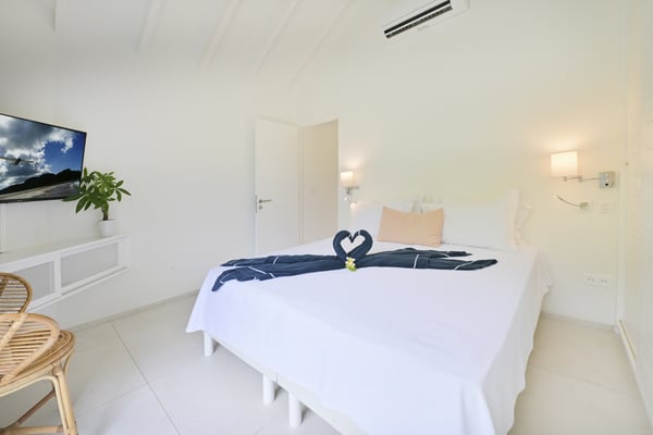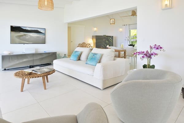 Marris is situated on the hillside of Lurin. This villa offers an extraordinary panoramic view on St Jean’s bay. The outside area is very pleasant and comfortable. A covered terrace overlooking the sea. A gazebo, with an outside living area, where you will enjoy taking the time for an aperitif and a dining area, where you will share your dinners with family or friends. A large garden which a part of it, is an artificial beach with sun beds that leads to an incredible point of view. Marris has three bedrooms. Two of them are accessible by the living room. One has a view on the ocean and the other has a private terrace. The third bedroom is on the lower level and is accessible by the terrace. It overlooks the ocean and the garden. Within just five minutes by car to Gustavia and its shops, you will appreciate the calm of this villa located at the end of a long private path.