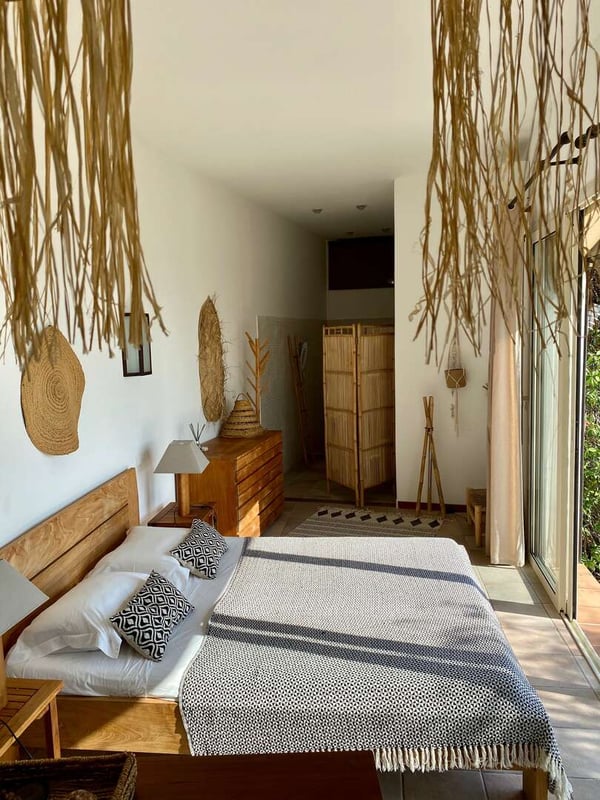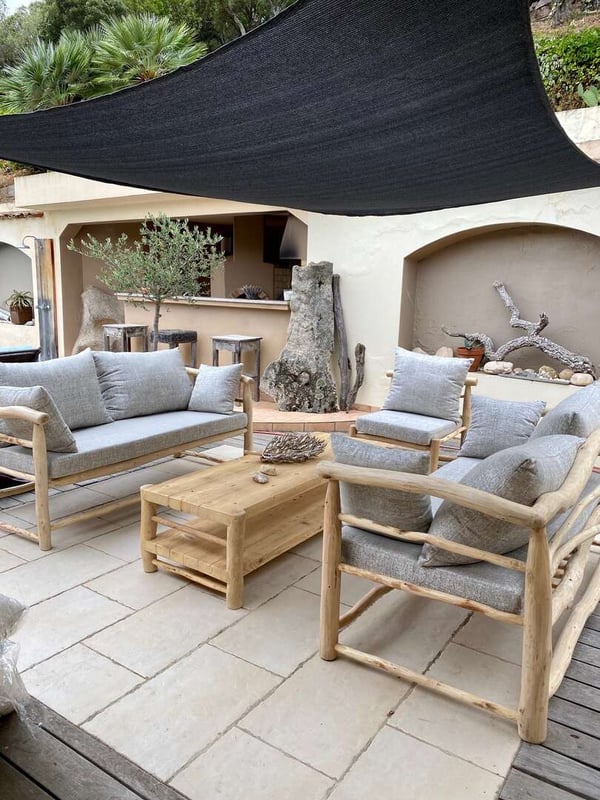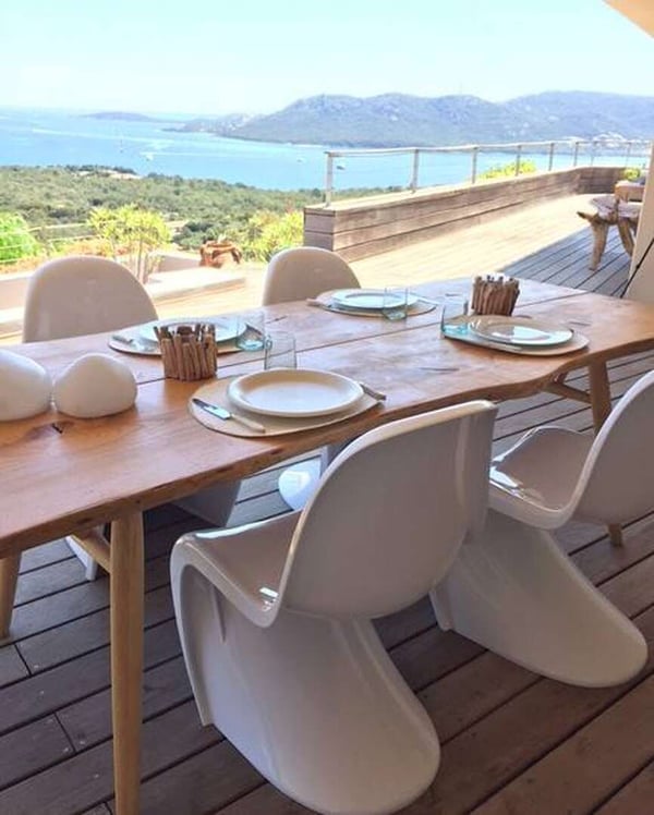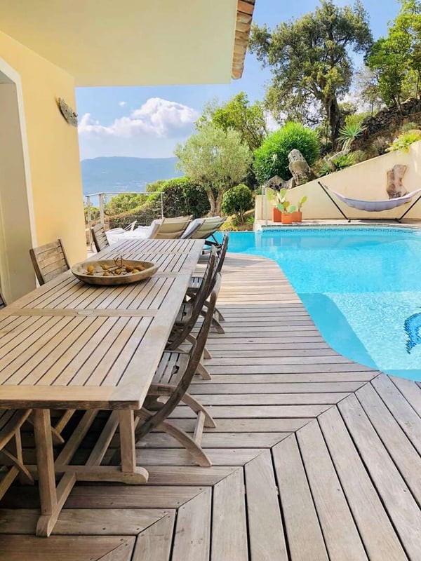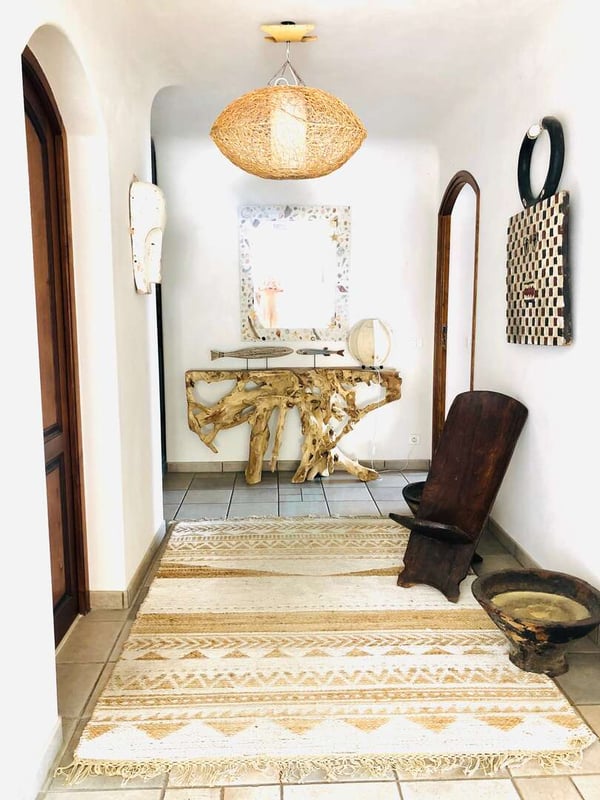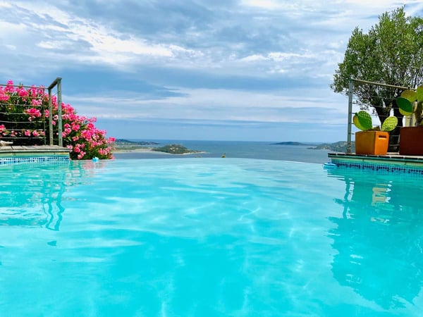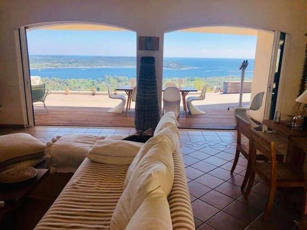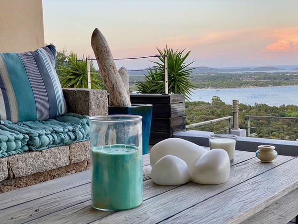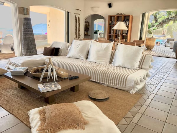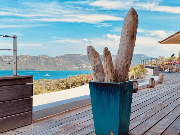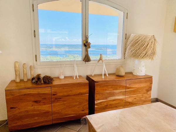 Located 10 minutes from the Port of Porto-Vecchio, Villa Carole makes one with the Corsican maquis. Its interior, decorated with exotic wood, light linen, baskets filled with driftwood and shells, and featuring a fireplace, gives this five-bedroom and five-bathroom villa a subtle bohemian atmosphere and creates a warm, cozy, and welcoming environment. Bifold glass Windows seamlessly connect the sun-drenched living room with the outdoor wooden terraces and the magnificent views over the Mediterranean Sea and the surrounding hills. In addition, a sublime infinity swimming pool, which seems to continue to the sea, and might become your favourite spot for aperitifs, while admiring the ballet of the sailing boats that come and go in the bay of Porto-Vecchio.