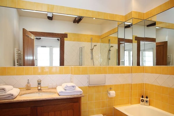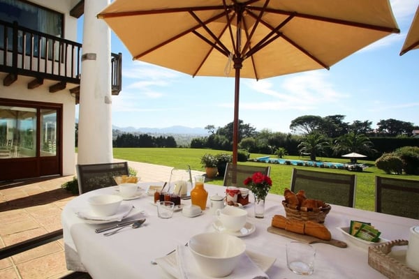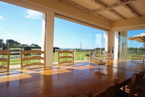 Villa Oceane is a beautifully designed traditional Basque farmhouse offering spacious and comfortable accommodations for up to 15 guests across eight uniquely styled bedrooms, each with ensuite facilities. The 500m² interior features air conditioning throughout, a large dining room, and a bright, airy living room with French doors that open onto terraces with stunning panoramic views of the Pyrenees and the Atlantic Ocean, just 500 meters away. The villa also includes a wine cellar, where guests can purchase a selection of fine wines. Set on a private 3-acre estate, the outdoor spaces are equally impressive, with a large heated swimming pool, expansive lawns, and terraces offering sea views. Guests can enjoy alfresco dining prepared in the outdoor kitchen with BBQ and plancha. Recreational amenities include mountain bikes, petanque, table tennis, badminton, croquet, football, volleyball, and frisbee. The property is secured by electric gates, ensuring privacy and peace for your stay.