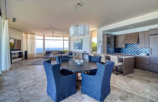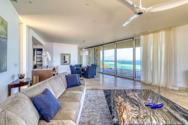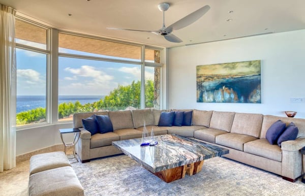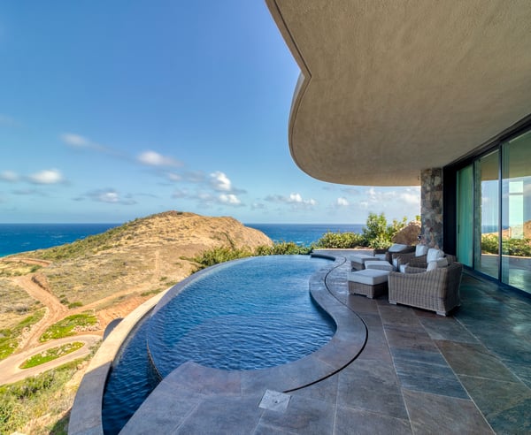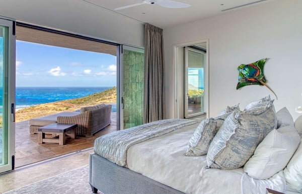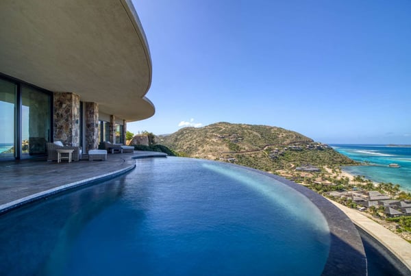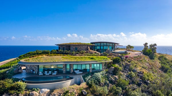 Perched atop a 1.2-acre hilltop in the Atlantic Ridge neighborhood of Oil Nut Bay, Rainbow offers a truly luxurious vacation villa experience. This stunning property features a private infinity pool and a spacious deck with breathtaking views of the peninsula and ocean. With a fully equipped kitchen, including a walk-in pantry, and a luxurious living room, Rainbow offers the perfect blend of comfort and style. The king-size primary suite boasts a walk-in closet, while the outdoor shower and decadent soaking tub add a touch of indulgence. The villa’s artfully designed green roof seamlessly integrates it into the surrounding topography.