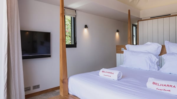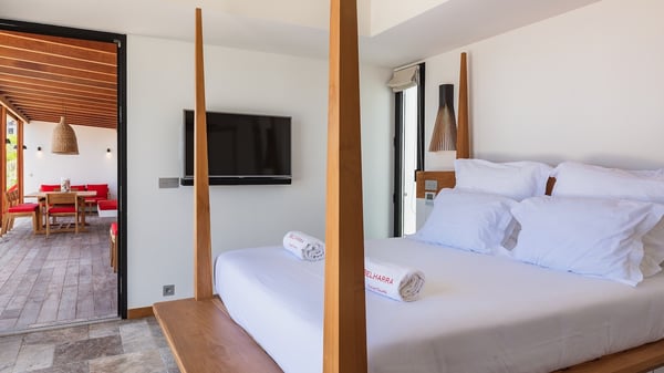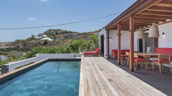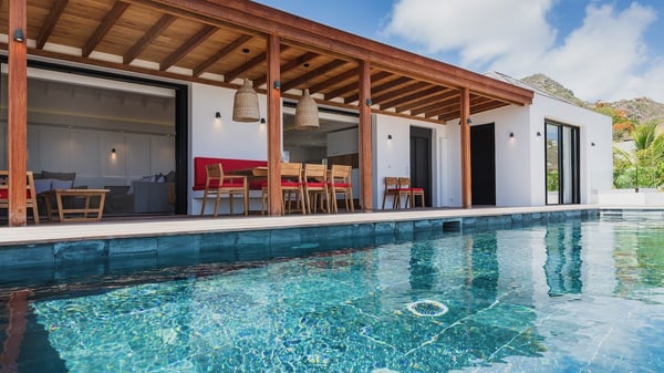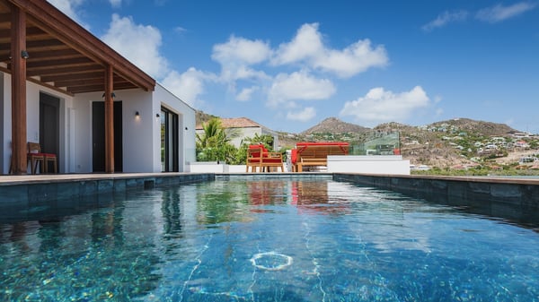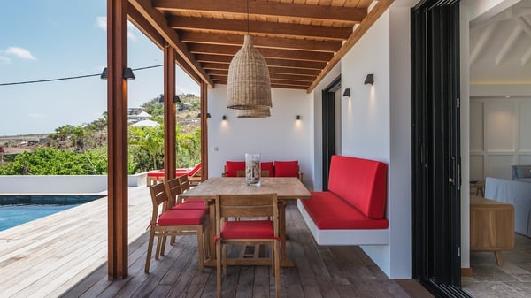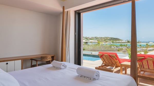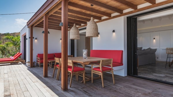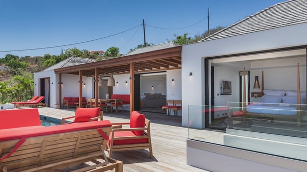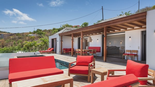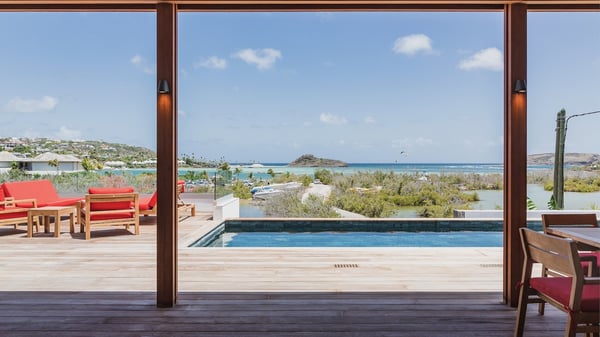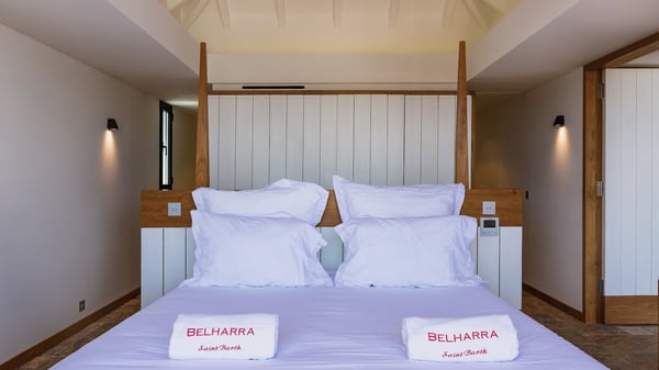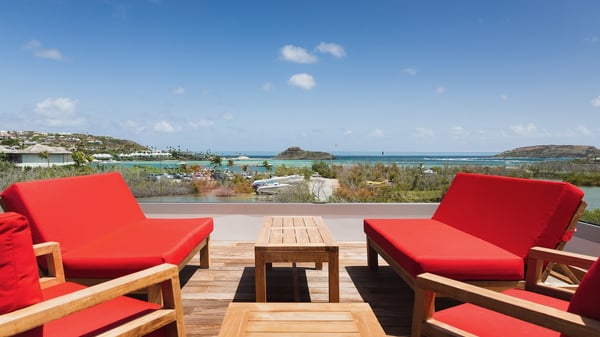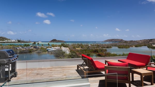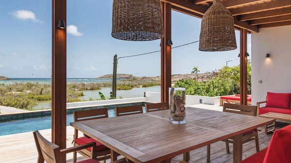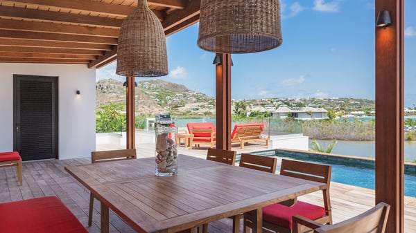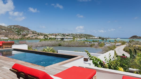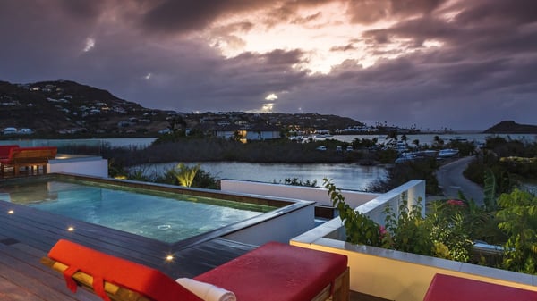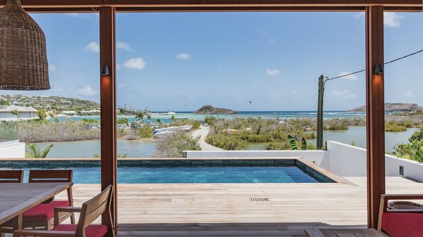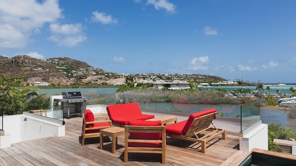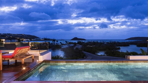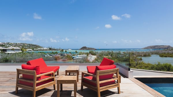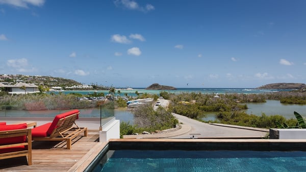The luxury vacation rental Belharra Lagoon is located in Grand-Cul-de-Sac close to the pond and the lagoon. Coming with upscale services, this beautiful villa opens onto an amazing view over the bay, a true dream place for your next stay in St. Barths. In this luxury vacation home, the minimalist and sleek decoration creates a delightful and serene atmosphere. The large air-conditioned living room opens onto the terrace and welcomes guests with comfortable gray and white sofas, coming with a few wicker touches. You’ll enjoy relaxing in this peaceful living space featuring a big screen perfect for movie nights. The kitchen is very well equipped with a central island and a large white marble table, which can accommodate up to ten guests; an outdoor gas barbecue is also at your disposal for grilling. This bright and stylish living room opens onto an outstanding view over the lagoon of Grand Cul de Sac and Tortue Island, an idyllic scenery for a dream vacation. Whenever you wish to dine alfresco, there is a lovely wooden table topped with wicker hangers on the covered terrace furnished with chairs and benches facing the breathtaking panorama. At the front, the great rectangular heated swimming pool is surrounded by comfortable deckchairs perfect for sunbathing sessions. At one end of the terrace, an outdoor living room furnished with sofas and armchairs is set up for pleasant evenings under the Caribbean stars. The outdoor furniture is covered with red cushions and fabrics, providing a welcoming, warm touch. The luxury villa Belharra Lagoon is composed of four spacious and comfortable air-conditioned bedrooms overlooking the ocean and the tropical environment. They all have king-size beds, en-suite bathrooms and open onto a terrace. Two bedrooms are on the same level as the swimming pool, while the other two are on the lower level. One of the bedrooms has a patio with a jacuzzi in a very private atmosphere. In the evening, the refined lightings bring Belharra Lagoon’s modern architecture an amazing character in a fairy scenery.
