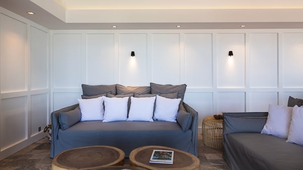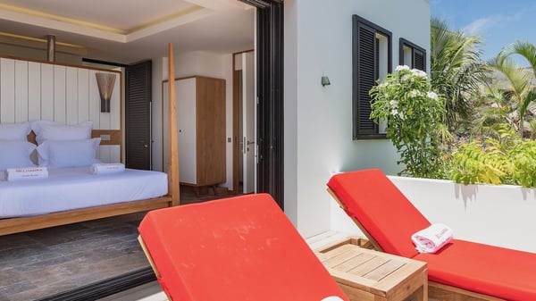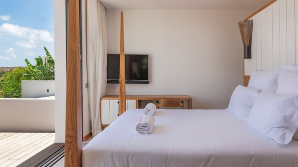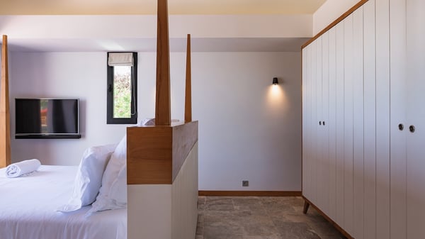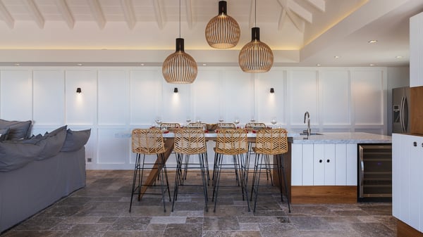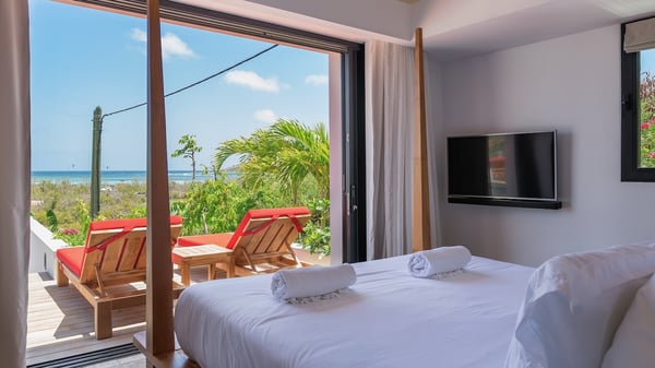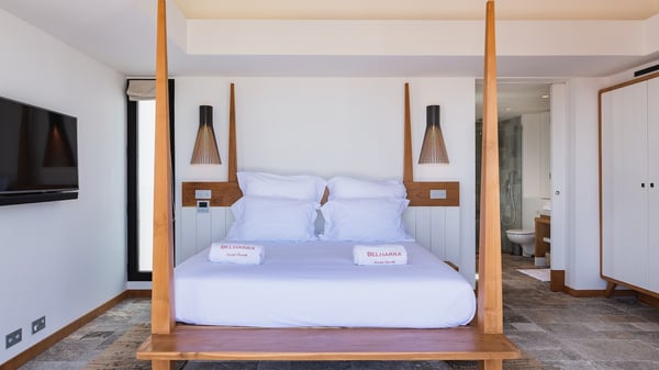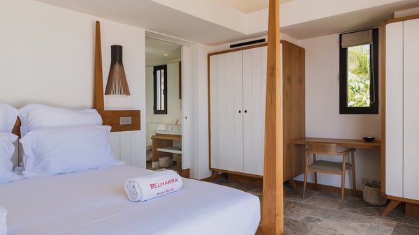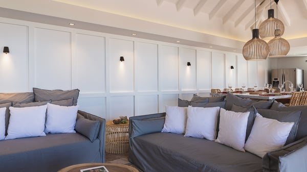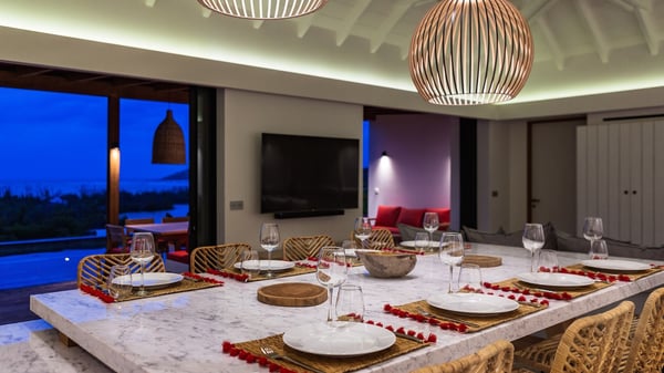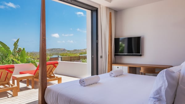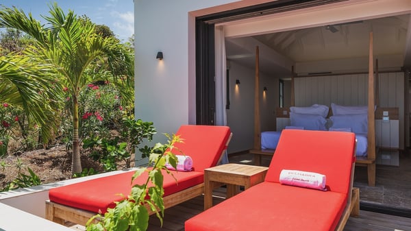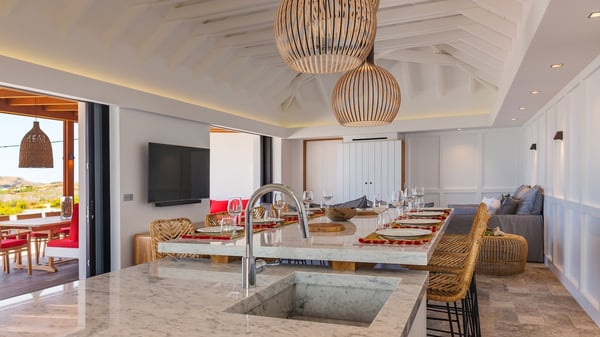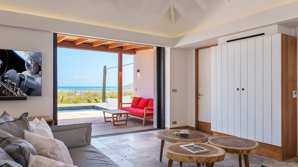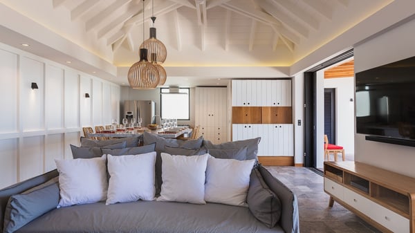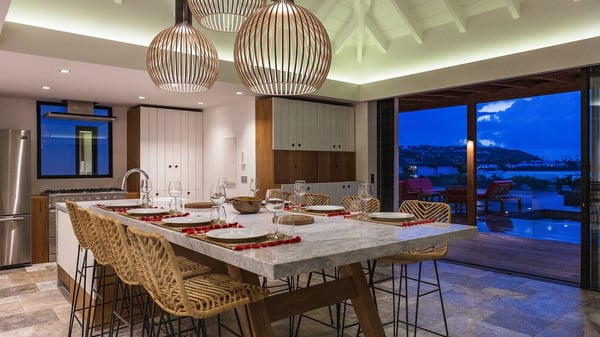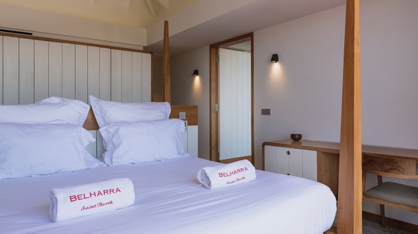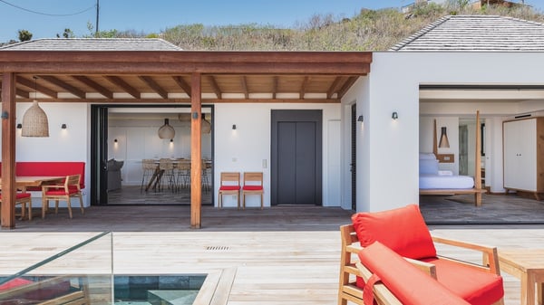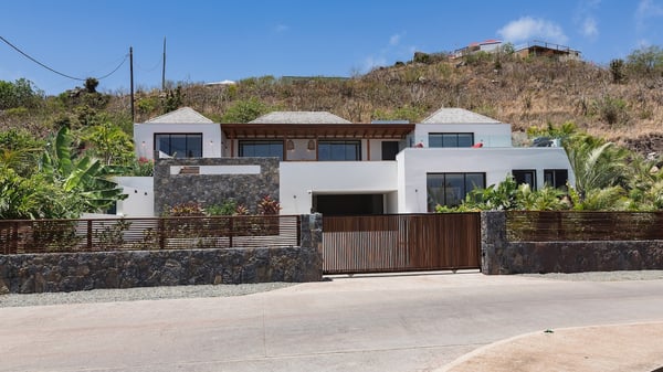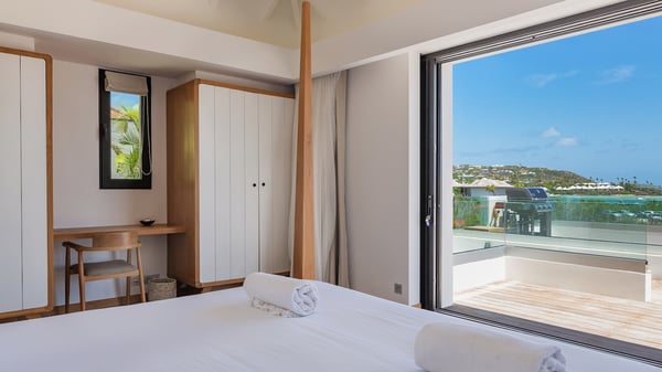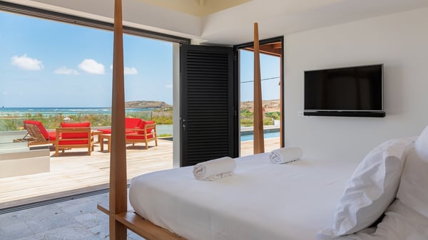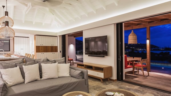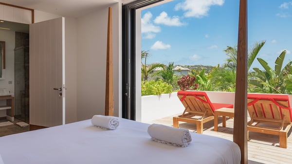 The luxury vacation rental Belharra Lagoon is located in Grand-Cul-de-Sac close to the pond and the lagoon. Coming with upscale services, this beautiful villa opens onto an amazing view over the bay, a true dream place for your next stay in St. Barths. In this luxury vacation home, the minimalist and sleek decoration creates a delightful and serene atmosphere. The large air-conditioned living room opens onto the terrace and welcomes guests with comfortable gray and white sofas, coming with a few wicker touches. You’ll enjoy relaxing in this peaceful living space featuring a big screen perfect for movie nights. The kitchen is very well equipped with a central island and a large white marble table, which can accommodate up to ten guests; an outdoor gas barbecue is also at your disposal for grilling. This bright and stylish living room opens onto an outstanding view over the lagoon of Grand Cul de Sac and Tortue Island, an idyllic scenery for a dream vacation. Whenever you wish to dine alfresco, there is a lovely wooden table topped with wicker hangers on the covered terrace furnished with chairs and benches facing the breathtaking panorama. At the front, the great rectangular heated swimming pool is surrounded by comfortable deckchairs perfect for sunbathing sessions. At one end of the terrace, an outdoor living room furnished with sofas and armchairs is set up for pleasant evenings under the Caribbean stars. The outdoor furniture is covered with red cushions and fabrics, providing a welcoming, warm touch. The luxury villa Belharra Lagoon is composed of four spacious and comfortable air-conditioned bedrooms overlooking the ocean and the tropical environment. They all have king-size beds, en-suite bathrooms and open onto a terrace. Two bedrooms are on the same level as the swimming pool, while the other two are on the lower level. One of the bedrooms has a patio with a jacuzzi in a very private atmosphere. In the evening, the refined lightings bring Belharra Lagoon’s modern architecture an amazing character in a fairy scenery.