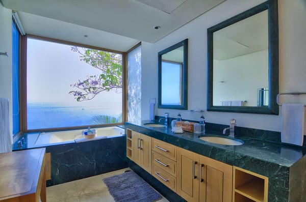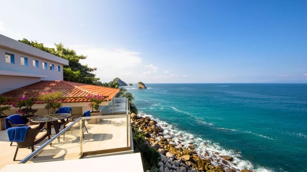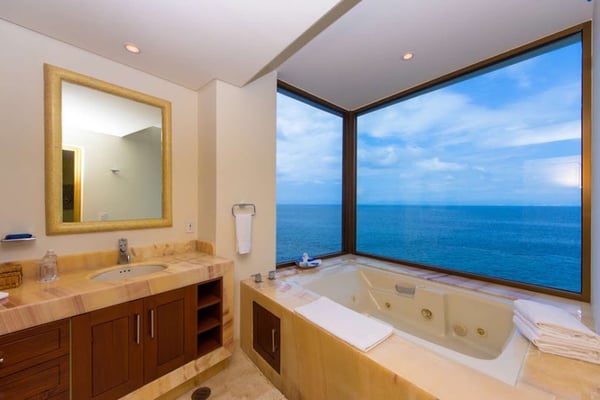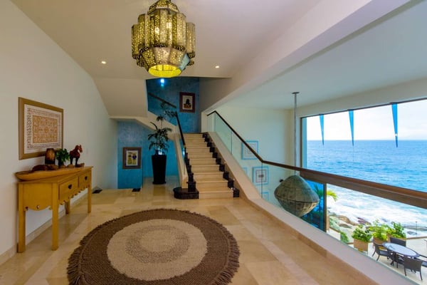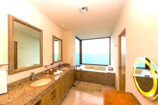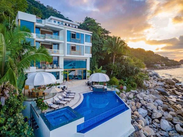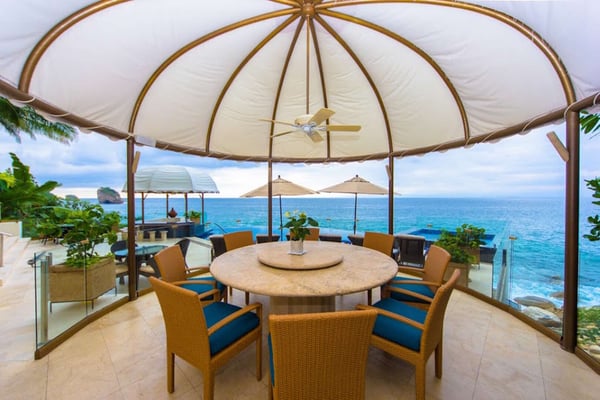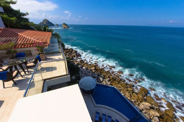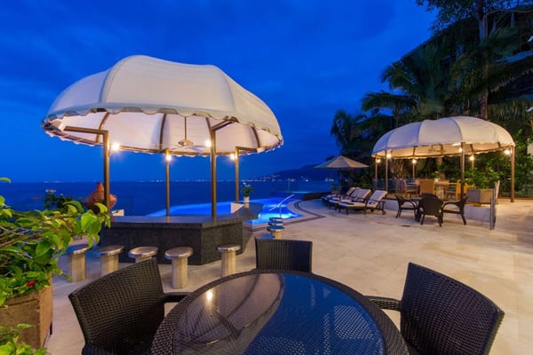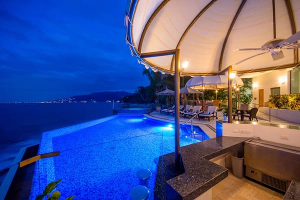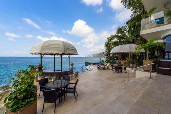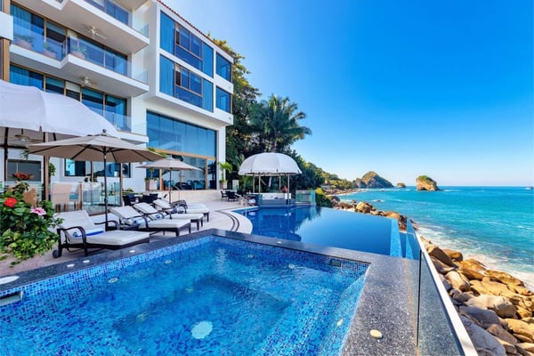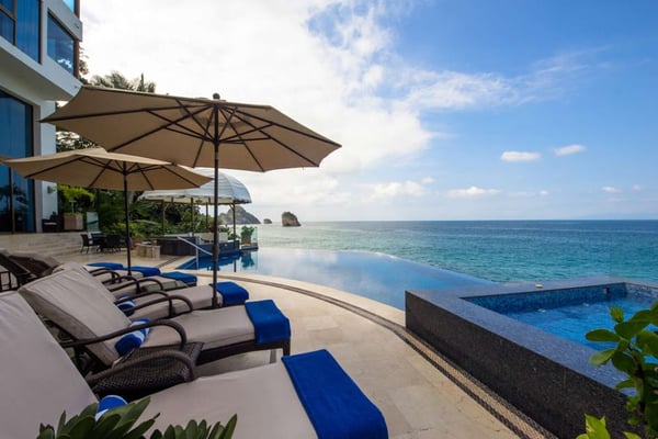 Casa DeMae 6 Bedrooms sleeps 12, and offers an Ocean Front private infinity pool, swim up bar, hot tub, elevator and a full staff. This stunning estate has a sleek and sexy vibe – with the latest in contemporary designs and furnishings. The rooms are each unique and feature regional art and design elements combined with luxuriously appointed bedrooms and baths all with ceiling mounted “hide away” TV’s and Jacuzzi tubs with ocean views. Casa DeMae combines modern design and oceanfront elegance with a lush garden setting found only in this Sierra del Mar at Los Arcos gated community. Spacious and dramatic entertainment areas and oceanfront terraces face an infinity pool and sweeping views of the entire Bay of Banderas and the famous Los Arcos archipelago. A rooftop sundeck offers guests stunning views of the edge of the bay and Los Arcos to the south and a great place for early morning sunrises. Sunbathing or saluting the amazing sunsets. Casa DeMae features a huge pool and massive built in ocean edge hot tub. A dramatic swim up bar, and wonderful shaded palapa area. The pool deck offers multiple seating/ sunning areas.