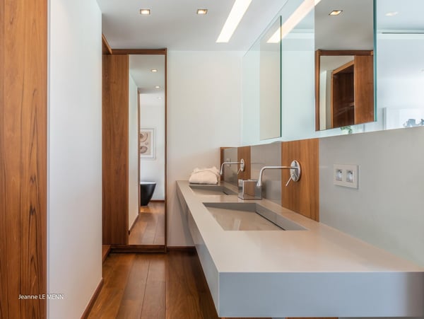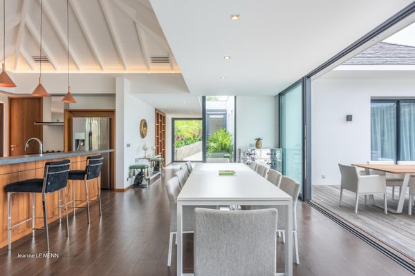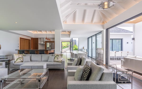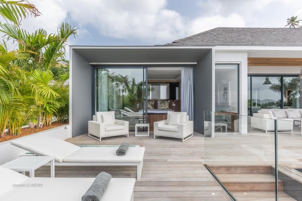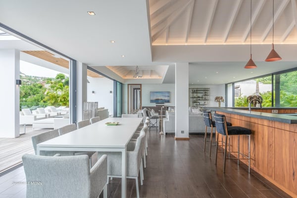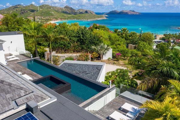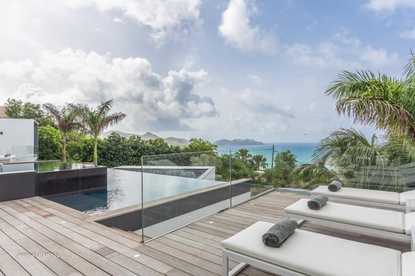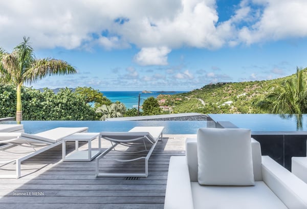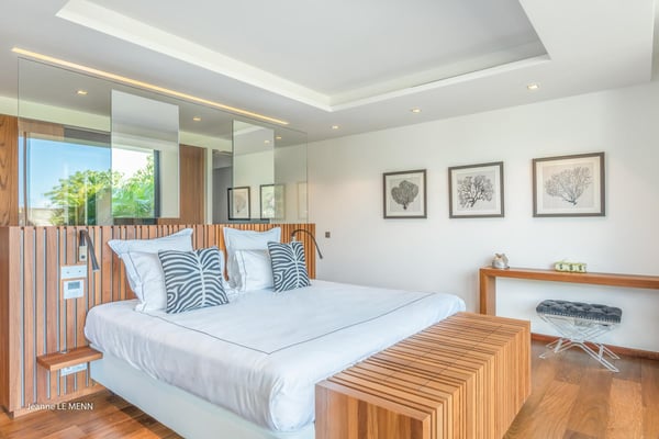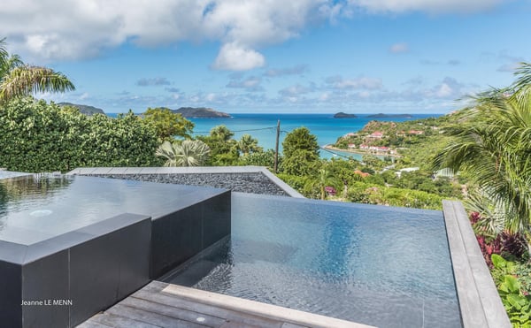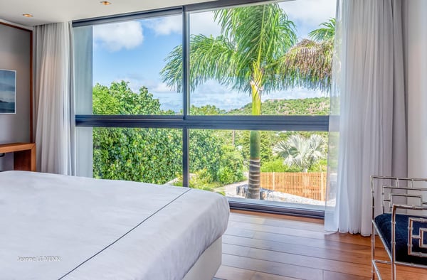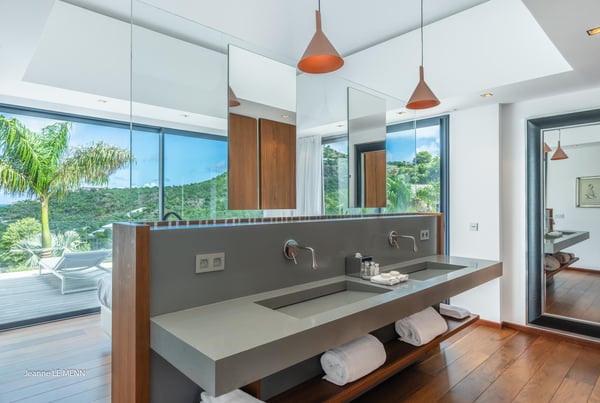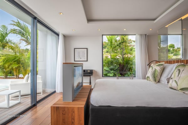 Nestled in the heart of a natural environment, the magnificent vacation rental Golden Palm is a newly built five-suite property located on the hillside of St. Jean with a splendid view over the bay. Close to the beach, Nikki Beach, restaurants and stores, this luxurious vacation home is the perfect place for an unforgettable stay in St. Barths. Built on several levels, this large villa was designed in a clean and modern style. The very comfortable living room opens directly onto the terrace and features large windows that can be completely closed whenever you wish. The living room is furnished with sofas, soft armchairs and a glass coffee table in a both modern and warm atmosphere, as the best place for relaxing in a soft and peaceful ambiance. The indoor dining room can accommodate up to ten guests in front of the breathtaking panorama, near the well-equipped kitchen with bar area. The linen-toned hints combined with the strikingly white walls and the vaulted ceiling create a pleasant sense of volume in this cozy space nestled between the deep blue ocean at the front and the lush tropical garden at the back of the villa. On the large terrace, you’ll enjoy beautiful outdoor spaces furnished with an outdoor living room and a dining room which can accommodate up to ten guests for alfresco meals. At the front, the heated infinity swimming pool and the jacuzzi create a true paradise with a breathtaking view over the ocean. Lounge chairs are set up on the deck for relaxing, reading or sunbathing sessions in front of the view. The tropical garden located below and around the villa creates an idyllic atmosphere while the colourful foliage and flowers are gently blown by the ocean breeze. The luxury villa in St. Barths Golden Palm has five beautiful suites with private bathrooms and views over the ocean and vegetation. They all feature European king-size beds and large walk-in closets. Three bedrooms are located on the main level, one of which opens directly onto the living room, while the other two are on the lower level, where a well-equipped fitness room is also available. Luxurious, modern and very private, this newly built villa is the perfect choice for a group of friends or for a family wishing to stay in Saint Jean and enjoy the nearby beach.