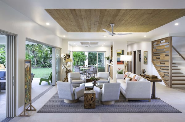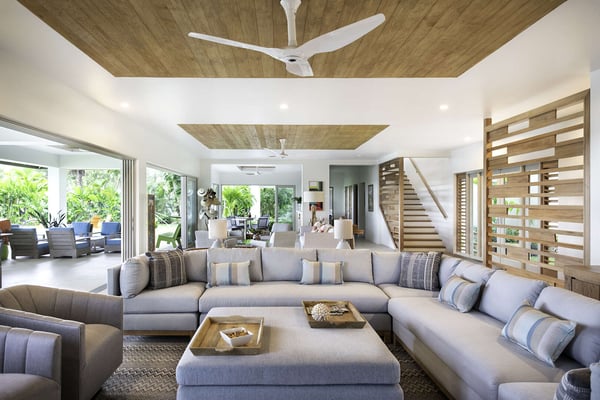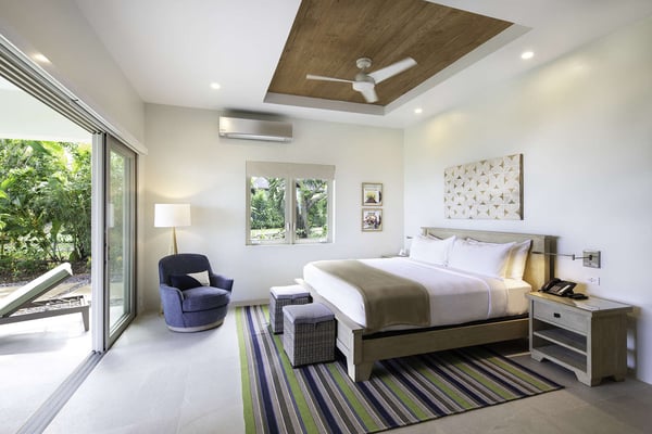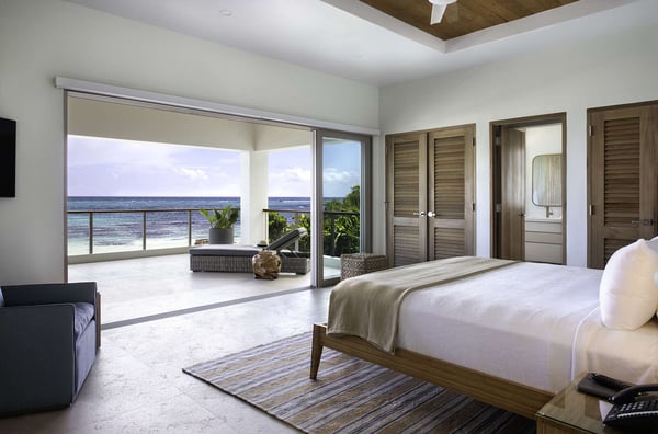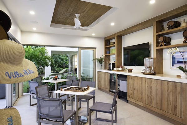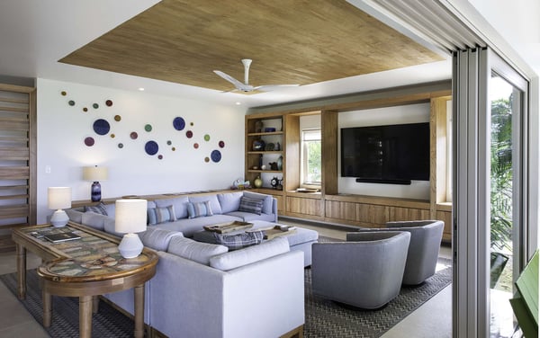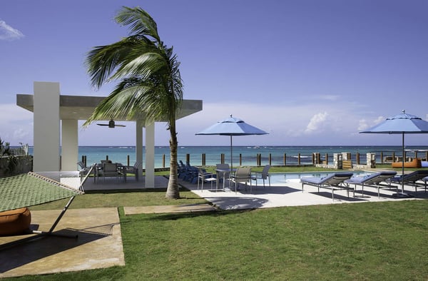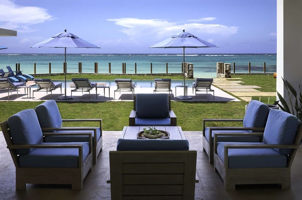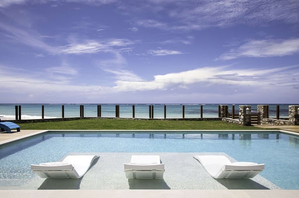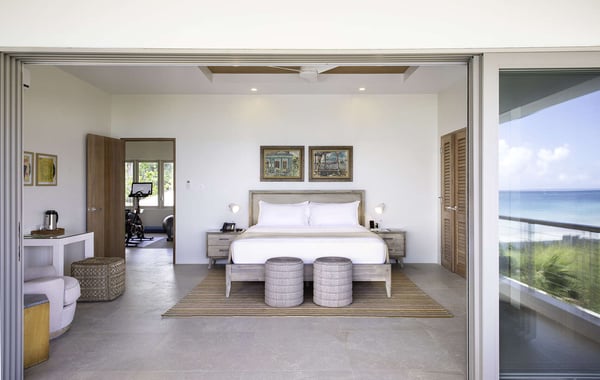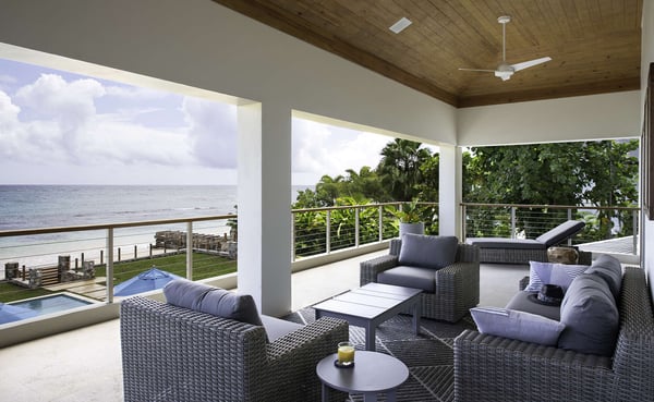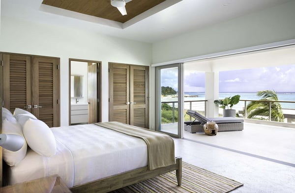 Entering Villa Lido to the wide-open view of the bay and Caribbean Sea beyond is a sight for sore eyes. Cool, elegant, modern interiors invite you in. The view is maximized by the open walls of glass. Every element of the masterful design has been created to work in unison with the idea of the inside, outside living. This is one space, multi-faceted and beautifully designed. Formal living leads to comfortable sofas in the media area on one side and the informal breakfast/bar area on the other. All doors lead to one of the two oversized verandahs – dining & seating are comfortable and inviting. The pool & lawn nudge the beautiful white sandy beach of Old Fort Bay. The poolside pavilion for long, lazy lunches gives welcome shade in the heat of the day. Sun loungers, both on the deck and on the Baja ledge, or the brightly coloured bean bag chairs on the lawn, invite relaxation. The sandy beach is five steps down from the lawn – choose a different spot each day. Enjoy an evening around the fire pit, toasting marshmallows, or enjoy a game of tennis, pickleball, or soccer in the cool part of the day.