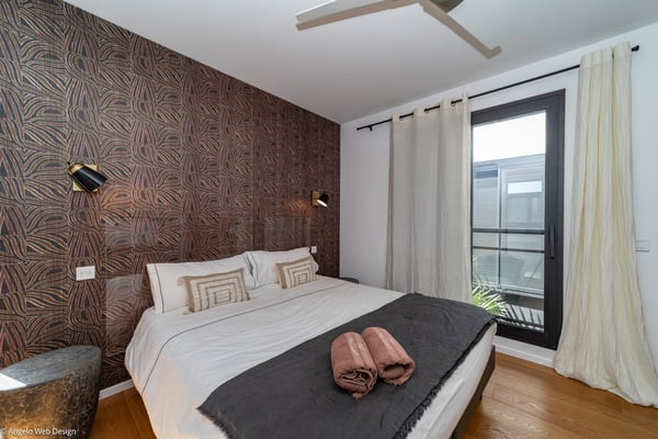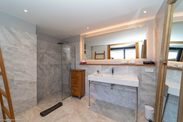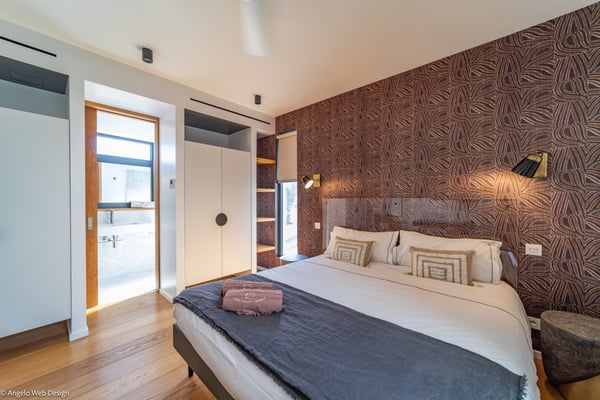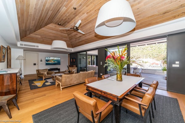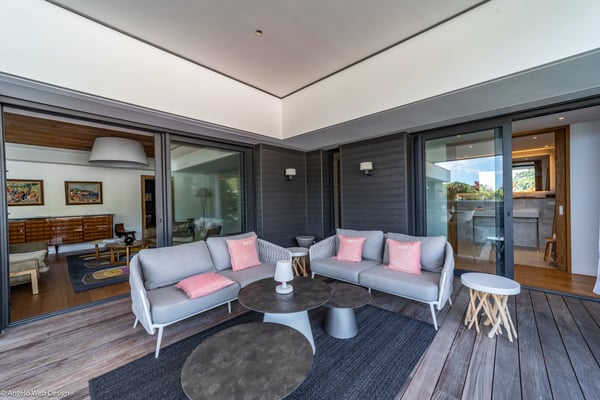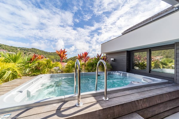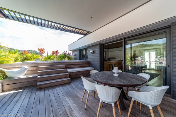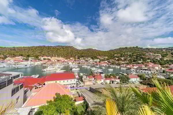 Gustavia Lights is a luxurious apartment ideally located in the center of Gustavia in a recent residence. The view over the yachts coming and going in the harbor and high-quality amenities make this three-bedroom apartment with a heated Jacuzzi the perfect place for a St Barths getaway in the heart of Gustavia life. Located on the upper level of Mardix residence, Gustavia Lights features large, airy spaces in a very contemporary décor. The living room opens onto the terrace with views over the city lights, the harbor and the surrounding hills, and is comfortably furnished with a sofa and armchairs in front of a flat-screen TV. The dining room which can accommodate up to six guests is located close to the living room, as well as the well-equipped kitchen that opens onto the living room and features a nice breakfast bar. Under the high, vaulted, caramel-colored wooden ceiling, the atmosphere is soft and quiet, the perfect place to relax after a walk in the city or on the beach. The terrace has a lovely dining room for six and a charming outdoor lounge with two soft sofas and coffee tables under the covered area, for beautiful evenings and pleasant al fresco dinners facing Gustavia's lights. In a décor of palm trees and wooden deck, the large heated jacuzzi is at your disposal for relaxing moments under the island's sun. In a luxurious and very private atmosphere, you will enjoy the mild Caribbean air blowing around, in absolute calm. Gustavia Lights has three air-conditioned bedrooms with views over the terrace and the environment. They are furnished with king size beds that can be converted into twin beds, large closets and office areas, and they also have private bathrooms. The décor is modern and very soothing, with shades of black and white combined with the romantic warmth of wood. With its fabulous view over the lights of Gustavia, Gustavia Lights welcomes you with family or friends for an unforgettable vacation in the heart of St Barths' effervescence.