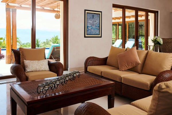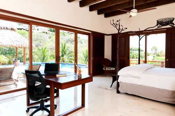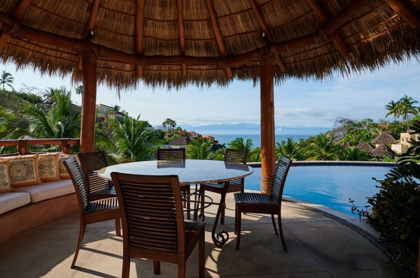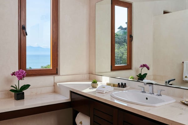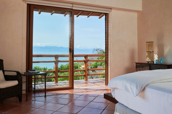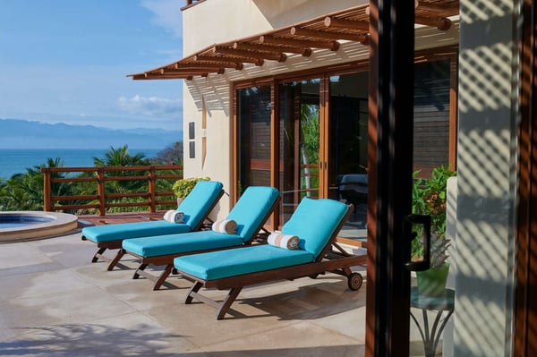 Casa Libelula is surrounded by stunning views and full access to the exclusive Real Del Mar resort. The resort’s tennis courts and spa are conveniently located just steps away from your door, a golf cart is provided to explore the entirety of the resort and its amenities. Enjoy daily al fresco breakfast in the beautiful poolside palapa overlooking the ocean. The main floor hosts an ocean view primary bedroom opening directly to the poolside sundeck. An outdoor grill and well-equipped kitchen are both available to prepare family meals together, or allow one of our chefs to take over while you relax. The upstairs bedrooms include private ensuite bathrooms equipped with walk-in showers and luxurious amenities. Wake up to a gorgeous view of Bahia de Banderas from the second level balconies before starting the day in paradise. Casa Libelula includes a separate guest studio with private entrance perfect for nanny’s or extra guests. The additional studio includes its own bathroom, kitchenette, and private balcony.