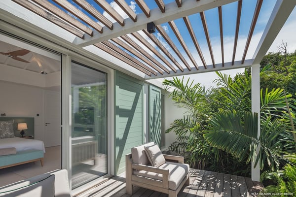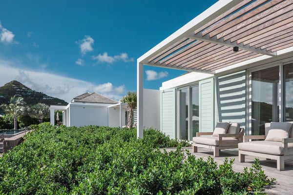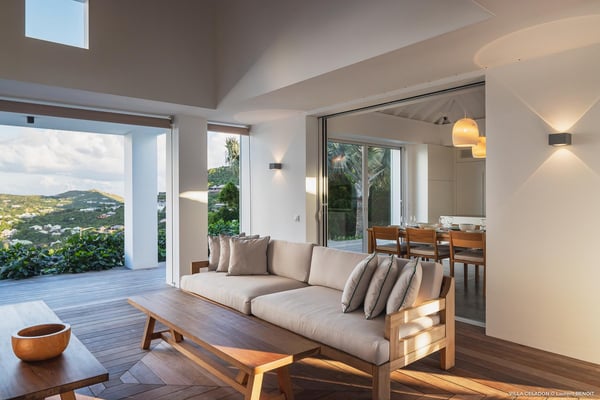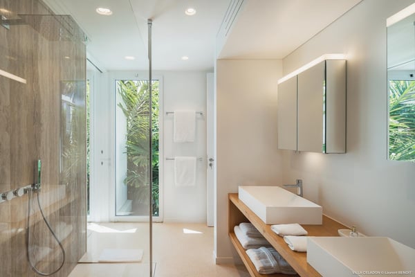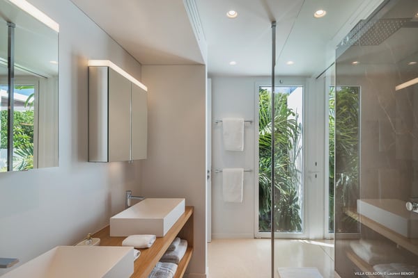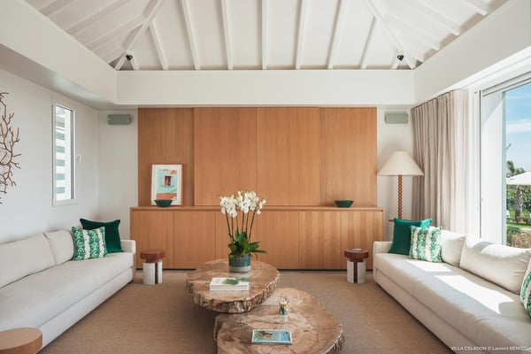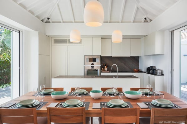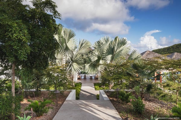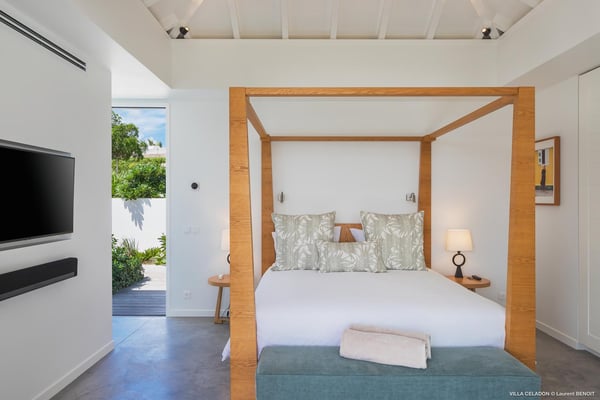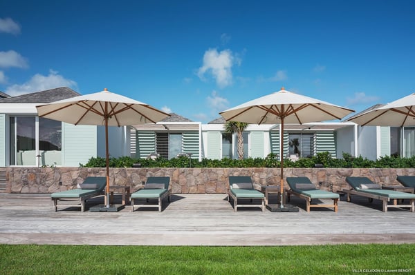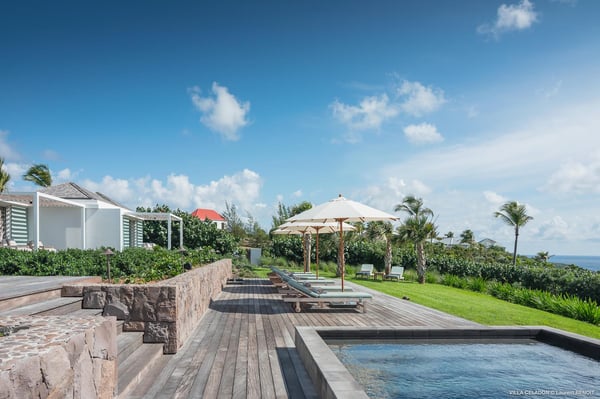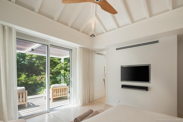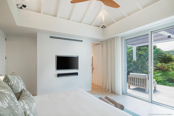Villa Celadon is a prestigious property in St Barths with a breathtaking view over the bay of Grand Cul de Sac and Petit Cul de Sac. Ideally located in the private Mont-Jean estate, this large five-bedroom air-conditioned vacation rental house offers upscale amenities that will make your stay an unforgettable interlude in the Caribbean. The luxurious rental villa Celadon is one of the most exclusive properties in St. Barths. This modern colonial-style mansion is an ode to relaxation and luxury. The large living room seems to be painted with oceanic hints, providing a maritime atmosphere combined with the white walls and refined decoration. The modern lighting brings a cozy touch to the whole with backlit ceilings, while the natural light comes in through the shutters. In this bright décor, there are very comfortable sofas in front of a wide opening onto the terrace with spectacular ocean views. The kitchen is well equipped to cook and enjoy delicious moments of gastronomy around the indoor dining room that can accommodate up to ten guests. What’s more, a television room is at your disposal for pleasant movie nights. At the front of the villa, take a few steps and reach the superb terrace with palm-shaded paths. The large heated swimming pool faces the horizon, a perfect place to relax and cool off at any time. Comfy sun loungers are set up in front of the breathtaking panorama, protected from the sun by lovely parasols. You will also enjoy having dinner al fresco in the outdoor dining room located under the covered terrace. In addition, there is an area with a nice green lawn for refreshing and relaxing moments. The large vacation rental villa Celadon welcomes you and your guests in five air-conditioned bedrooms opening onto beautiful ocean or garden views. Each bedroom is furnished with a king-size bed and has an en-suite bathroom as well as a private terrace, an ideal setup to enjoy the mild Caribbean air at any time. A sixth bathroom for guests is available for utmost privacy. Celadon is a most prestigious villa for a wonderful stay in St-Barths.