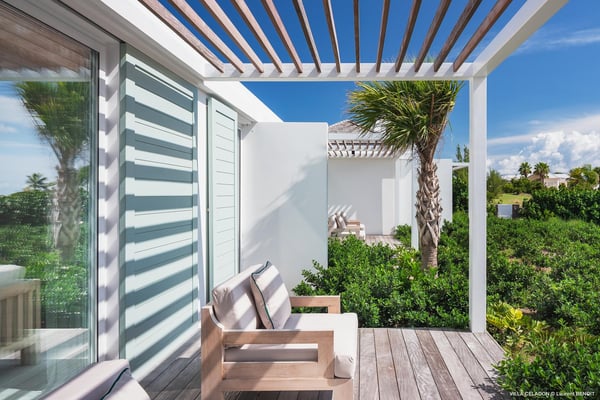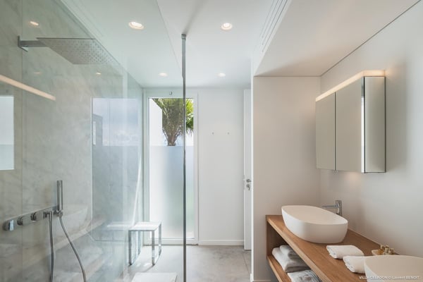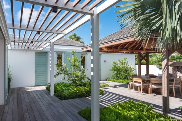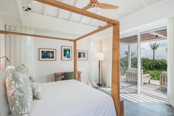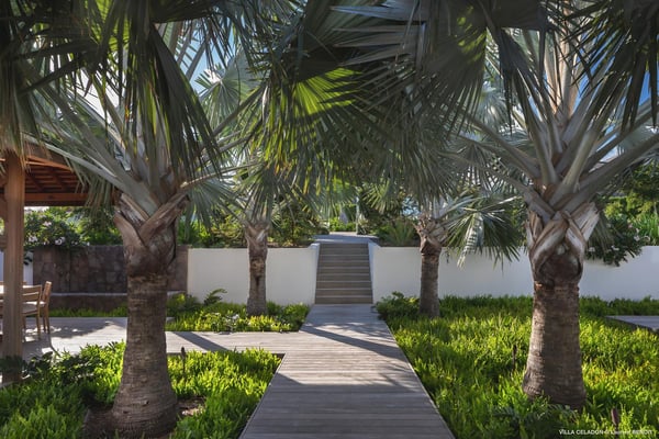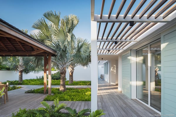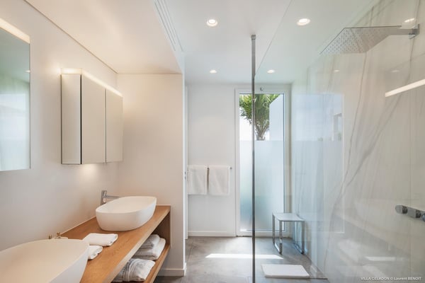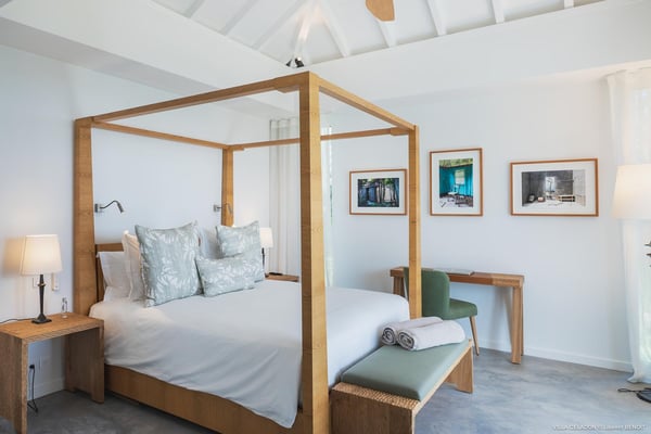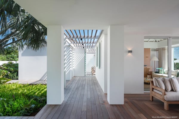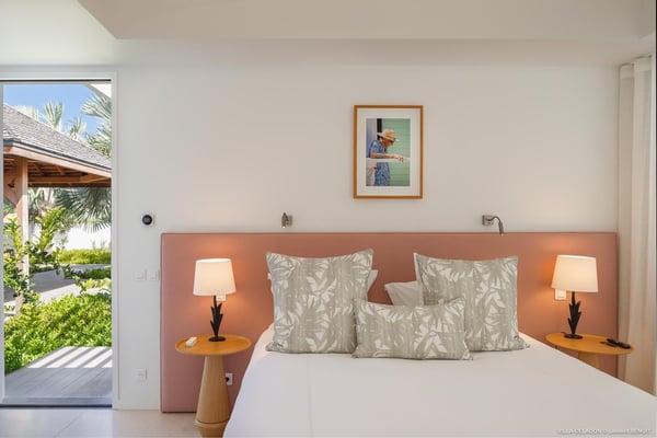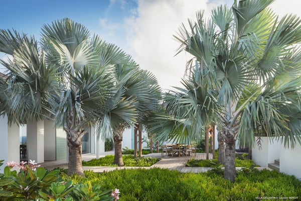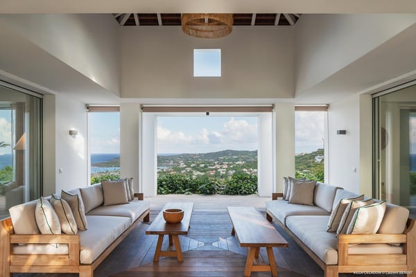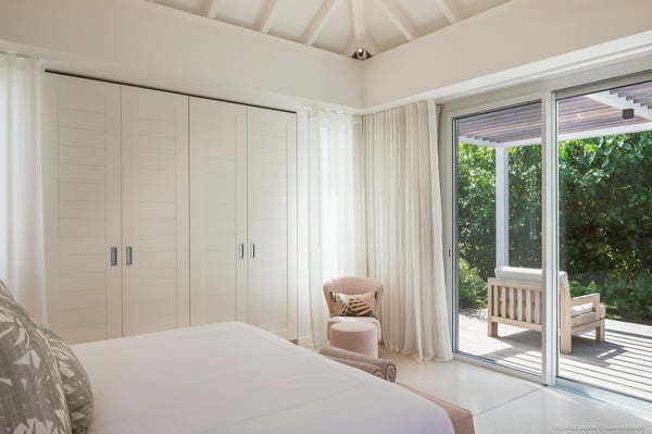 Villa Celadon is a prestigious property in St Barths with a breathtaking view over the bay of Grand Cul de Sac and Petit Cul de Sac. Ideally located in the private Mont-Jean estate, this large five-bedroom air-conditioned vacation rental house offers upscale amenities that will make your stay an unforgettable interlude in the Caribbean. The luxurious rental villa Celadon is one of the most exclusive properties in St. Barths. This modern colonial-style mansion is an ode to relaxation and luxury. The large living room seems to be painted with oceanic hints, providing a maritime atmosphere combined with the white walls and refined decoration. The modern lighting brings a cozy touch to the whole with backlit ceilings, while the natural light comes in through the shutters. In this bright décor, there are very comfortable sofas in front of a wide opening onto the terrace with spectacular ocean views. The kitchen is well equipped to cook and enjoy delicious moments of gastronomy around the indoor dining room that can accommodate up to ten guests. What’s more, a television room is at your disposal for pleasant movie nights. At the front of the villa, take a few steps and reach the superb terrace with palm-shaded paths. The large heated swimming pool faces the horizon, a perfect place to relax and cool off at any time. Comfy sun loungers are set up in front of the breathtaking panorama, protected from the sun by lovely parasols. You will also enjoy having dinner al fresco in the outdoor dining room located under the covered terrace. In addition, there is an area with a nice green lawn for refreshing and relaxing moments. The large vacation rental villa Celadon welcomes you and your guests in five air-conditioned bedrooms opening onto beautiful ocean or garden views. Each bedroom is furnished with a king-size bed and has an en-suite bathroom as well as a private terrace, an ideal setup to enjoy the mild Caribbean air at any time. A sixth bathroom for guests is available for utmost privacy. Celadon is a most prestigious villa for a wonderful stay in St-Barths.
