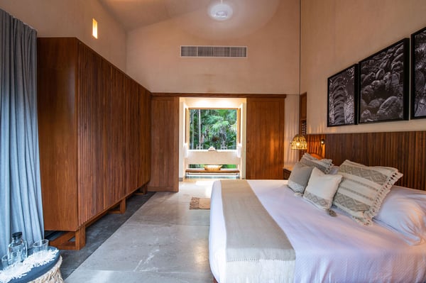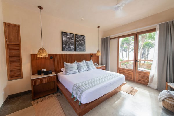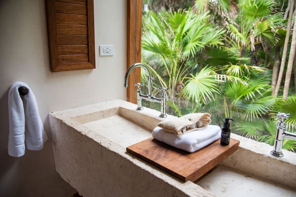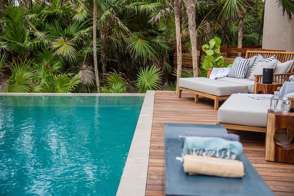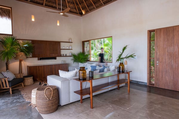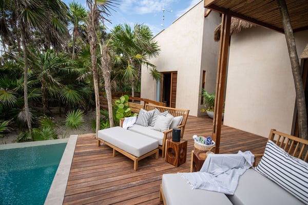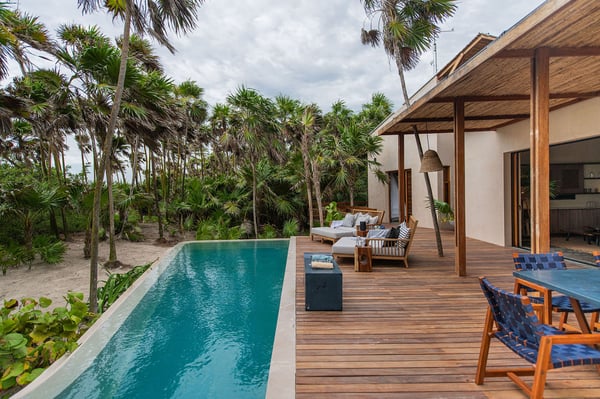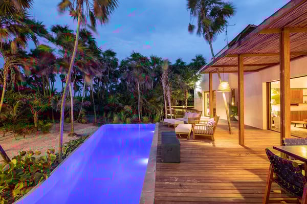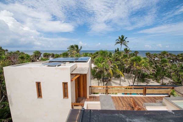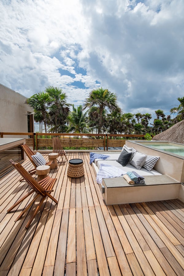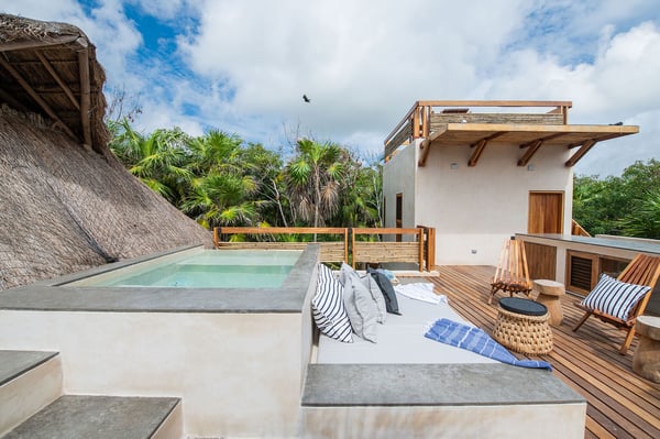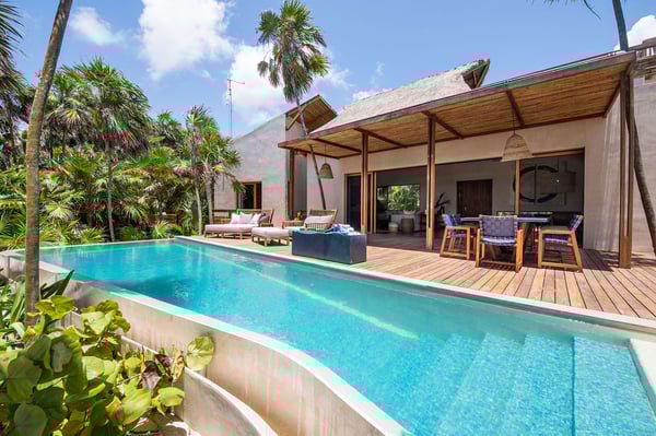 Even with a swimming pool that is almost a piece of art and a plunge tub on the rooftop terrace, at Casa Kati Kaan, nature steals the show. Located 3.5 miles into the Sian Ka’an Biosphere Reserve, this cozy eco-conscious villa is a tropical utopia. The 4-bedroom villa was built for guests to relish the landscape. Not only does it have a 100-meter private beachfront in a vibrant nature reserve, but it blends in with its surroundings. The open-plan living spaces fuse into the spectacular deck and pool, where the beach and its coco palms become part of the architecture. A 2.5-acre estate embraces the house, itself tucked between the Caribbean Sea and the beautiful Campechén Lagoon. While the home’s interior design is remarkable, one finds the best spots outdoors: the dining table on the deck, the rooftop terrace with its plunge tub, the lounge by the pool, and the sunbed cabana. The residence is equipped for exploring. Paddleboards, kayaks, boogie boards, and snorkeling gear are all available. Further, solar panels and a wind turbine generate all the power this self-sufficient villa needs. And of course, all bedrooms have air conditioning. Casa Kati Kaan is located 3.5 miles from the park entrance and just a 15-minute drive from some of Tulum’s most famous restaurants and bars. It is also 30 minutes away from downtown Tulum, where you will find supermarkets, shops, and other services.