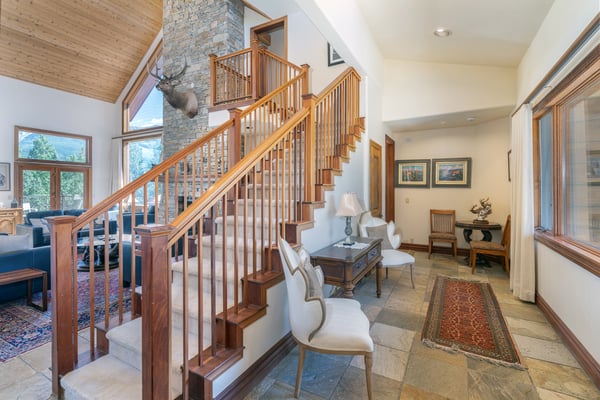 This gorgeous Colorado mountain home for rent has everything, including privacy and a big yard where the entire family can enjoy the great outdoors. Showcasing majestic mountain views from almost every window, Lodge on the Point is the perfect mountain setting from which to cozy up, wind down, and reconnect. The moment that guests enter this stunning home, they'll be immediately drawn to the massive floor-to-vaulted ceiling windows that provide jaw-dropping views of the entire San Sophia Range. The living area is beautifully centred with a large stone gas fireplace that is surrounded by comfortable sofa seating. This Telluride mountain vacation home's gourmet kitchen would bring a smile to any chef's face, and it boasts high-end stainless steel appliances from such trusted brands as KitchenAid, SubZero, and Viking. It also comes with a special wine fridge, plenty of granite countertops, beautiful custom cabinets, hex-clad pots and pans for creating chef-quality meals, and your choice of a drip or K-Cup coffee maker. Meals may be served at the breakfast bar that seats four or in the grand dining room that features a large table that seats eight. The kitchen also opens out onto a large outdoor deck that features a nice gas grill, comfortable outdoor seating, a relaxing hot tub, and fabulous views. Two lucky couples are sure to enjoy these lovely rooms, and each features a king-size bed that is warmed by a gas fireplace, has comfortable seating, and a flat-screen television. The primary baths include marble tile floors and marble countertops, a relaxing steam shower, a jetted tub, and dual vanity sinks. The first-floor suite also comes with beautiful double doors that open out onto the private deck with the hot tub. The final two guest rooms share a bath with a relaxing steam shower and dual vanities. One room comes with a queen-size bed and a view of the Telluride Airport, and the other room offers a king-size bed and French doors that open onto a deck with views of the San Sophia Ridgeline. This spacious room allows guests to house all of the children in one area so that they'll have a place to call their own and play together. It comes with four twin-size beds and one queen-size bed, and there's plenty of play space. There's a full bathroom with a glass shower/tub combo available just down the hall. Guests of all ages will find a way to enjoy this wonderful room, which features amazing views of the Telluride Ski Resort and the Wilson Range. Large leather sofas provide comfy seating in front of the newly upgraded 85" television with a 4k ultra-HD Blu-ray player, so it's absolutely perfect for movie night. There's also a wet bar, a mini-fridge, and a sink in this area. Laundry has a way of piling up during any vacation, especially when children are involved, but that won't happen at this vacation residence. Guests have full access to the most convenient laundry room, which features a front-loading washer, a dryer, and a sink for rinsing stained clothes before they're tossed into the wash. Lodge on the Point is just right for a large family reunion for up to 14 people, and it's also been the site of beautiful weddings and other private events. Brushing shoulders with Hollywood film history, Lodge on the Point hosted actors and production crew from the filming of Quentin Tarantino's hit film "The Hateful Eight. Check for availability for this Colorado mountain home for rent today. TMV BL# 005342