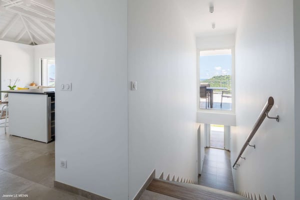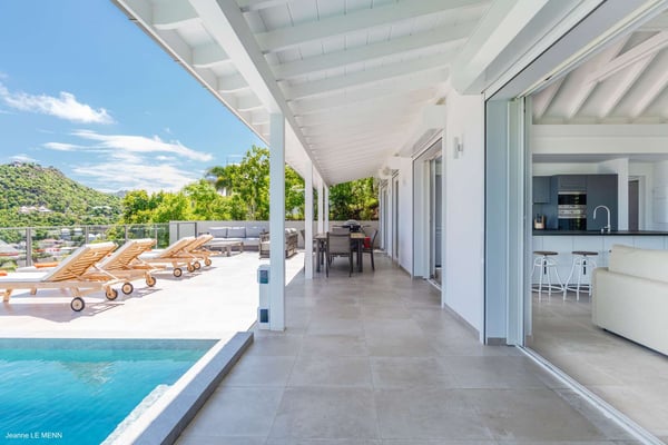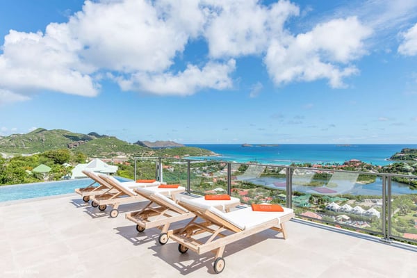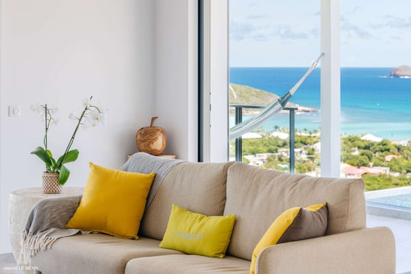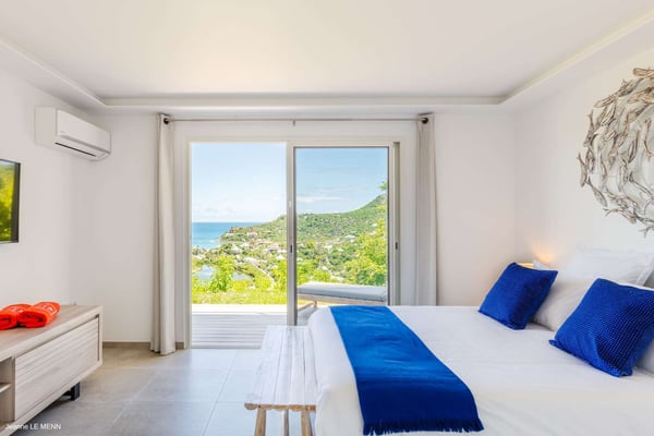 Located on the heights of St. Jean, the luxury villa Oiseau Bleu is a newly built property with a breathtaking ocean view. Very contemporary and equipped with the best amenities and noble materials, this three-bedroom air-conditioned vacation home is the perfect setting for an unforgettable stay with family or friends in Saint Barths. Comfortable and very bright, the vacation home Oiseau Bleu combines the charm of a warm decoration with a modern and refined design with woody touches. The living room is airy and blown by the mild wind through large openings; it is furnished with sofas covered with yellow cushions. On the wall, the flat screen is perfect for delightful movie nights. The well-equipped kitchen has a breakfast bar for snacks or talk over a coffee. Under the high vaulted ceiling, the sense of volume brings a delightful feeling of well-being, facing the strikingly beautiful view over the ocean behind the many windows onto the outside. In the heart of the rolling hills of Saint Barths, the environment is relaxing and quiet. The front terrace is a true haven of peace designed around a splendid infinity pool where you will enjoy swimming in front of the stunning panoramic view. Sun loungers, a hammock located under the covered part of the terrace, and a comfortable outdoor lounge complete the outdoor set up. The surrounding tropical vegetation brings a touch of freshness and exoticism to this truly enchanting setting lulled by the trade winds under the Caribbean sun. The vacation rental Oiseau Bleu in St. Barths is composed of three beautiful air-conditioned bedrooms with en-suite bathrooms. The master bedroom is located on the main level and opens onto the living room and the terrace, with a lovely view over the bay. The other two suites are on the lower level, which can be accessed through an interior staircase, and both also have a terrace area and a beautiful ocean view. They are equipped with king, queen and twin beds that can be converted into king-size, as well as televisions, and all the necessary comforts for upscale services. Comfortable and very private, the vacation villa Oiseau Bleu is among the best places for an unforgettable stay in St. Barths.
