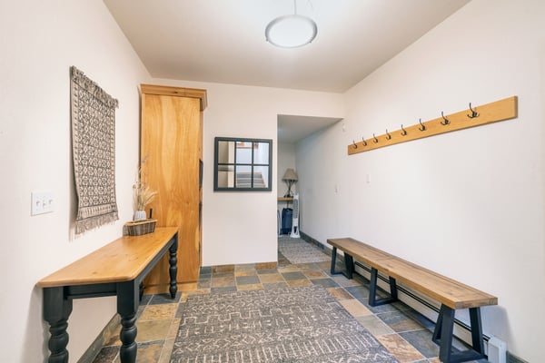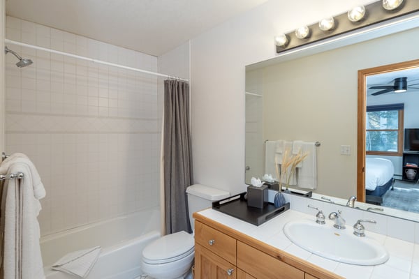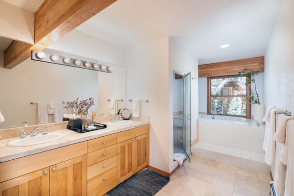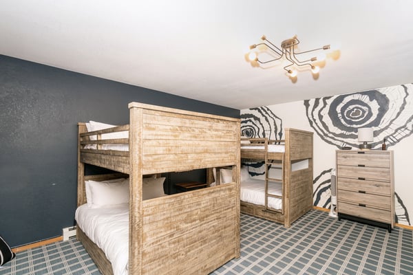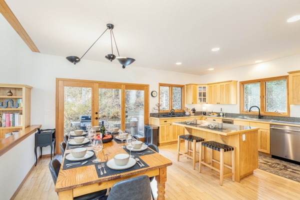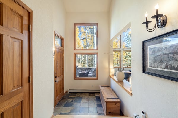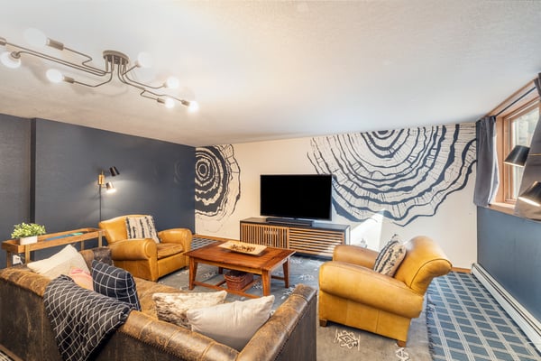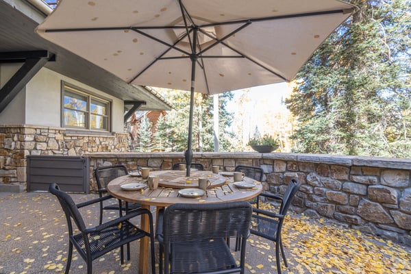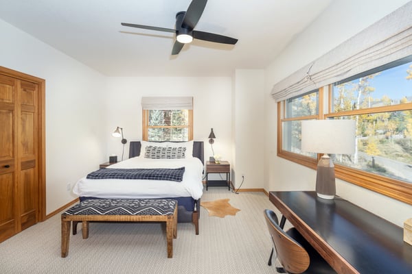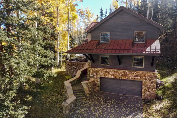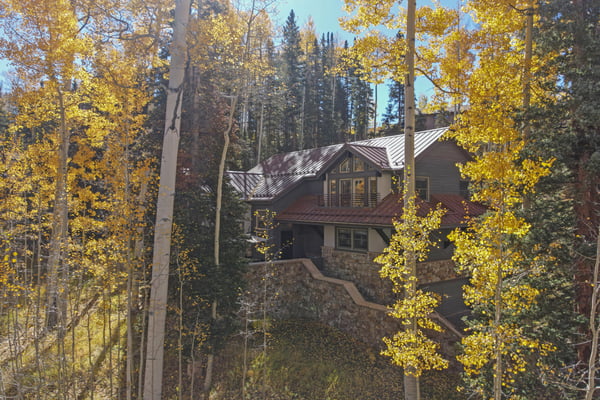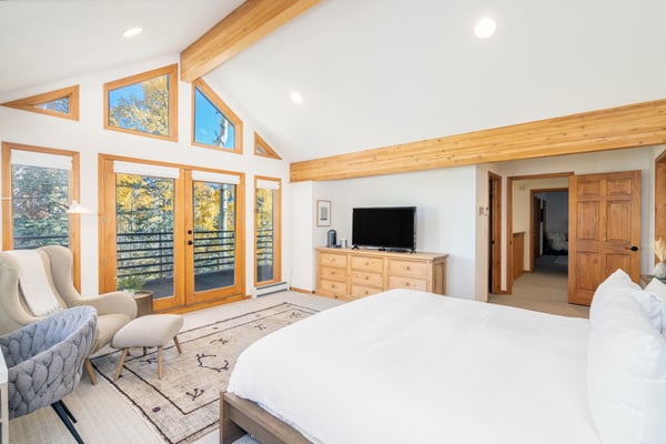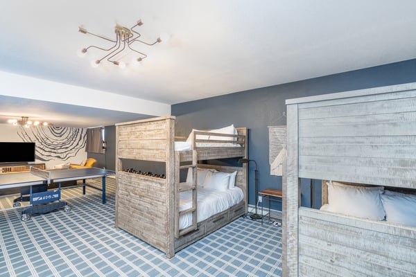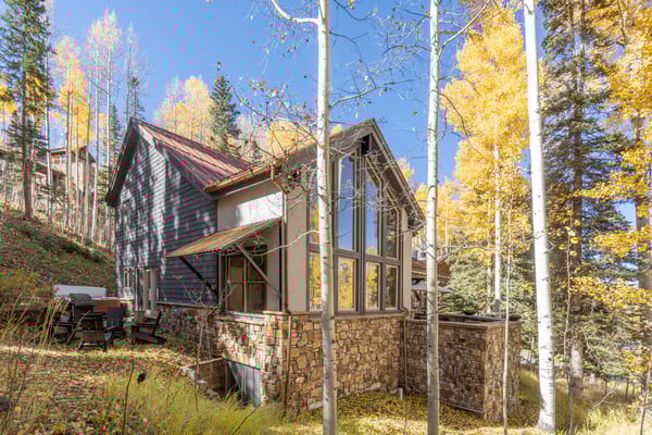 Located on a quiet mountain lane right in between two ski runs, Haven on Hang Glider is a spacious, private home with a clean, contemporary vibe. Enjoy the peace of a luxurious cabin in the forest together with the convenience of a perfect Mountain Village location. With sleeping space for 12 people, four bedrooms, a game room, and a hot tub- Haven on Hang Glider has plenty of space for families and groups of friends to gather together for an unforgettable Rocky Mountain holiday. The modern glass and stone facade is nestled snugly among the whispering pine trees. Inside, the open and airy great room is highlighted by a wall of floor-to-ceiling windows and a soaring cathedral ceiling. The sunken room is peppered with several cozy sitting areas, including two leather armchairs and a large sectional sofa. A fireplace is flanked by blonde wood bookshelves- one with a flat-screen television- and adds warmth to the spacious room. Large groups will love the open kitchen- which allows for easy socializing and conversation. Light wood cabinets, large windows, and a glass door leading out to the back patio add to the light and open feel of the kitchen. A large center island has casual bar seating, while a more formal dining table has seating for eight. This home has two private outdoor areas for relaxing in the dappled Telluride sunshine. From the dining area, step outside the glass doors and onto the secluded patio, complete with a barbecue grill and hot tub. The hot tub is ideal for unwinding after a long day on the slopes. Another outdoor patio with an alfresco dining table is located in the front of the home overlooking the peaceful neighborhood. Located on the third level, the primary suite has cathedral ceilings trimmed with natural wood beams and a wall of glass with doors leading out to a private balcony. The suite includes a king-size bed enveloped in pristine white linens, a desk, and a seating area. The ensuite master bathroom has a step-up soaking tub, a separate step-in shower, and a double vanity. On the same level, a secondary king-size suite includes a flatscreen television, a sitting area, and a full attached bathroom with a tub/shower combo. On the main level, two more bedrooms create plenty of sleeping space for your whole crew. The first bedroom has a queen-size bed, a small desk, and an ensuite bathroom with a step-in shower. The second bedroom has a split king bed that can be changed to two twin beds to fit your party's sleeping needs and a private bathroom with a step-in shower. The lower level game room is a fun hangout space with a ping-pong table and a bonus living area with a leather sofa, armchairs, and flatscreen television. Two full-over-full bunk beds add extra sleeping space. This home has all of the fun amenities you could want with Xbox, toys, books, games for all ages, sports equipment, and plenty of outdoor games, among others. TMV BL# 008086