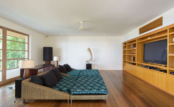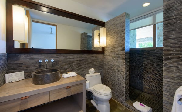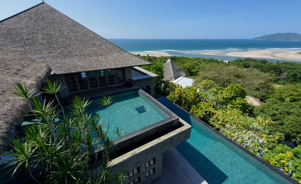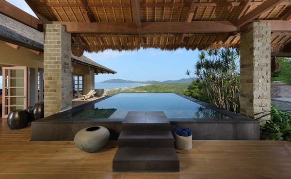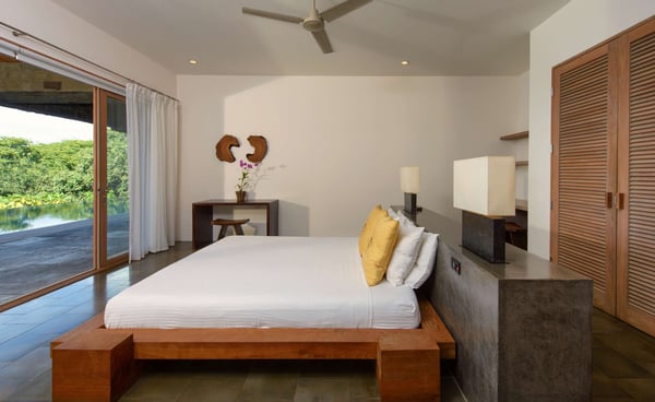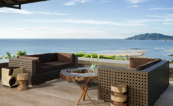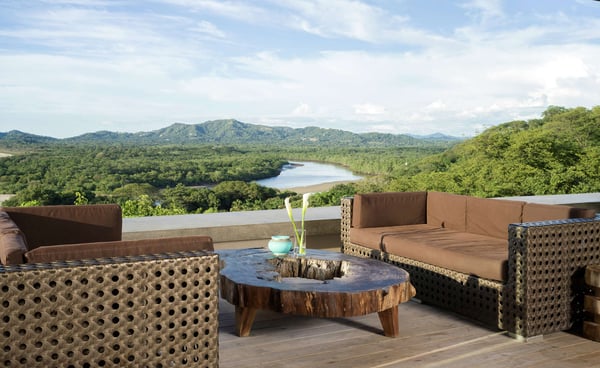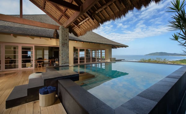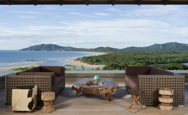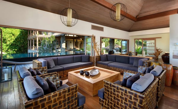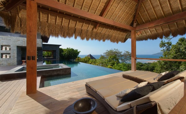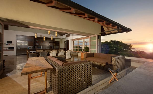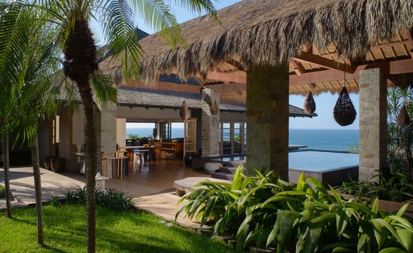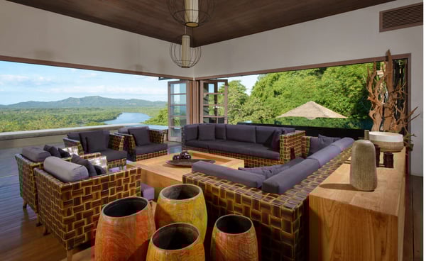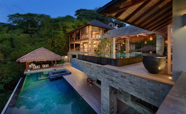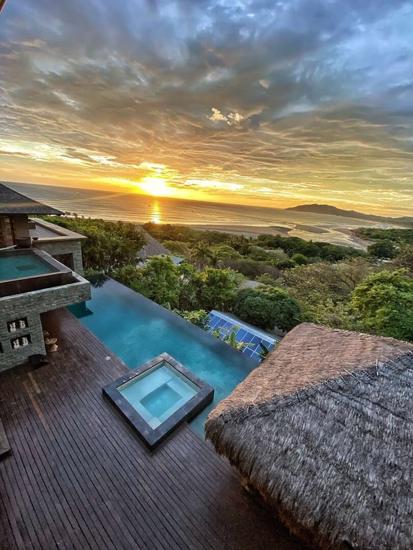 Inspired by Bali living, Casa Alang Alang in Tamarindo, Guanacaste is approximately 15,000 square feet and features eight bedrooms, sleeping up to 19 guests in great comfort and style with a unique blend of privacy and multiple ample common areas. This luxury villa is located on a private, secluded hillside at the entrance of Tamarindo with breathtaking views of Tamarindo estuary and the Pacific Ocean all the way north to Playa Grande, yet 5 minutes walking distance to the beach and town center. This living area contains a large ironwood dining table and a comfortable lounge area to relax, offering spectacular views of the ocean. Casa Alang Alang has two swimming pools - an overflowing lap pool of 21m in the lower level ending in a Bale with double lounge chairs and the swimming pool on the main floor overflowing on four sides, giving the impression of a giant mirror looking towards the ocean.