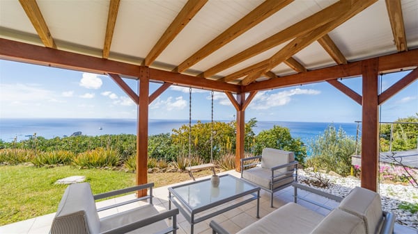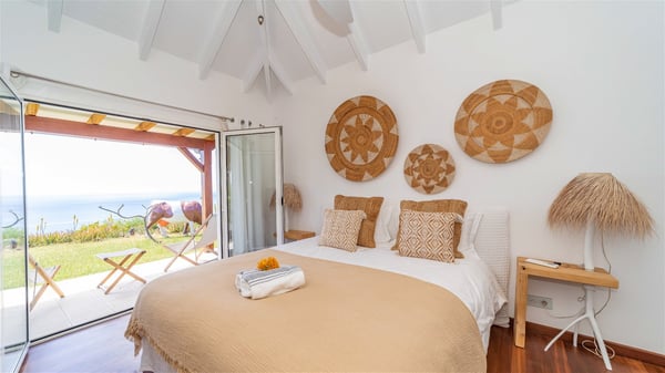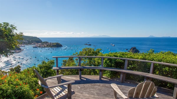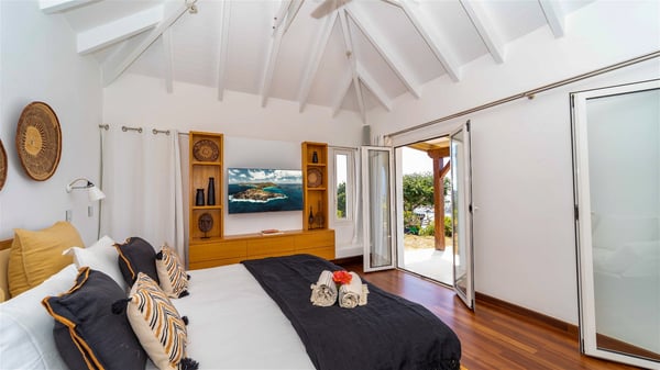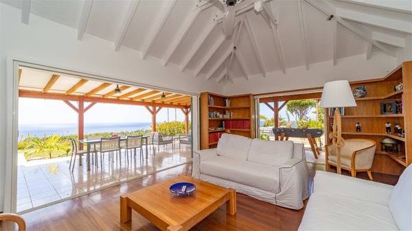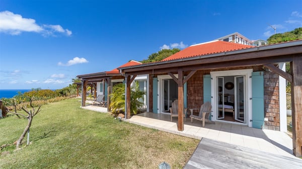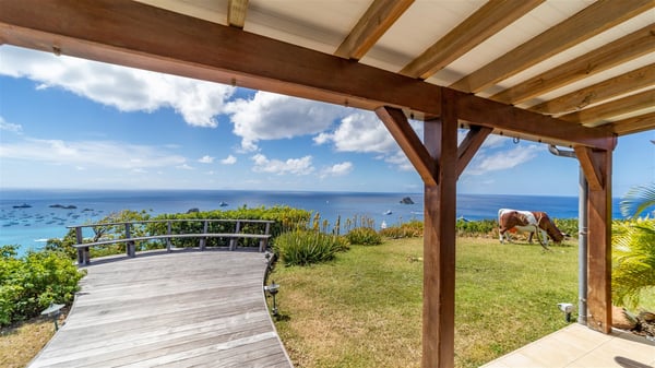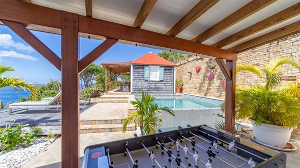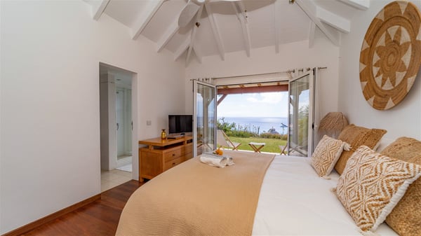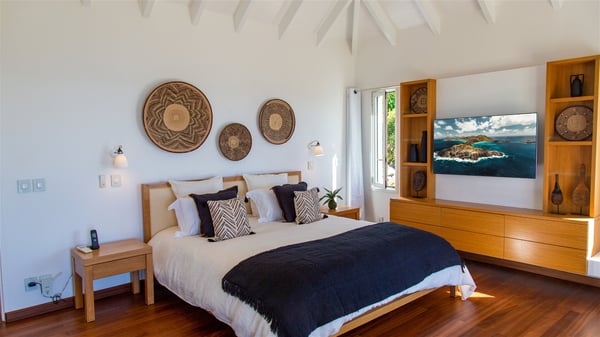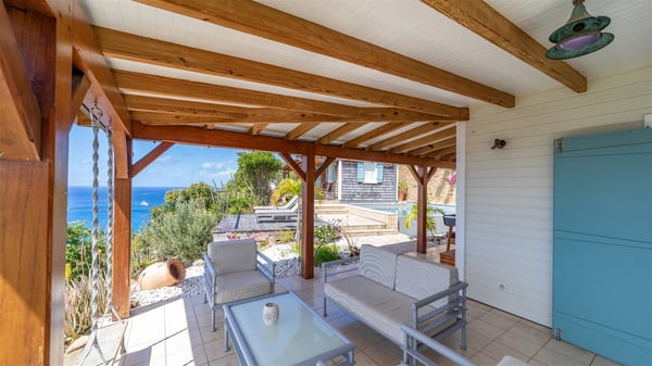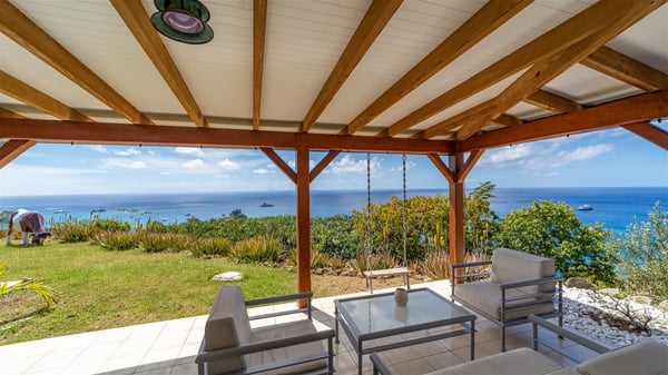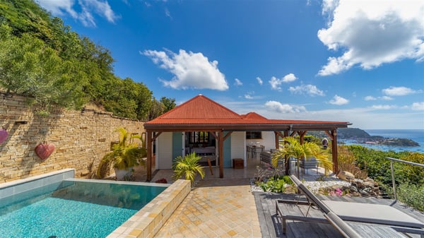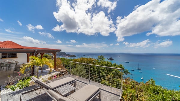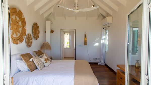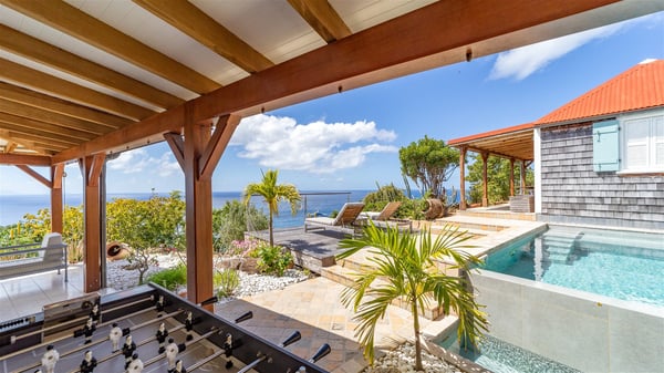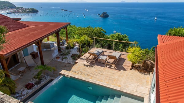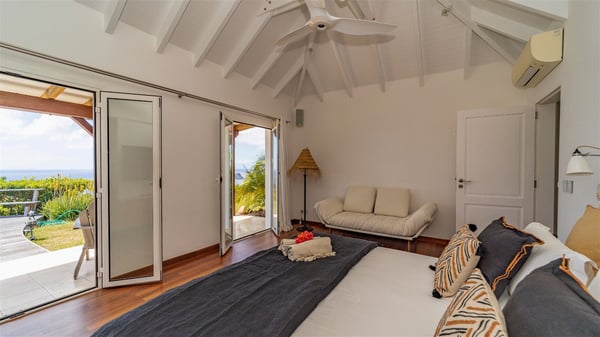 The vacation rental Carpe Diem is a charming property located in Colombier in front of a magnificent view over the ocean and the glorious sunsets. Nestled in a lush tropical environment, this very private holiday home with swimming pool welcomes guests in two air-conditioned bedrooms, the perfect place for a romantic getaway in St-Barths. Built-in the heart of a beautiful tropical garden, the Caribbean-style villa Carpe Diem overlooks the ocean and its sparkling reflections. Its spacious and bright living room features a comfortable lounge with sofas and soft armchairs with white and caramel-colour hints, a flat-screen TV, a nice library, as well as a table soccer perfect for game nights. The well-equipped kitchen offers a breathtaking ocean view and has a breakfast bar that opens onto the dining area under the covered terrace, where you will enjoy your dinners in the gentle trade winds. Swept by the tropical breeze, the terrace at the front of the villa opens onto an extraordinary ocean view. Close to the outdoor dining area, there is a lovely swimming pool with wide steps, ideal for swimming and relaxing sessions under the island’s sun. Deck chairs face the breathtakingly beautiful panorama over the lush surroundings. What’s more, at the entrance of the villa, an outdoor space furnished with a nice table and lovely chairs is also at your disposal, like a fresh and peaceful paradise in the Caribbean mildness. And every evening, you will marvel at the breathtaking beauty of the golden reflections of the sunsets over the ocean, lighting up the sky and the surrounding hills with an incredible glow. Villa Carpe Diem has two air-conditioned bedrooms with en-suite bathrooms and breathtaking ocean views. Both bedrooms are comfortably furnished with king-size beds and have HDTVs, in a cozy decor with natural materials. Under the high ceilings, the sense of volume provides a pleasant feeling of comfort and relaxation. Between sky and sea, the vacation rental villa Carpe Diem is the perfect place for a stay with family or friends in the natural beauty of St-Barths.