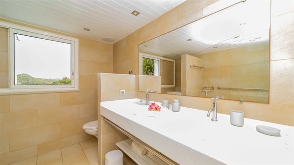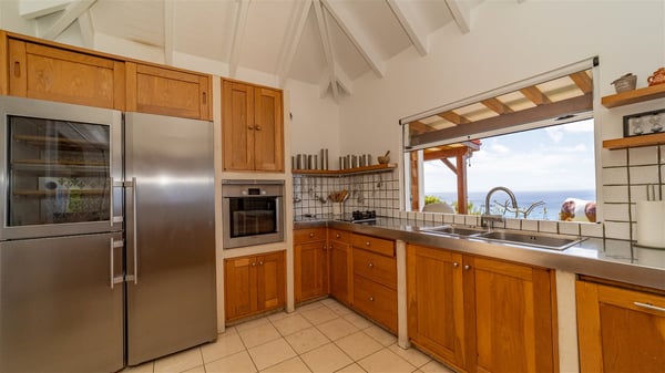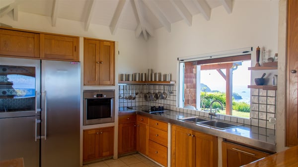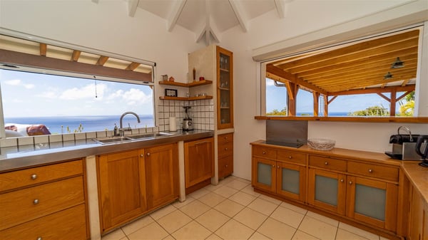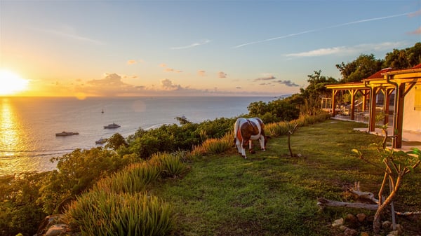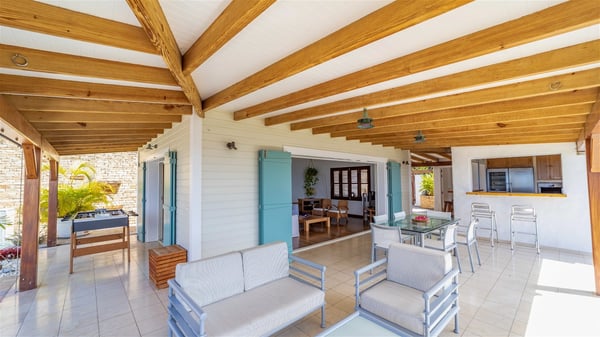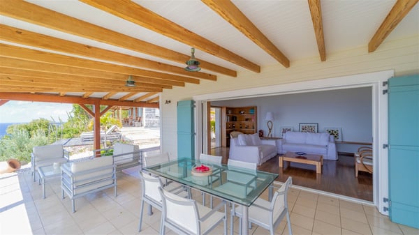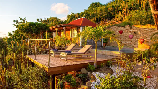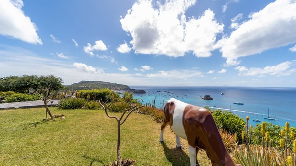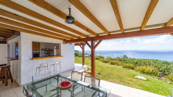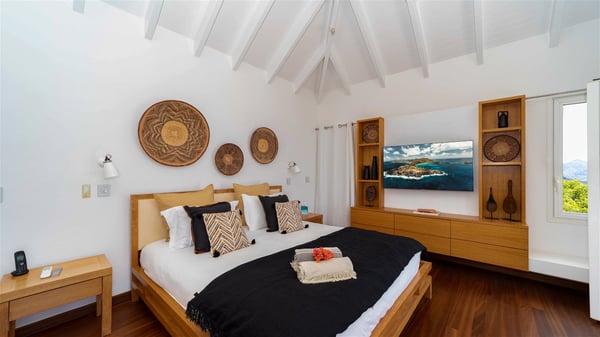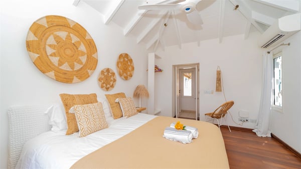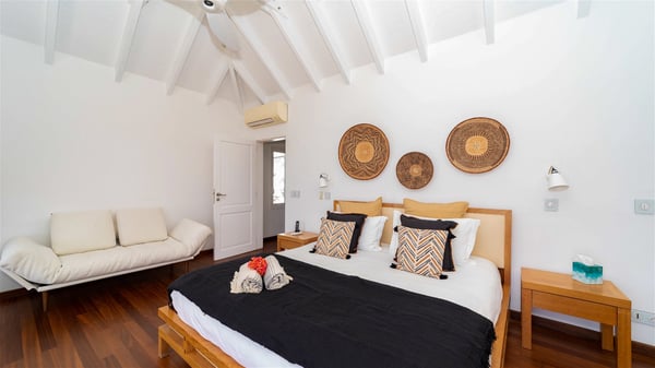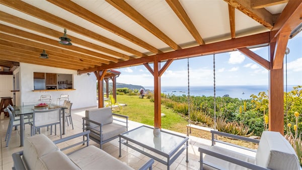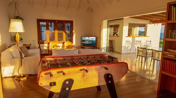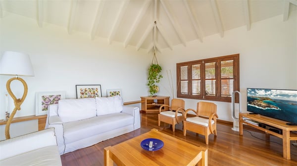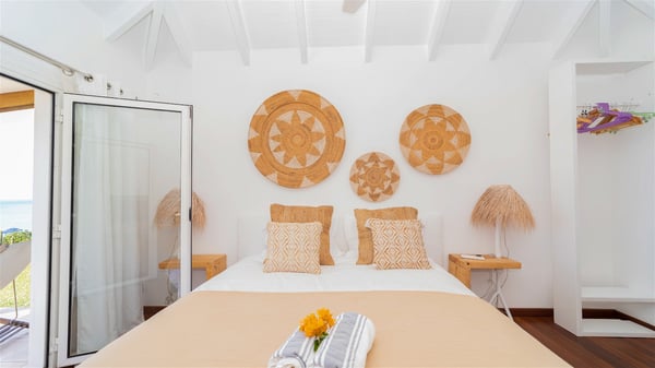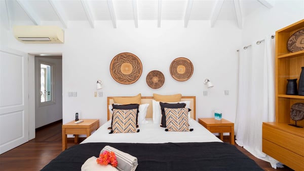 The vacation rental Carpe Diem is a charming property located in Colombier in front of a magnificent view over the ocean and the glorious sunsets. Nestled in a lush tropical environment, this very private holiday home with swimming pool welcomes guests in two air-conditioned bedrooms, the perfect place for a romantic getaway in St-Barths. Built-in the heart of a beautiful tropical garden, the Caribbean-style villa Carpe Diem overlooks the ocean and its sparkling reflections. Its spacious and bright living room features a comfortable lounge with sofas and soft armchairs with white and caramel-colour hints, a flat-screen TV, a nice library, as well as a table soccer perfect for game nights. The well-equipped kitchen offers a breathtaking ocean view and has a breakfast bar that opens onto the dining area under the covered terrace, where you will enjoy your dinners in the gentle trade winds. Swept by the tropical breeze, the terrace at the front of the villa opens onto an extraordinary ocean view. Close to the outdoor dining area, there is a lovely swimming pool with wide steps, ideal for swimming and relaxing sessions under the island’s sun. Deck chairs face the breathtakingly beautiful panorama over the lush surroundings. What’s more, at the entrance of the villa, an outdoor space furnished with a nice table and lovely chairs is also at your disposal, like a fresh and peaceful paradise in the Caribbean mildness. And every evening, you will marvel at the breathtaking beauty of the golden reflections of the sunsets over the ocean, lighting up the sky and the surrounding hills with an incredible glow. Villa Carpe Diem has two air-conditioned bedrooms with en-suite bathrooms and breathtaking ocean views. Both bedrooms are comfortably furnished with king-size beds and have HDTVs, in a cozy decor with natural materials. Under the high ceilings, the sense of volume provides a pleasant feeling of comfort and relaxation. Between sky and sea, the vacation rental villa Carpe Diem is the perfect place for a stay with family or friends in the natural beauty of St-Barths.