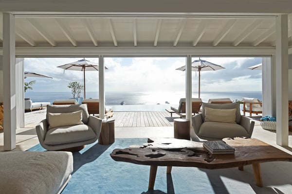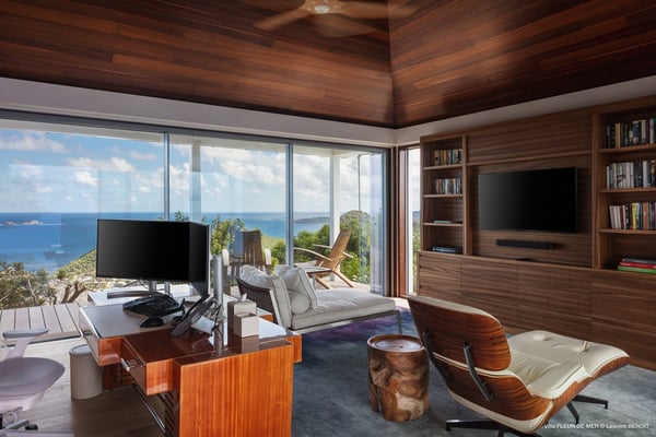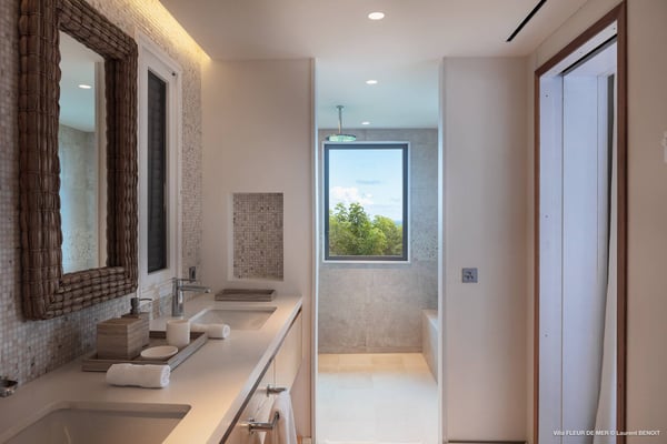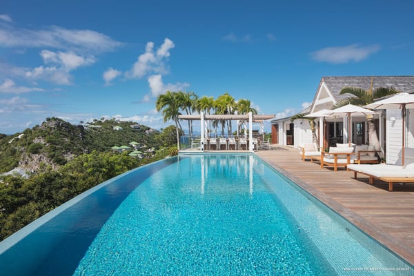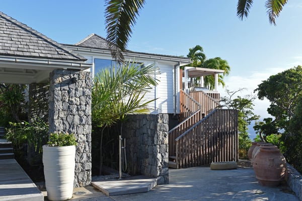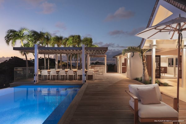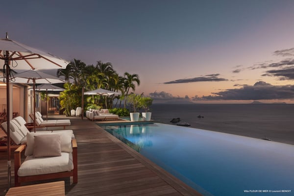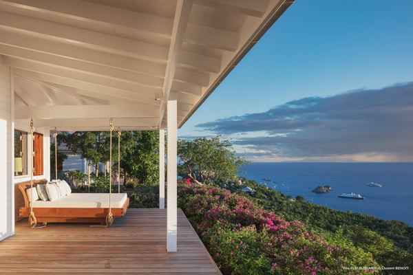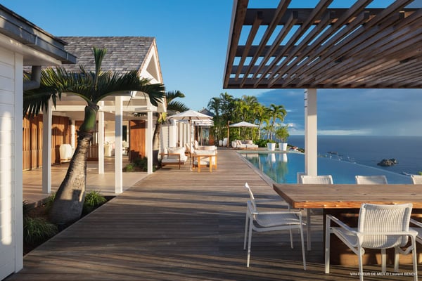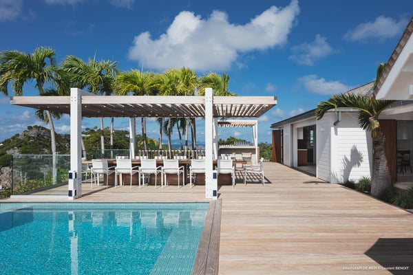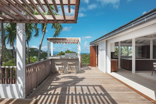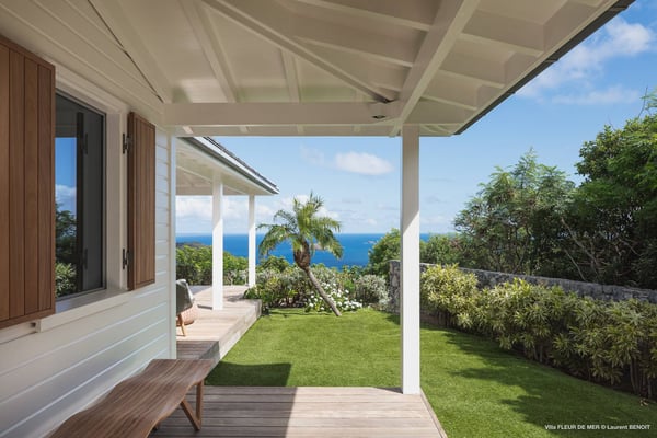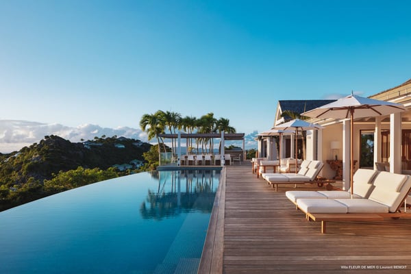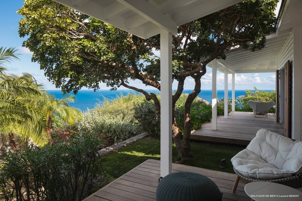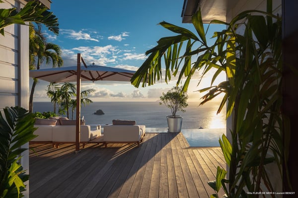 As you enter Villa Fleur de Mer, the gentle sound of water cascading down beside the walkway signals that it is time to relax. You have arrived at the modern version of true colonial grandeur, richly appointed with fine furniture and art--and with a view like no other, an unforgettable expanse of sea and sky so captivating that you can hardly tear yourself away to look at anything else. To update a traditional style, Villa Fleur de Mer is not isolated from nature but integrated with it. A tyrant bird hops across the terrace in pursuit of an errant butterfly. This is a home equally well adapted to the weary traveller seeking peace and quiet or to the host with visions of elegant dinner parties. Step out onto the terrace and imagine yourself sitting down to breakfast at the table between the pool and the palm grove, the most extraordinary view on the entire island stretched out before you. Across the vast expanse of turquoise water, you can make out the islands of Saba and Statia on the horizon. Below you, sailboats out of Gustavia harbour ply the calm sea toward Colombier Beach or Tintamarre. Turn and gaze across the courtyard, through the silhouette of a gaiac tree, you have a view to the east as well, a true panorama. After a pleasant morning spent poolside, you may retreat from the noonday sun into the open living room, still just steps from the refreshing waters of the travertine-tiled infinity pool, one of the largest on the island. Or you can find a shady spot on the master bedroom terrace, surrounded by a drift of bougainvillea blossoms. The master bedroom offers the comfort of a grand four-poster bed. His-and-hers dressing rooms lead into separate bathrooms, complete with two rain-head showers, one inside and the other outside, sheltered by flowering bird-of-paradise plants. Between the master bedroom and the main house of Villa Fleur de Mer, you find the library, furnished with dark wood shelves lined with books, a sumptuous sofa, a flatscreen television and a surround-sound stereo. As throughout the house, the walls are adorned with fine prints of Caribbean flora and fauna. Cross the courtyard from the living area to the four-bedroom suites, each with its own private bath and terrace. These bedrooms offer expansive views to the north and east, from Anse de Flamands and the tiny islands offshore to the far-off hilltops of the island's cote sauvage. The rooms are tastefully decorated with Kenzo fabrics and colonial furniture, and the bathrooms welcome you with soothing tones of polished limestone. Villa Fleur De Mer's elegant dining room provides seating for twelve, with the adjoining kitchen hidden from view in a nod to the refinement of colonial tradition--a use of space perfectly designed for catered parties. The most discerning chef will feel at home in the well-appointed kitchen, with dual SubZero refrigerators, a wine cooler and icemaker, twin Bosch dishwashers and a Lacanche Cote d'Or range. The gas grill on the terrace just outside the kitchen will come to mind whenever you pass the Boucherie de St. Jean on your way home. The cabinets are stocked with service for dozens of guests. Follow a path through the garden to find a hidden, self-contained guest bath accessible without passing through any of the bedrooms. And just steps away, one of the island's best-equipped fitness rooms awaits the motivated with a full complement of Cybex and Life Fitness machines, including twin top-of-the-line Flex Deck treadmills. Whereas many villas' exercise rooms are merely an afterthought, this one clearly is not, with mirrored walls, a full bath, stereo and intercom, a private terrace and of course an exquisite view of the Atlantic.