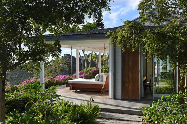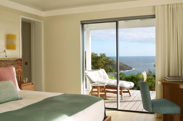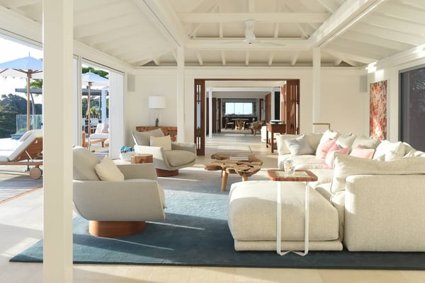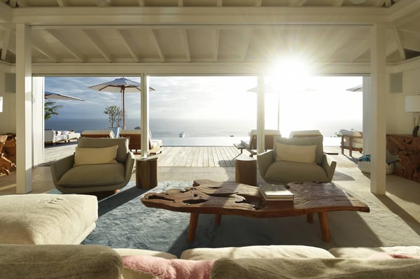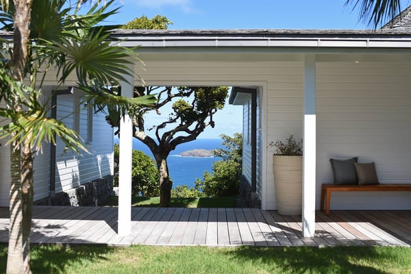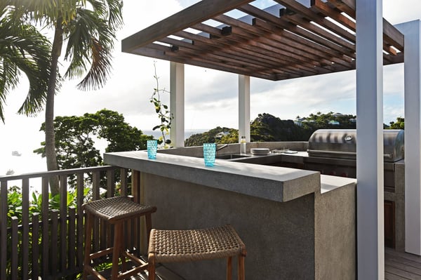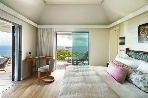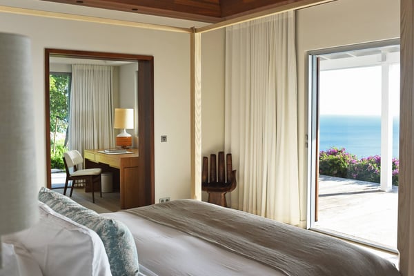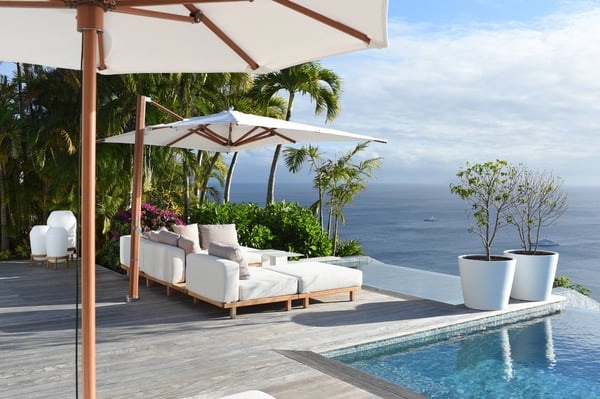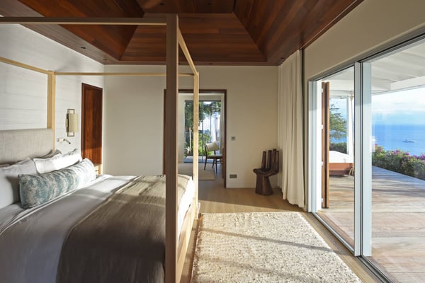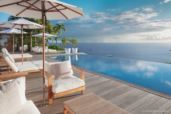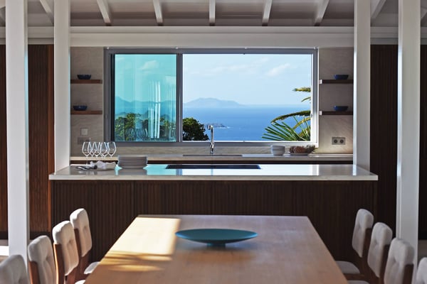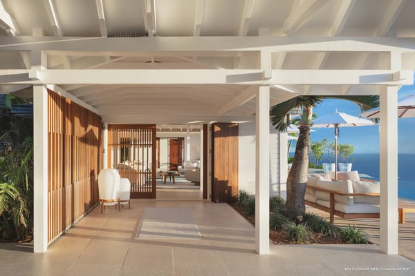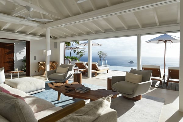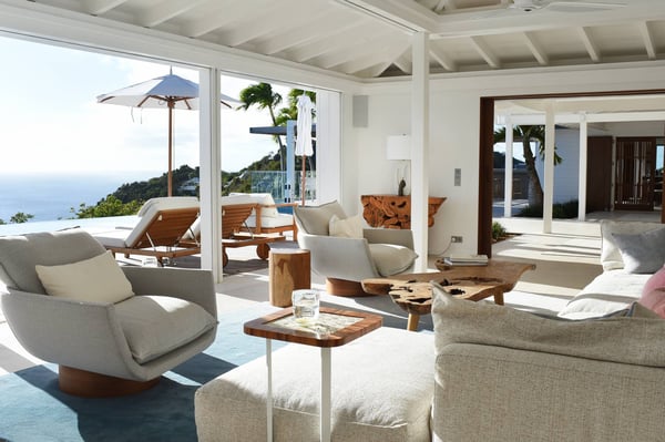 As you enter Villa Fleur de Mer, the gentle sound of water cascading down beside the walkway signals that it is time to relax. You have arrived at the modern version of true colonial grandeur, richly appointed with fine furniture and art--and with a view like no other, an unforgettable expanse of sea and sky so captivating that you can hardly tear yourself away to look at anything else. To update a traditional style, Villa Fleur de Mer is not isolated from nature but integrated with it. A tyrant bird hops across the terrace in pursuit of an errant butterfly. This is a home equally well adapted to the weary traveller seeking peace and quiet or to the host with visions of elegant dinner parties. Step out onto the terrace and imagine yourself sitting down to breakfast at the table between the pool and the palm grove, the most extraordinary view on the entire island stretched out before you. Across the vast expanse of turquoise water, you can make out the islands of Saba and Statia on the horizon. Below you, sailboats out of Gustavia harbour ply the calm sea toward Colombier Beach or Tintamarre. Turn and gaze across the courtyard, through the silhouette of a gaiac tree, you have a view to the east as well, a true panorama. After a pleasant morning spent poolside, you may retreat from the noonday sun into the open living room, still just steps from the refreshing waters of the travertine-tiled infinity pool, one of the largest on the island. Or you can find a shady spot on the master bedroom terrace, surrounded by a drift of bougainvillea blossoms. The master bedroom offers the comfort of a grand four-poster bed. His-and-hers dressing rooms lead into separate bathrooms, complete with two rain-head showers, one inside and the other outside, sheltered by flowering bird-of-paradise plants. Between the master bedroom and the main house of Villa Fleur de Mer, you find the library, furnished with dark wood shelves lined with books, a sumptuous sofa, a flatscreen television and a surround-sound stereo. As throughout the house, the walls are adorned with fine prints of Caribbean flora and fauna. Cross the courtyard from the living area to the four-bedroom suites, each with its own private bath and terrace. These bedrooms offer expansive views to the north and east, from Anse de Flamands and the tiny islands offshore to the far-off hilltops of the island's cote sauvage. The rooms are tastefully decorated with Kenzo fabrics and colonial furniture, and the bathrooms welcome you with soothing tones of polished limestone. Villa Fleur De Mer's elegant dining room provides seating for twelve, with the adjoining kitchen hidden from view in a nod to the refinement of colonial tradition--a use of space perfectly designed for catered parties. The most discerning chef will feel at home in the well-appointed kitchen, with dual SubZero refrigerators, a wine cooler and icemaker, twin Bosch dishwashers and a Lacanche Cote d'Or range. The gas grill on the terrace just outside the kitchen will come to mind whenever you pass the Boucherie de St. Jean on your way home. The cabinets are stocked with service for dozens of guests. Follow a path through the garden to find a hidden, self-contained guest bath accessible without passing through any of the bedrooms. And just steps away, one of the island's best-equipped fitness rooms awaits the motivated with a full complement of Cybex and Life Fitness machines, including twin top-of-the-line Flex Deck treadmills. Whereas many villas' exercise rooms are merely an afterthought, this one clearly is not, with mirrored walls, a full bath, stereo and intercom, a private terrace and of course an exquisite view of the Atlantic.
