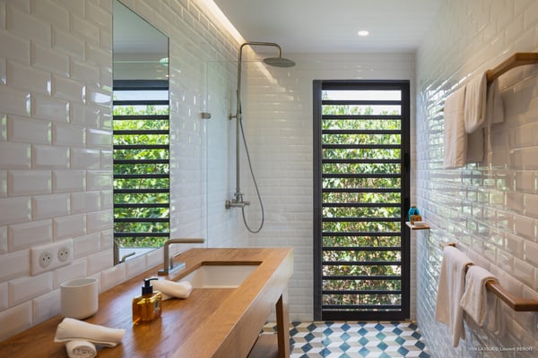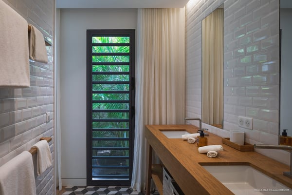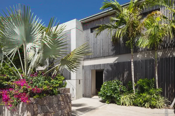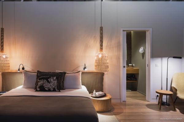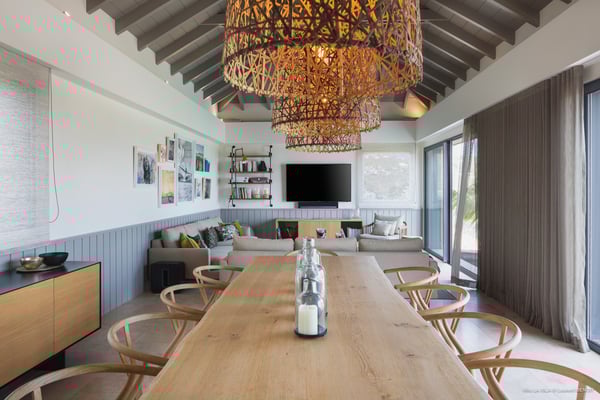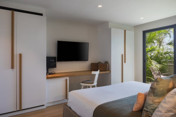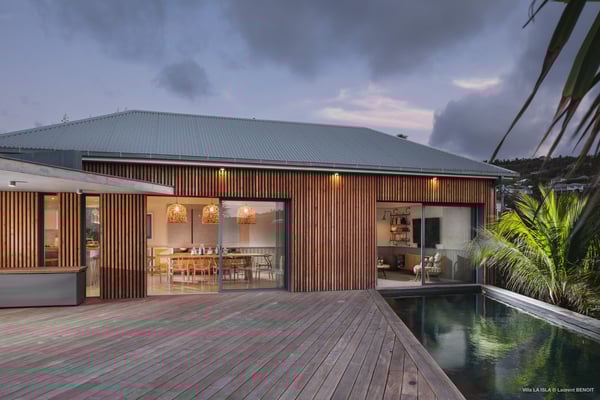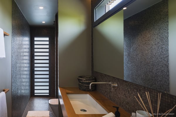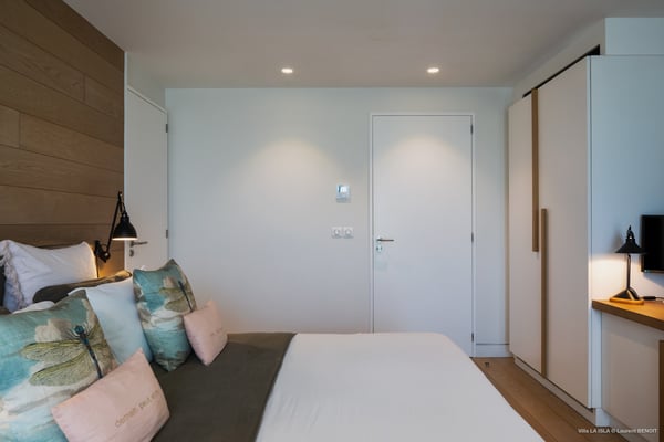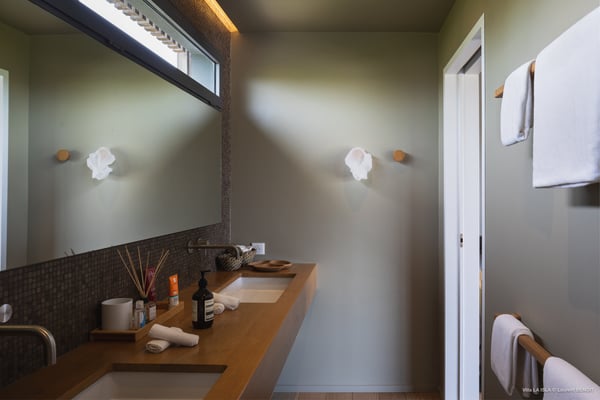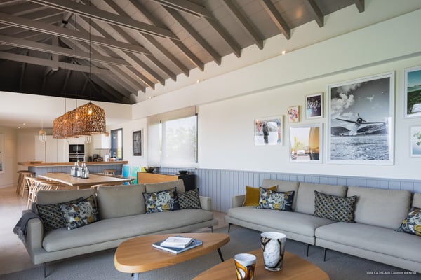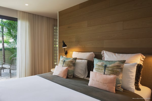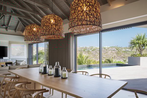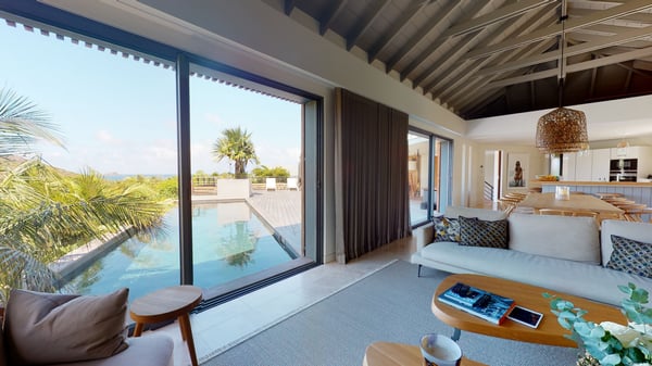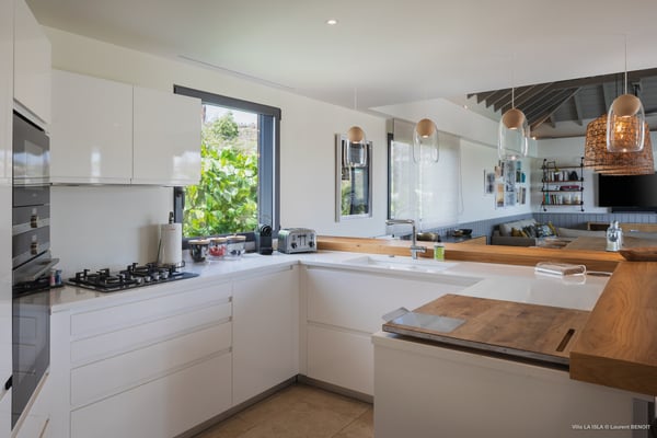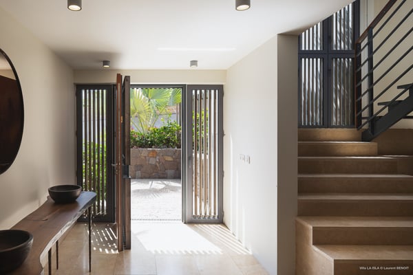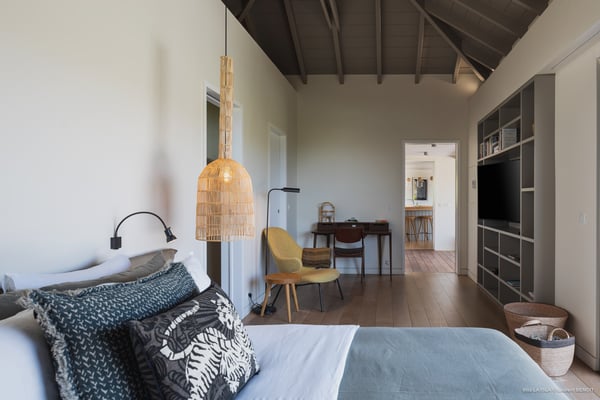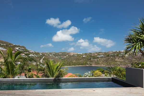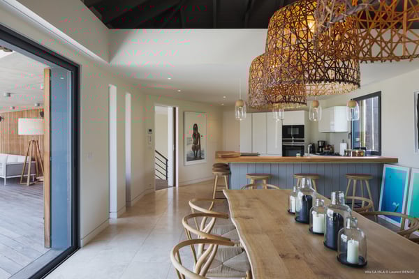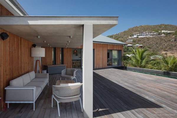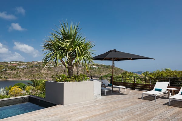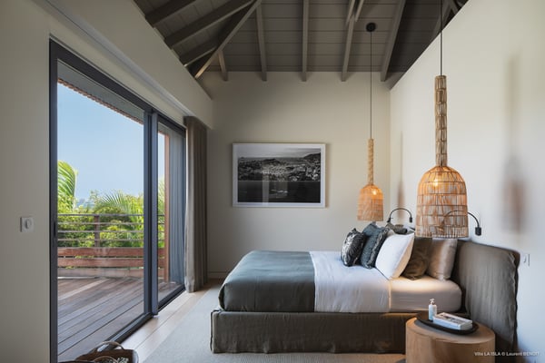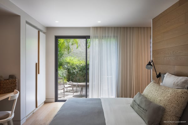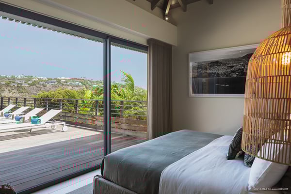 Villa La Isla is a luxurious property ideally located in Marigot in a lovely tropical environment in front of the bay. Very spacious and swept by the gentle ocean breeze, this four-bedroom vacation rental is the perfect place for an unforgettable vacation with family or friends in St. Barths. Built over two levels, the sumptuous villa La Isla welcomes guests in large spaces open onto the terrace, with wooden cladding on the exterior walls bringing a warm touch to this contemporary place. In the living room, you will love the high vaulted ceilings above the lounge that opens onto the swimming pool and are furnished with comfy sofas, coffee tables and HDTV for pleasant movie nights. There is a large indoor dining room which can accommodate up to eight guests under beautiful lights, close to the well-equipped kitchen with a large breakfast bar and stools. Wood, soft cushions, taupe colours and shimmering lights create a delightful and most relaxing atmosphere in front of the large bay opening onto the terrace. The terrace of villa La Isla extends over a spacious wooden deck with a magnificent view over the wooded hills and Marigot bay. You will enjoy the translucent blue swimming pool for pleasant sessions under the island's sun, in the heart of palm trees blown by the gentle trade winds. A pleasant covered terrace runs along the villa’s front, furnished with a very comfortable outdoor lounge, perfect to relax or sip a cocktail while admiring the view. Sun loungers with large umbrellas are also available by the swimming pool, overlooking the bay and the green hills in an idyllic tropical scenery. The vacation rental villa La Isla consists of four bedrooms with en-suite bathrooms. All are furnished with king-size beds and are decorated with bright tones featuring a few gray and taupe hints. One bedroom is located on the main level, while the other three ones are on the lower level accessible via an interior staircase. They open onto furnished terraces, and have office areas and cushions that create a peaceful and soothing atmosphere, ideal to rest after beautiful days in St. Barths’ sun.