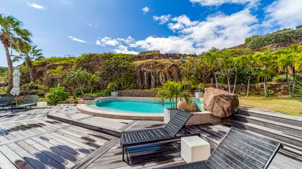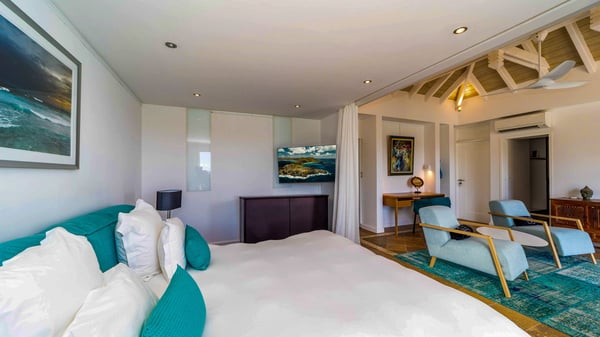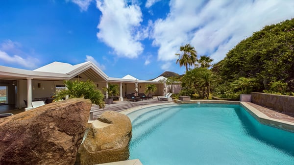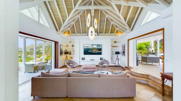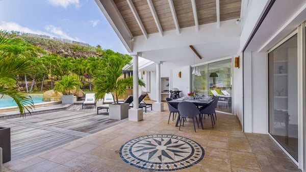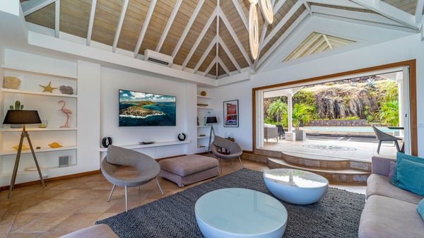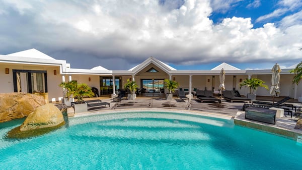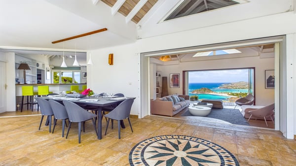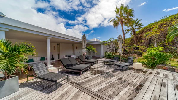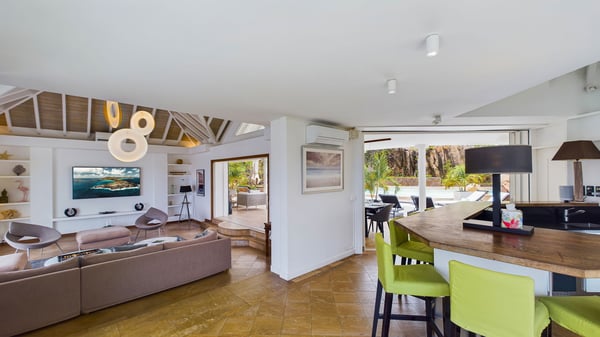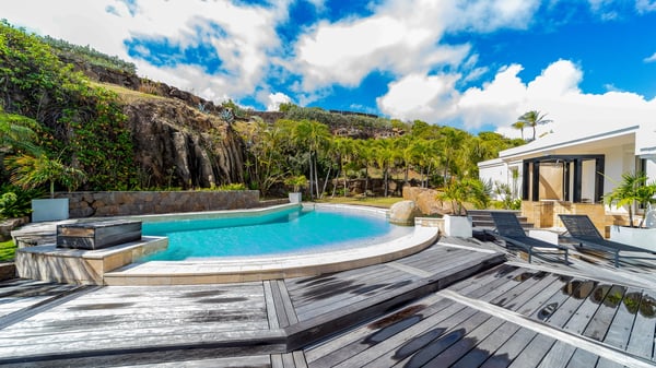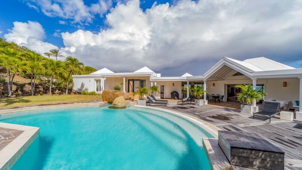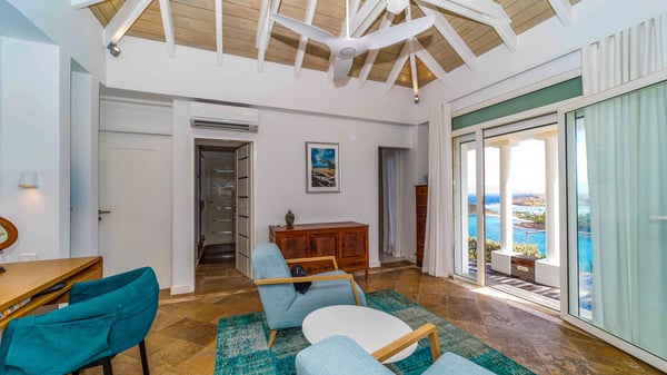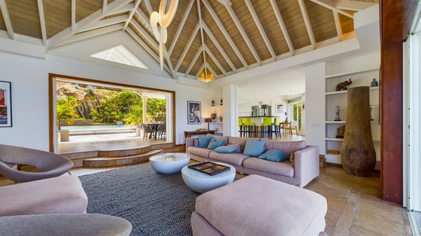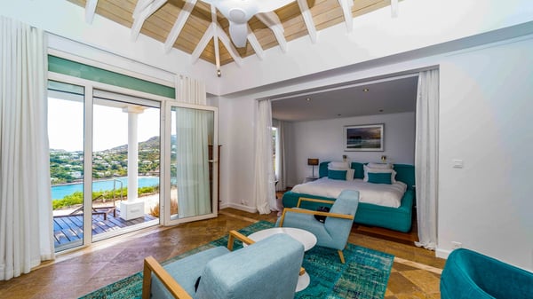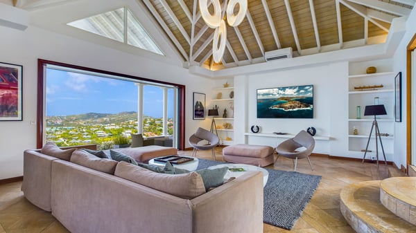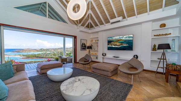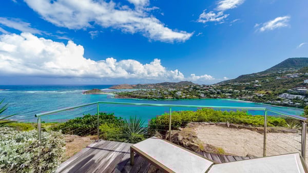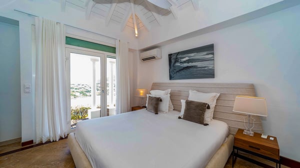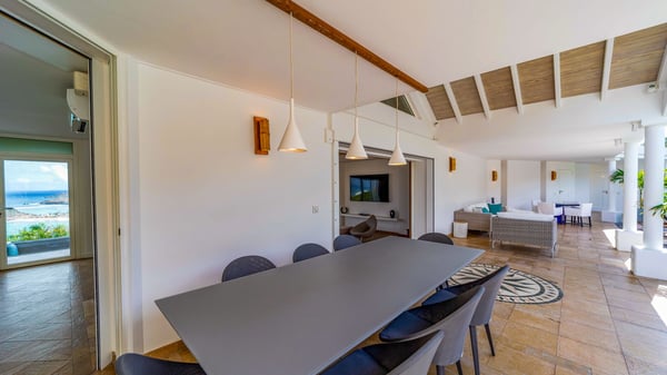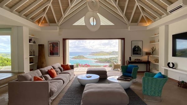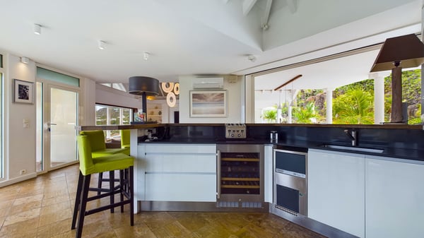 Nearby construction may result in noise disturbances. For further details on how this might affect your stay, please reach out to a Rental Escapes villa specialist. Located in the private estate of Mont-Jean, the vacation rental villa Arrow Marine offers upscale amenities for a most luxurious and romantic vacation in St-Barths. With four comfortable bedrooms and breathtaking ocean views, this vacation home is the perfect place for an unforgettable stay with family and friends in the Caribbean. Spacious and bright, this contemporary-style vacation rental in St Barths opens onto a breathtaking ocean view. Under the beautiful vaulted ceiling, the living room welcomes guests with comfortable sofas and coffee tables in a refined style. The spacious, fully-equipped kitchen allows you to cook delicious meals or to call upon a private chef. There is also a breakfast bar with eight modern stools for pleasant chatting over a coffee. Open both onto the front and onto the back of the villa, the living room is gently swept by the trade winds, in a serene and peaceful atmosphere. Villa Arrow Marine was built in an original architecture: a splendid semi-circular swimming pool is located at the back of the villa in a lovely green oasis. Around the pool, there are lounge chairs and benches covered with cushions for relaxing sessions under the St-Barths’ sun. Lush palm trees and a beautiful green lawn provide a vegetal touch to this idyllic scenery, close to the outdoor shower perfect to cool off on sunny afternoons. What’s more, at the front of the villa, you will love taking time to admire the outstanding panorama, surrounded by the green hills of St. Barths, from the lovely covered terrace furnished with a comfy outdoor lounge, in front the sparkling ocean. The holiday rental Arrow Marine consists of four air-conditioned bedrooms with en-suite bathrooms. Each bedroom has a king-size bed, except the fourth one which has twin beds. Dressing rooms, sitting areas, soft sheers and beautiful views over the vegetation and the ocean make it a dream setting for an unforgettable vacation in St. Barths. Groups of friends will be delighted to rent a fifth bedroom in the luxurious vacation villa ALPHANE which is located close to villa Arrow Marine to form a very private complex.
