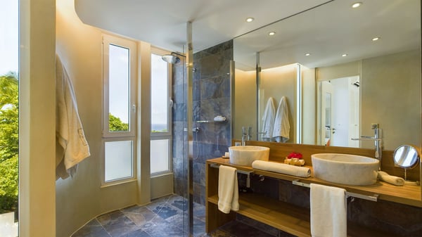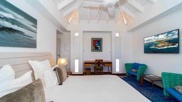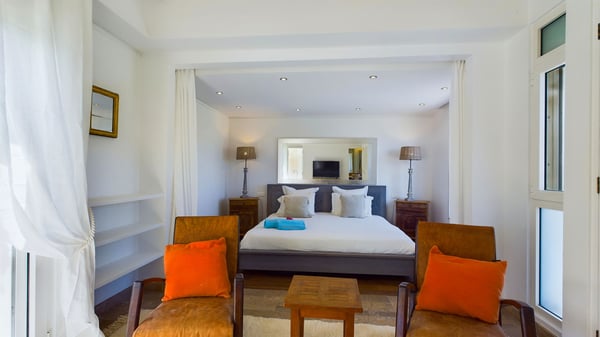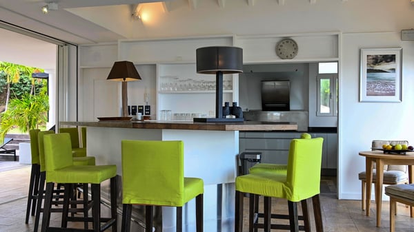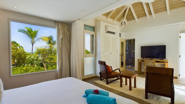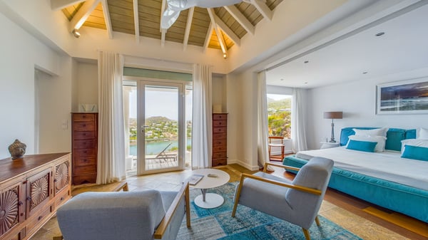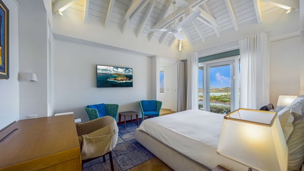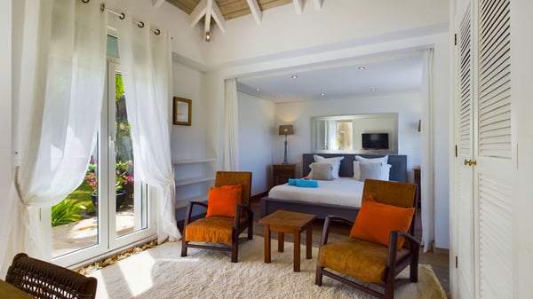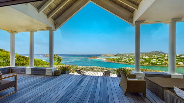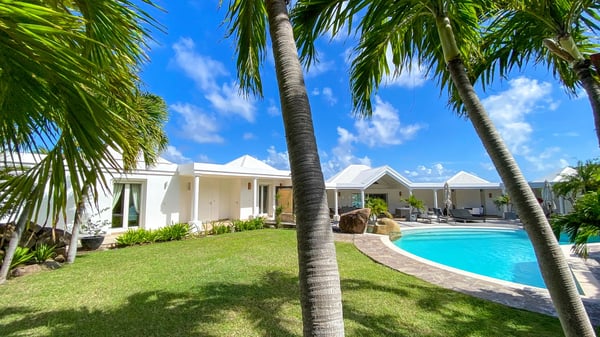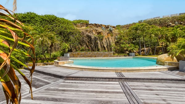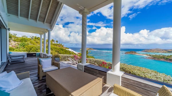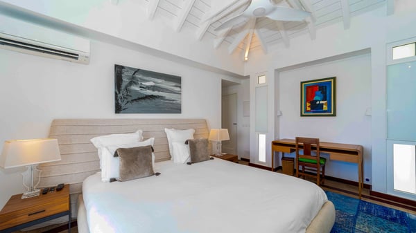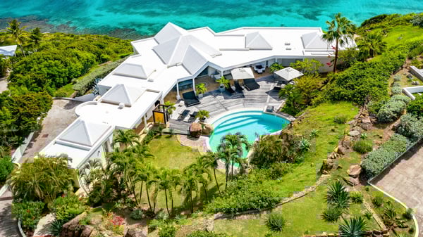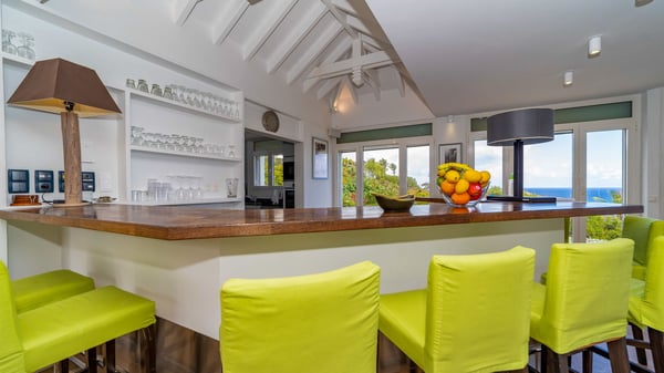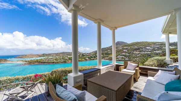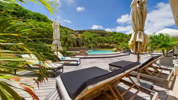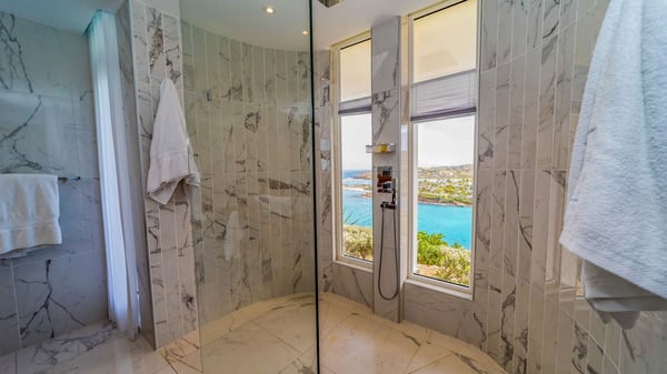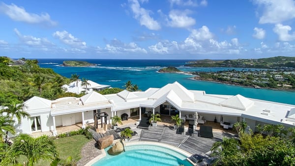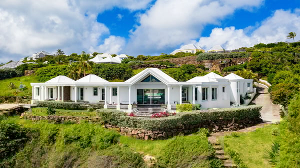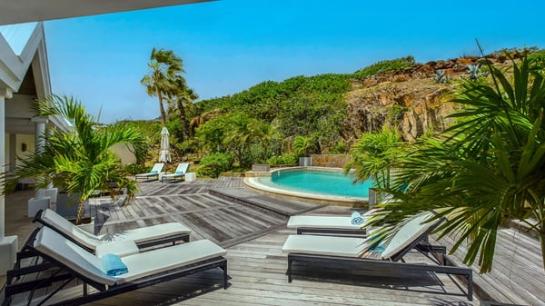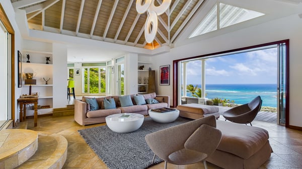 Nearby construction may result in noise disturbances. For further details on how this might affect your stay, please reach out to a Rental Escapes villa specialist. Located in the private estate of Mont-Jean, the vacation rental villa Arrow Marine offers upscale amenities for a most luxurious and romantic vacation in St-Barths. With four comfortable bedrooms and breathtaking ocean views, this vacation home is the perfect place for an unforgettable stay with family and friends in the Caribbean. Spacious and bright, this contemporary-style vacation rental in St Barths opens onto a breathtaking ocean view. Under the beautiful vaulted ceiling, the living room welcomes guests with comfortable sofas and coffee tables in a refined style. The spacious, fully-equipped kitchen allows you to cook delicious meals or to call upon a private chef. There is also a breakfast bar with eight modern stools for pleasant chatting over a coffee. Open both onto the front and onto the back of the villa, the living room is gently swept by the trade winds, in a serene and peaceful atmosphere. Villa Arrow Marine was built in an original architecture: a splendid semi-circular swimming pool is located at the back of the villa in a lovely green oasis. Around the pool, there are lounge chairs and benches covered with cushions for relaxing sessions under the St-Barths’ sun. Lush palm trees and a beautiful green lawn provide a vegetal touch to this idyllic scenery, close to the outdoor shower perfect to cool off on sunny afternoons. What’s more, at the front of the villa, you will love taking time to admire the outstanding panorama, surrounded by the green hills of St. Barths, from the lovely covered terrace furnished with a comfy outdoor lounge, in front the sparkling ocean. The holiday rental Arrow Marine consists of four air-conditioned bedrooms with en-suite bathrooms. Each bedroom has a king-size bed, except the fourth one which has twin beds. Dressing rooms, sitting areas, soft sheers and beautiful views over the vegetation and the ocean make it a dream setting for an unforgettable vacation in St. Barths. Groups of friends will be delighted to rent a fifth bedroom in the luxurious vacation villa ALPHANE which is located close to villa Arrow Marine to form a very private complex.