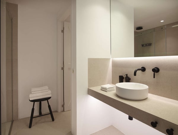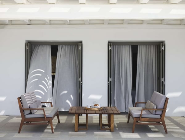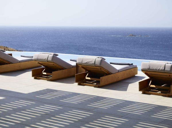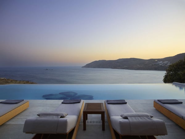 Blue Emerald is the most astonishing villa as it can lavishly offer the sense of home in many ways: comfort, privacy, spaciousness, and relaxation. Its facilities are one of a kind. Emerald has an outstanding 2000 sq. meters of outdoor space, a large gym and spa area of about 100 sq. meters, two infinity swimming pools of 100 sq. meters each, and outdoor shaded areas of over 700 sq. meters. Plot area in total is about 4500 sq. meters. The spacious and exceptional facilities are suitable for organizing high-end events. On the other hand, you can also enjoy tranquility and relaxation due to its secluded location and endless sea view. It’s built on top of the sea, in just a walking distance of 1-3 minutes from Kalo Livadi beach.