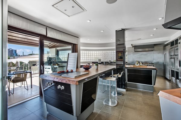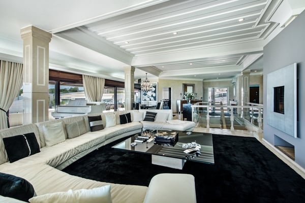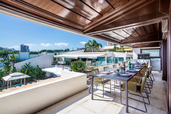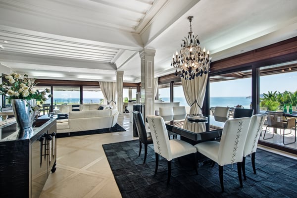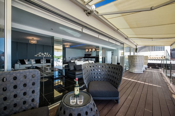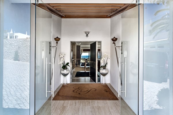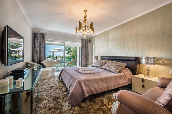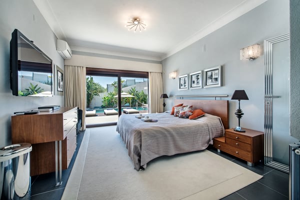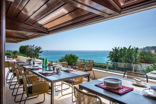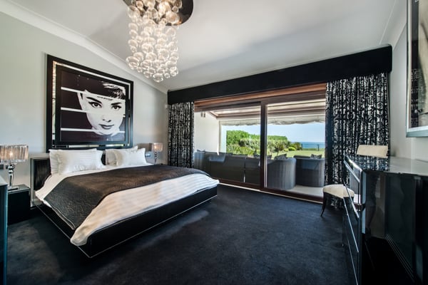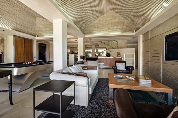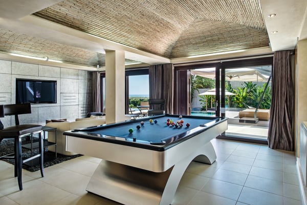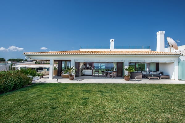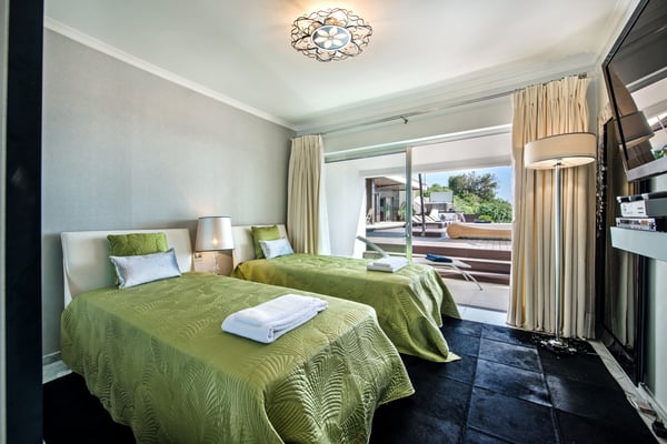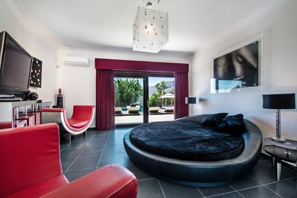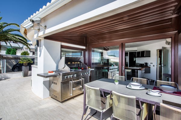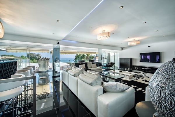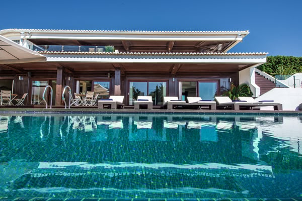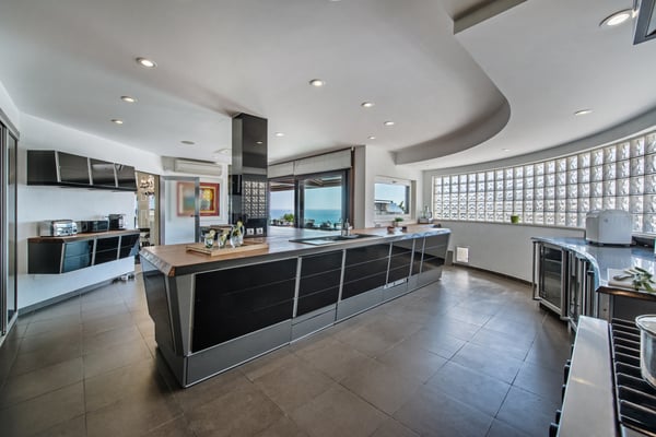The property is accessed via a secure gated driveway with plenty of parking. The main entrance is a large Italian vaulted door which opens to an expansive open plan living/dining area with hugely impressive seaviews and a Baby Grand Piano for company. From this area there are french doors to a covered terrace and alfresco dining area with panoramic views. Look forward to lively dining by day on the professional gas barbecue, to relaxed meals by night, with the twinkling lights of local fishing boats as the backdrop. The spacious kitchen has been designed with the latest in technology including an inside breakfast bar and grill facility. The kitchen is fully equipped and the extensive list of facilities include an American fridge and an American fridge/freezer, four wine coolers, microwave, dishwasher, gas oven, steam oven, electric oven, large stove with gas burners, kettle, toaster, juice maker… and the all-important Nespresso coffee machine! On a lower level (stairs down), there is a sitting area with SKY TV, DVD, Bose sound system and an Ipod connection. There is a fully equipped gym with 100” plasma TV with CD/DVD player and sound system available. Next to the Gym there is a guest shower room. A pool table and a bar create yet another refuge in which to relax. Hidden inside a cupboard there is a small kitchen equipped with fridge/freezer and icemaker so refreshment is never far away! There are eight bedroom suites in total, each with TV. There are five ensuite double bedrooms in the main house and three ensuite bedrooms (two doubles, one twin) in the guesthouse, which is built on two levels and also has a lounge area. There is also a bar and covered terrace with sea views. The expansive African suite in the main house has a unique motorized glass ceiling which opens at the touch of a button allowing bathing under the stars in true James Bond style! The infinity pool (16m x 6m) made with Italian Bisazza tiling is a true highlight – relax on the underwater bar stools or perhaps in the poolside jacuzzi. There is a motorized cover and on request, the pool can be heated. The pool is chlorine free (saline). The property is fully air conditioned and has WiFi throughout. The villa is located at the top of a cliff overlooking the ocean so naturally the boundaries should be respected (please do not step outside the fenced area). On the edge of the cliff there is a public footpath so occasional intrepid walkers may pass by.