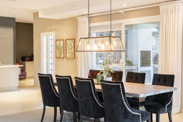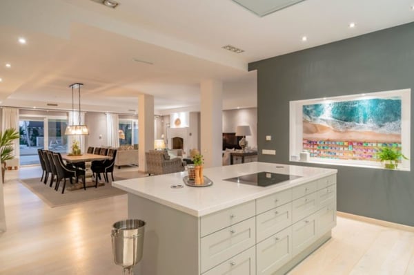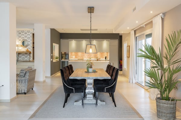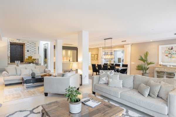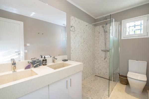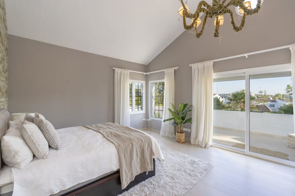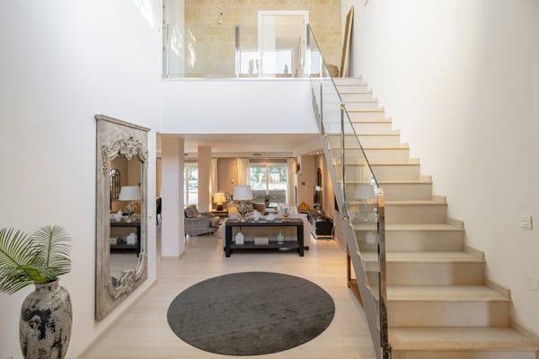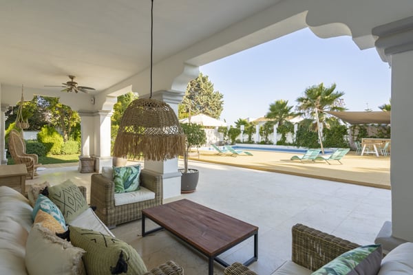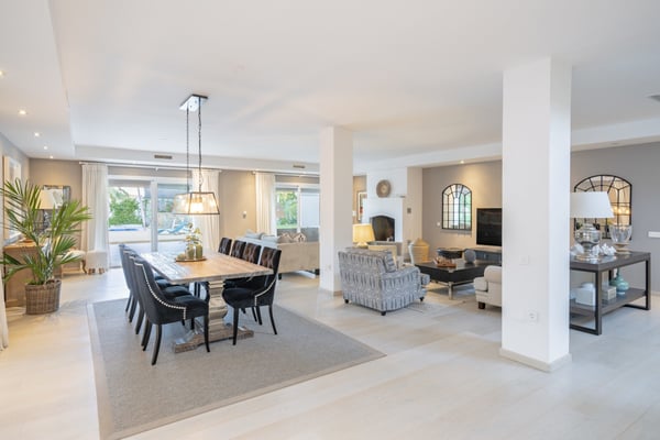 This six-bedroom villa offers elegance and refinement to twelve guests in one of Marbella's most sought-after areas, close to all amenities, the coast and top-golf courses. This property is spacious and decorated in a modern style, making the most of its large open-plan living space. The grounds are large and perfectly maintained, sunny gardens, with several covered terraces furnished with high-quality furniture for your al fresco dinners or relaxing moments during your holiday on the Costa del Sol. You will find maintained gardens with mature trees and plants and lawn areas. A decked swimming pool area with shower and changing facilities, large private pool (with Roman steps) and covered terraces with elegant outdoor living furniture, an al-fresco dining area and summer kitchen, BBQ. Parking for at least three cars under the carport area with pergola.