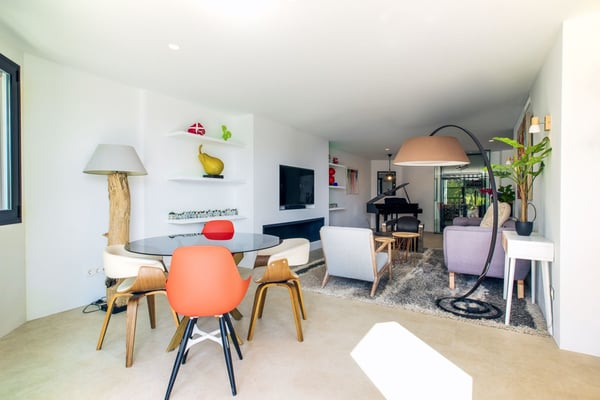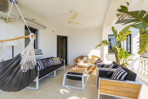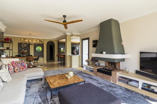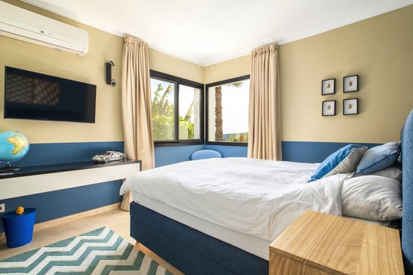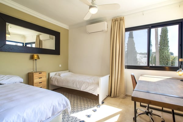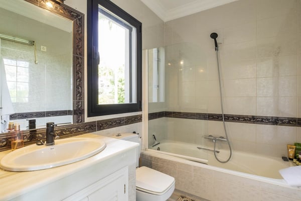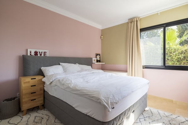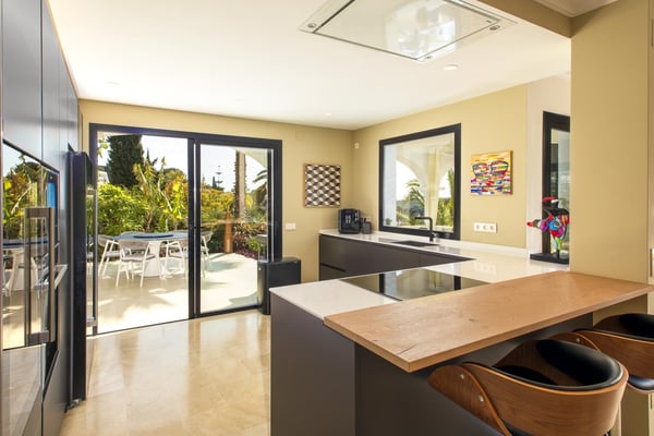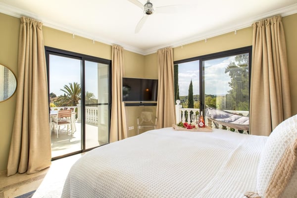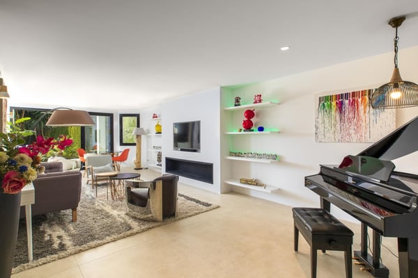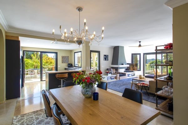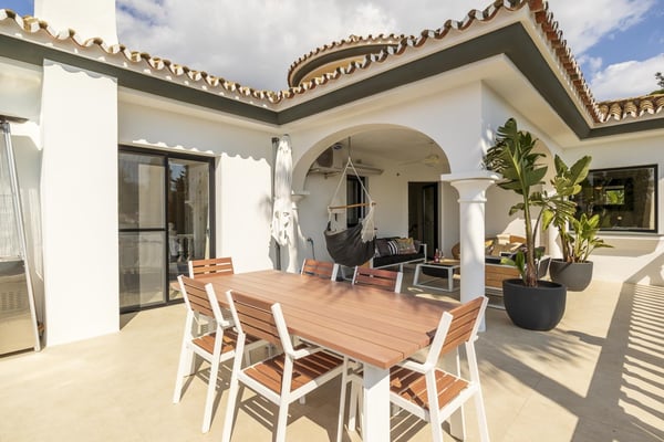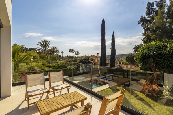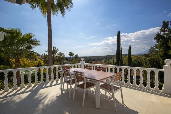 San Pedro's golden beaches are a mere five-minute drive from this villa and Puerto Banus ten minutes away. With a golf course within walking distance and shops, and restaurants just over a kilometer away your holiday at this modern property will be relaxing and enjoyable for all members of your party. Three furnished terraces afford amazing views over the valley, the mountains and the Mediterranean Sea towards Gibraltar and Africa, maximizing the outdoor space. A large room with piano, home cinema, a private pool surrounded by manicured gardens and spectacular views are some of the highlights of this luxury Marbella villa. Private, manicured gardens with hedgerows and lawn areas. Pool decked terrace, private heatable pool (Roman steps), outdoor shower, four sun loungers, round sunbed, bar area. Views. Covered parking for three cars.