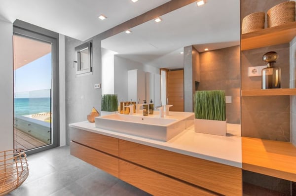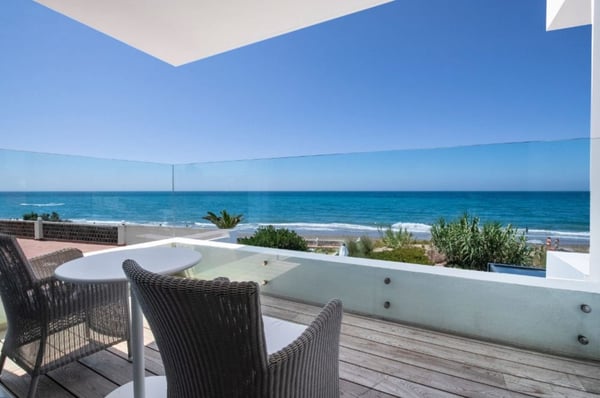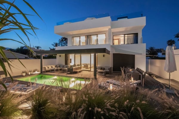 This luxury contemporary villa sits on the beachfront of Elviria, between Malaga and Marbella, with direct access to the beach and close to all renowned sandy beaches in Marbella, including Nikki Beach. It boasts a private swimming pool, sauna and a stunning roof terrace equipped with bar and BBQ for your unforgettable al fresco dinners, with the addition of a jacuzzi tub from which to enjoy some striking sunsets. The accommodation spreads over four floors, connected with an elevator. The house is equipped with high-speed internet, a Sonos Music System, an advanced alarm system, air conditioning with individual room control, under-floor heating in every room and a television in every bedroom with international and Spanish channels. Open plan kitchen and living area that opens out onto a large terrace with outdoor lounge and dining facilities, sunbeds, and a private pool. You will find six double en-suite bedrooms, some having private sea-facing terraces, and the primary suite featuring a stunning bathroom with a jacuzzi bath. The villa includes a garden with a private pool and sunbathing area. On the 150m2 roof terrace you have an eight seater jacuzzi and a new bar and BBQ area. From here you have a 360-degree sea and mountain view – the perfect place in which to find inspiration, enjoy sun-downers and alfresco dinners, and fully immerse yourself in the wonderful Mediterranean lifestyle. As you are right on the beach, you will be able to wake up to the sea air, have coffee and breakfast watching the waves, and then end the day sipping cocktails watching the sunset. Villa Playa is located in Elviria, 30 minutes’ drive from Malaga. This area boasts beautiful beaches and numerous acclaimed Chiringuitos, restaurants and bars, including Nikki Beach. There are supermarkets a plenty and you are only a short drive to Marbella and Puerto Banús to the west and 10 minutes’ drive to the bustling town of Fuengirola to the east. There are several restaurants in proximity, the closest is Luma (about 25 metres away) and is high quality, serving breakfasts, lunches and dinners. Supermarket also in walking distance.
