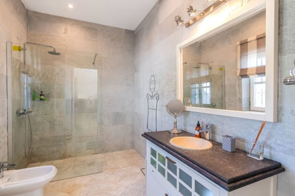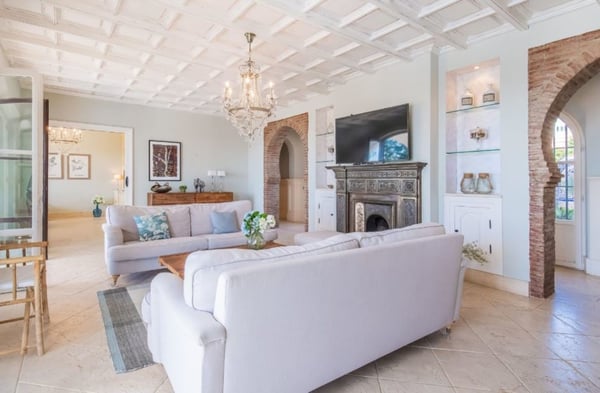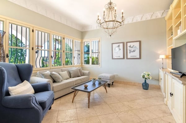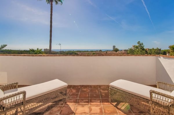 With its excellent situation in Elviria, just 250 metres away from a renowned Marbella Golf Club and a 20-minute walk from the beach, this refined Andalusia style villa with heated pool and Jacuzzi is ideal for a luxury holiday close to the cosmopolitan atmosphere and exciting nightlife of the Costa del Sol. As you walk along the beach you will find all kind of restaurants, bars and beach clubs and the typical Spanish chiringuitos (beach bars). Elviria is known for its charming centre as well as the wide selection of restaurants and bars. With a choice of over 50 different restaurants, various supermarkets and many bars in the area it is one of the most popular areas in Marbella. Marbella and the Historical Old Town is 11 km away and the famous harbour of Puerto Banús is a 15-minute drive. There you find boutiques & designer shops, exclusive yachts, fast cars, discotheques and bars and a plethora of restaurants. Designed in a typical Andalusian style, this villa boasts incredible charm and timeless elegance throughout, with decorative touches such as the hand-paved pebble decorated entrance, archways, water features and outdoor terraces. Large mature, south-facing garden fully furnished for outdoor living. Jacuzzi with views. The manicured garden is south-facing and therefore enjoys the sun throughout the day. Private pool, sunbathing terrace. Several terraces with lounge furniture and al fresco dining facilities. Sea views. Table tennis table. Parking for 4 cars.