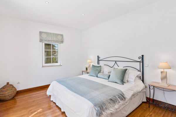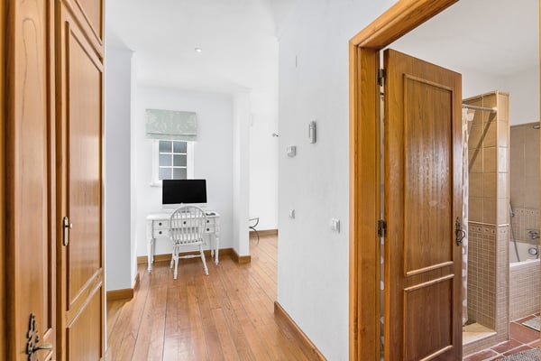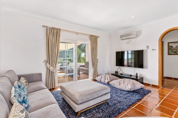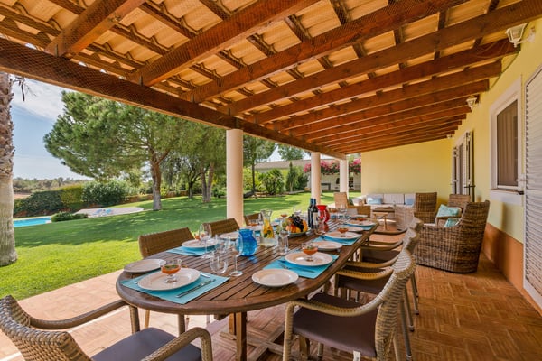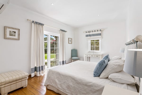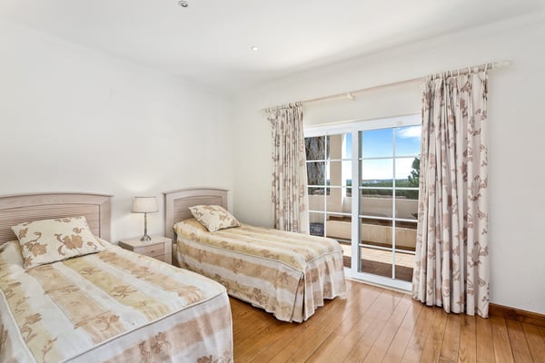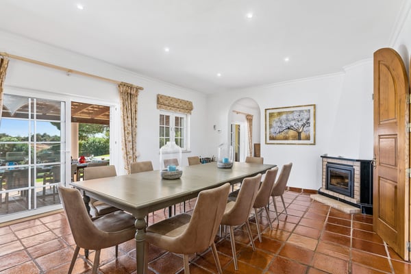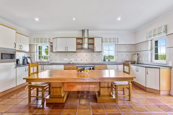 The villa sits on a private 40-acre plot planted with avocados and citrus trees. It is ideal for a large family or group of friends looking for rural seclusion, yet wanting to be close to good amenities including Nick Faldo´s new “Amendoeiras” golf course, only five minutes away from the villa. The interior is modern and full of natural light. There are mosquito nets on all secondary windows so that you can keep them open on hot days, whilst the main “French” windows are fitted with shutters and there is air-conditioning throughout the villa. All the bedrooms (three double and three twins) have en-suite bathrooms, chestnut wood floors, and under-floor heating. The other rooms have terracotta tiled floors and the large reception and dining rooms “French” windows open onto a covered terrace for eating outdoors, looking down to the beautiful garden with rockery, flowers, and shrubs but mostly laid to lawn and with pines trees providing plenty of shade. The garden and swimming pool (with the heating on request), outdoor shower, and barbecue area with pizza oven are enclosed by a natural stone wall which allows one to look out but provides total privacy. There is also a home gym and championship-size tennis court at the rear of the property and a shaded games area (table tennis and table football) plus parking for several cars. Silves is only a short distance away and offers several food shops, banks, and restaurants. This ancient Moorish castle town also hosts a number of different festivals throughout the summer, as well as housing a selection of good value and fun eateries and bars. There are several beaches and golf courses within a short driving distance.