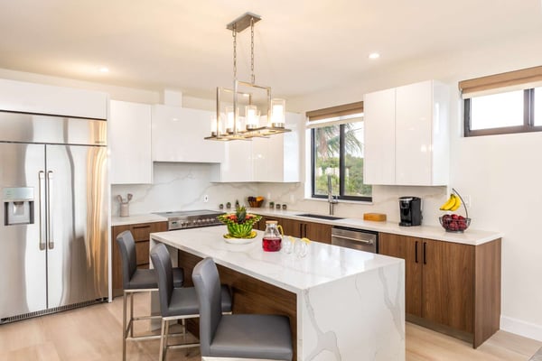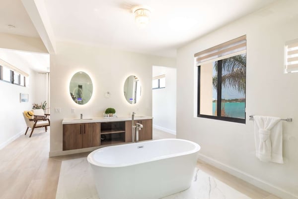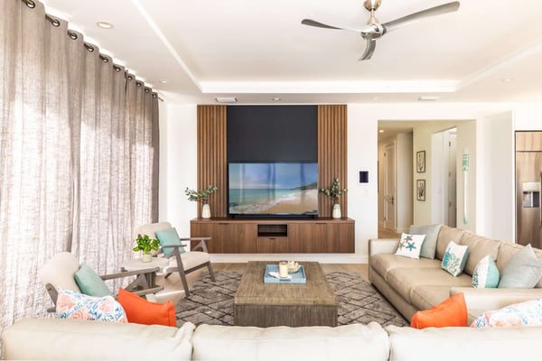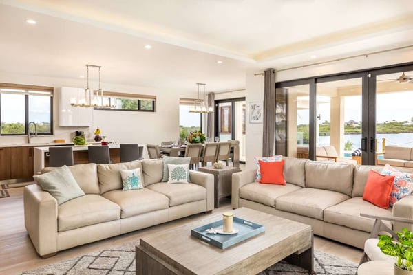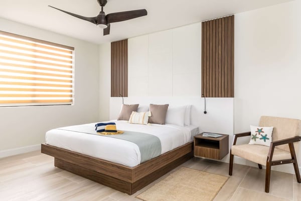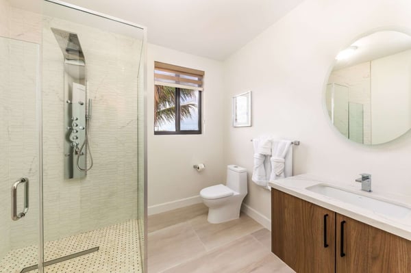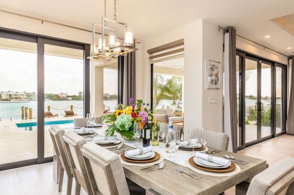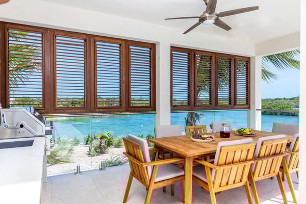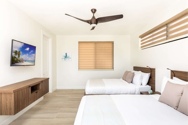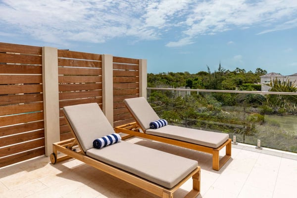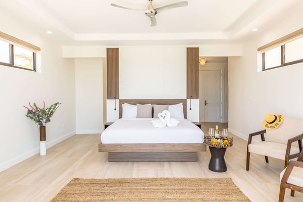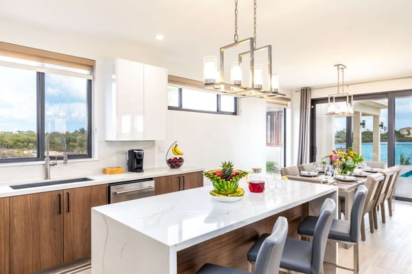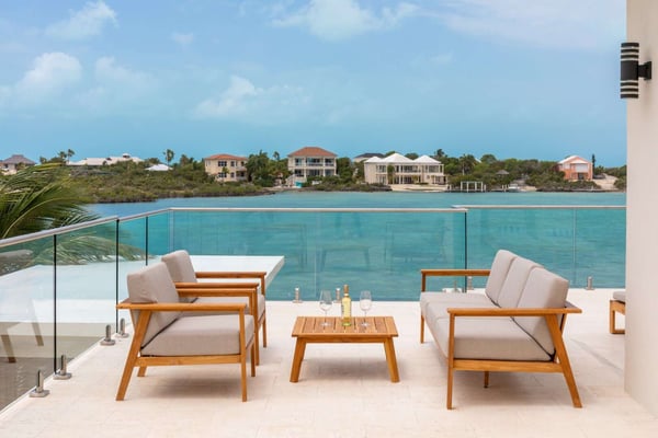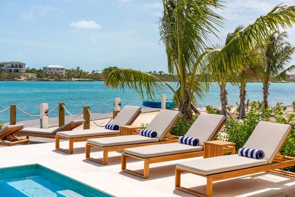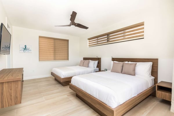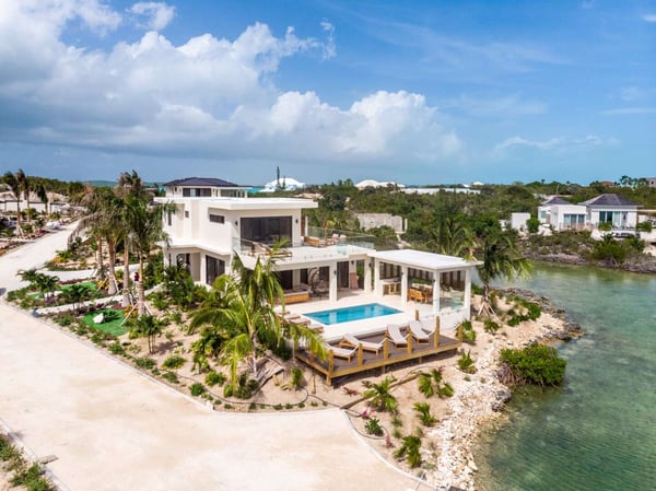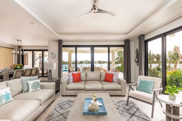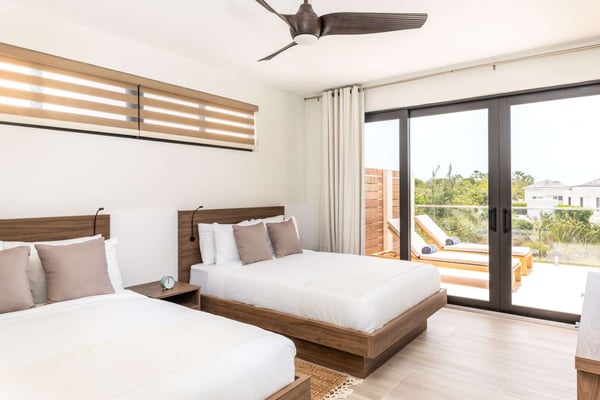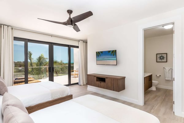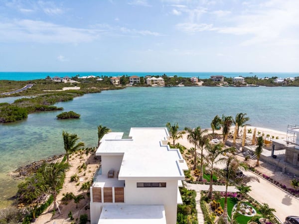 Sunny Bay Estates is located on a peninsula overlooking the warm waters of Silly Creek. This gated community offers four spectacularly appointed luxury vacation villas, white sandy beaches, private pools, kayaks, paddle boards and spectacular sunsets. Guests arriving at Sunny Bay Estates will receive a complimentary VIP shuttle to and from the airport. Upon arrival, you will be greeted by a butler and given a full orientation of this spectacular property and its amenities. Each guest will have access to an on-call butler and a daily turndown service. Sunny Bay Estate 4 is a luxurious four-bedroom, four-and-a-half-bathroom vacation home. Each room is awash with natural light and spectacular waterfront views. As you enter, you are greeted by a spacious open-concept kitchen with all stainless-steel appliances. The kitchen flows seamlessly into the spacious living room with a 55" TV. The best part of this space is that you have ocean views from all angles. The wall-to-wall sliding doors look out over the villas, covered and sun decks, where you are invited to grill, dine, or just lounge while enjoying your favourite music on the home's surround sound system. Also, located on the main floor is a spacious ground-level primary suite with a large primary bathroom and a king bed. Further down the hallway is a guest bedroom with a queen bed and an en-suite bathroom, and walk-in showers. Just up two flights of stairs, you will find the third guest bedroom. This bedroom has two queen beds, a private sundeck with seating as well as a spacious en-suite bathroom. Just across the hall is the primary suite. This space is truly the focus and high point of this villa. Guests enter through a double door to a spacious closet and a full-length mirror on their left. Do your right is a 200-square-foot bathroom with a luxurious stand-alone tub in the center. Also included in the master suite are his and her sinks, a spacious walk-in shower and a toilet with a bidet. Just past the master bathroom is the master bedroom with a king bed that looks straight through glass sliding doors and out onto the primary suite's private deck with chaise lounges and spectacular elevated views of Silly Creek.
