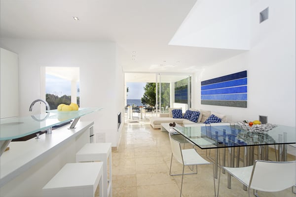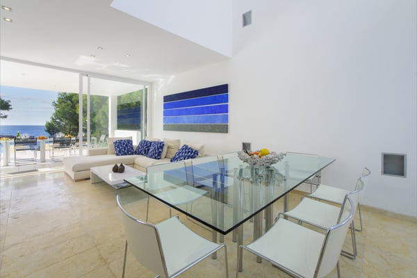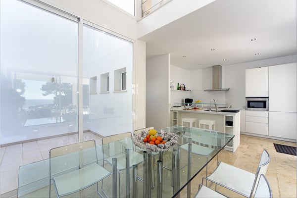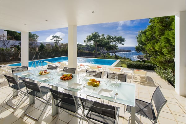 This is a modern, perfectly presented villa within walking distance of sandy coves, restaurants and boutique shops. The swimming pool has lawn areas leading to the rocky cove. This is one of the finest villas in this area. Located off of a quiet road in a residential area. The crystal clear swimming pool has spacious, comfortably furnished sun terraces with reclining sun loungers and is surrounded with immaculately maintained gardens. The barbeque terrace is adjacent and awaits your alfresco meals whilst enjoying chilled refreshing drinks. Enjoy siestas in the palm-shaded lawn gardens on comfortable sun loungers listening to the relaxing sounds of the sea. On entering is the main hallway leading to the impressive spacious lounge, comfortably furnished and has direct access to the covered poolside terrace. American style contemporary kitchen with all modern requirements including breakfast bar and direct access to a garden terrace. One double bedroom with fitted wardrobes, en-suite shower room and doorway to the seafront sun terrace. Second double bedroom with walk-in wardrobes and en-suite shower room and garden views. Third double bedroom with en-suite shower room and direct access to the garden sun terraces. Stairs lead up to the galleried landing area affording magnificent sea views from the huge upper terrace. Impressive master double bedroom suite with fitted wardrobes, en-suite shower, large living room with comfortable sofas, television, an interesting collection of books and direct access to the furnished upper sun terrace with fabulous sea views. Fifth double bedroom with fitted wardrobes, en-suite shower room and sea views. Sixth double bedroom with fitted wardrobes, en-suite shower room and direct access to the garden side terrace. All powder rooms are located outside the bedrooms - two on each floor.