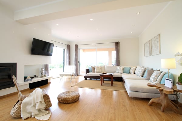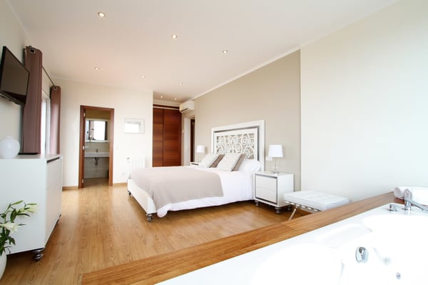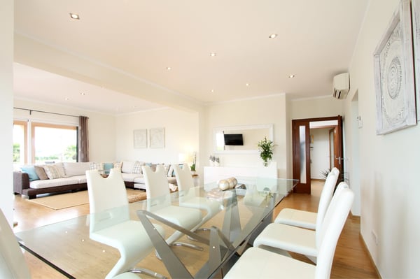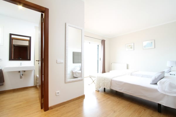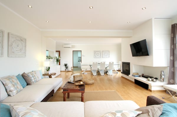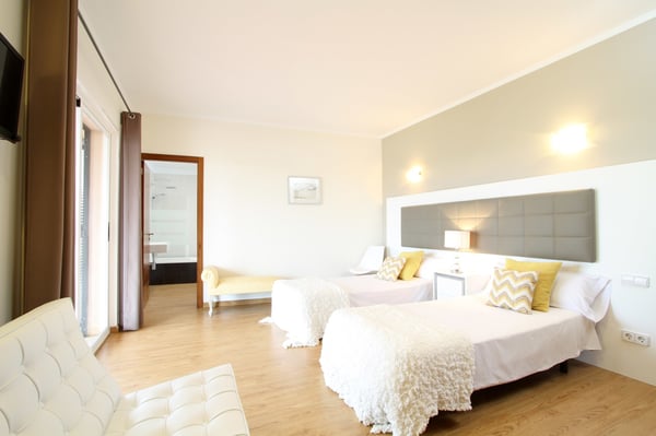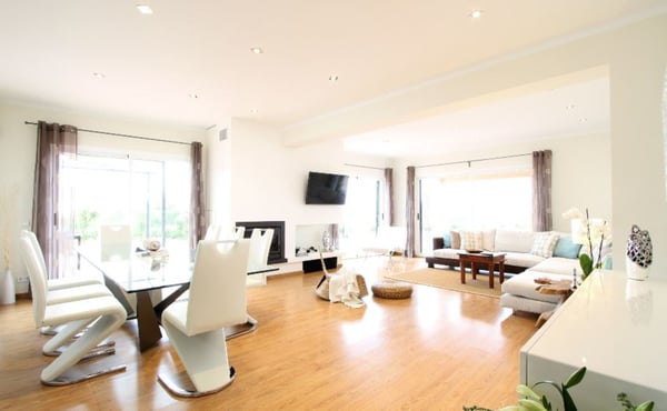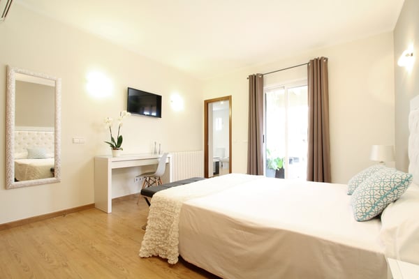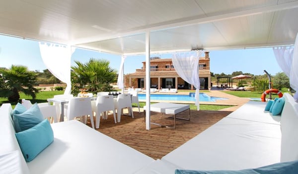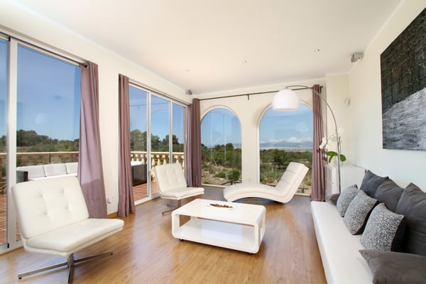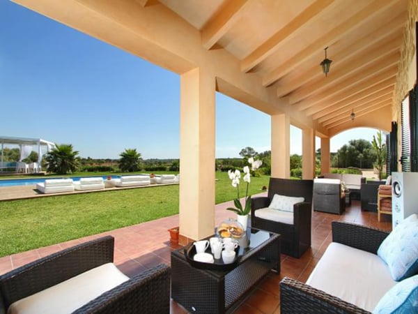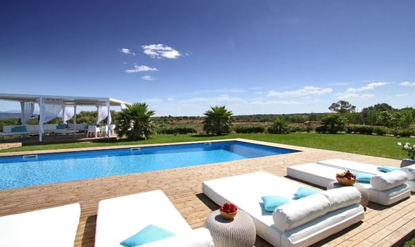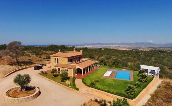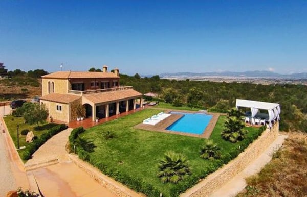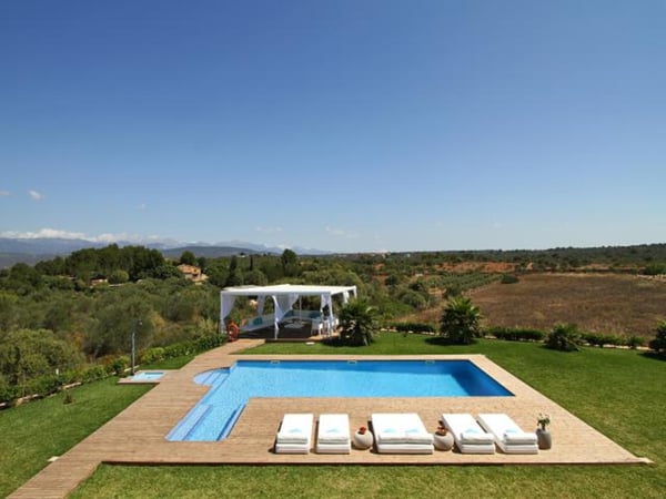 This is a stunning six bedroom luxury mansion featuring a delightful blend of traditional Mallorcan stone and terracotta tiles with ultra-modern minimalist chic. Sleeping up to 12 people in luxurious comfort, there are extensive grounds, a lush lawn and huge swimming pool which is illuminated at night. Cool, clean and super sleek yet so easy on the eye, this fabulous holiday home promises you a vacation you’ll remember forever. White walls are much in evidence here, as is dazzling white designer furniture; the wood laminate floor and chic charcoal furnishings making a nice contrast. Walk into the spacious living/dining area and you'll find cozy sofas to sink into, bright room-sized windows, a traditional fireplace, sleek, contemporary dining furniture and a huge, wall-mounted satellite TV. The kitchen area is naturally state-of-the-art. Fully equipped with all the latest appliances, there is also a dining area in which to enjoy a family meal. All the bedrooms are light, bright and airy and some lead out to the fabulous large balcony with great views of the Mallorca countryside and Mediterranean Sea. Altogether there are a total of six double beds plus 1 bunk bed, sleeping up to twelves guests. Several of the en-suite bathrooms feature elegant Jacuzzi-style baths with wonderful views of the countryside. Just perfect for a long hot soak after a day exploring this lovely Mediterranean island. One aspect that is really special is the variety of living spacious scattered around the mansion. The gorgeous terraces perfect for sunny breakfasts, and balconies with great views overlook the pool and gardens; all fitted out beautifully. There is air conditioning throughout the property, as well as central heating. There is a superb large private swimming pool - great for a fresh morning swim or just cooling off from the hot Mallorca sun. The extensive dark wood decking surrounding the pool only adds to the feeling of luxury. You'll find plenty of sun loungers and parasols too, so you can laze in the sun without a care in the world. The nearest beach is Playa de Palma which is exactly 10 kilometres away from the villa, and offers plenty of restaurants, cafes, bars, shops and activities to keep you sunned, sanded and satisfied throughout your holiday. The large, lovely, lush lawn is just great for the kids to play on.