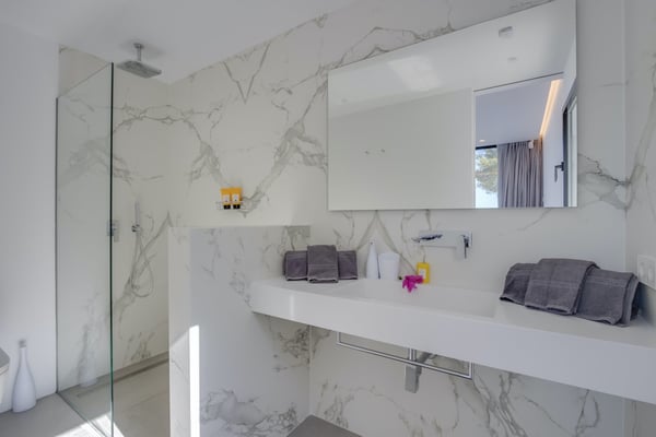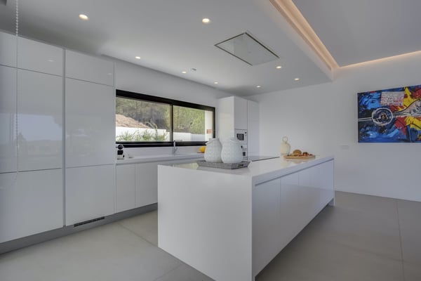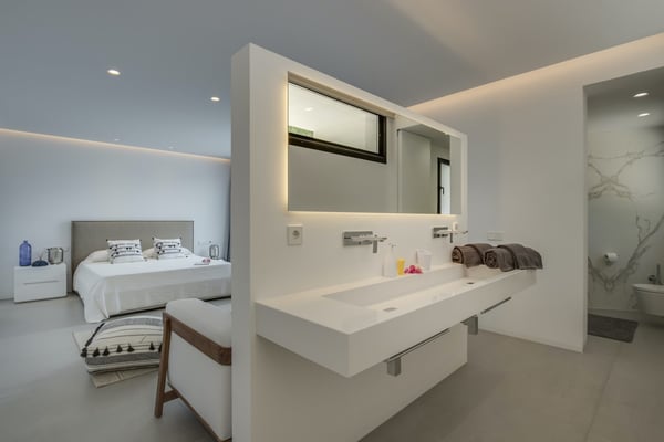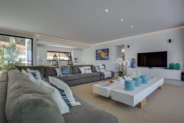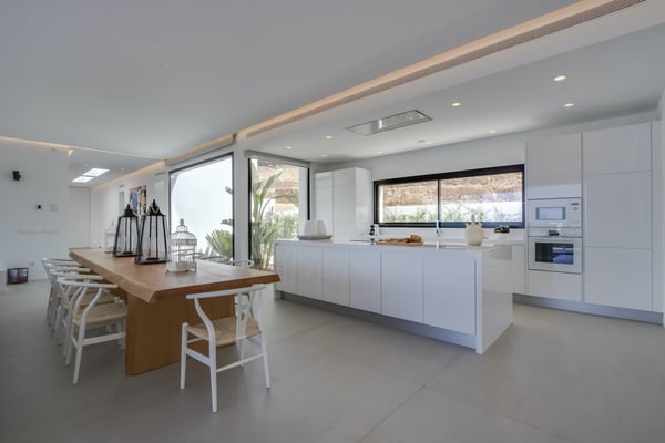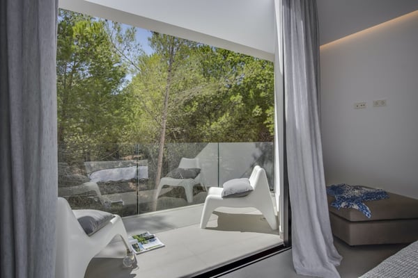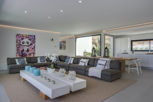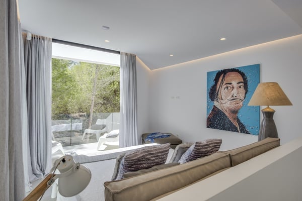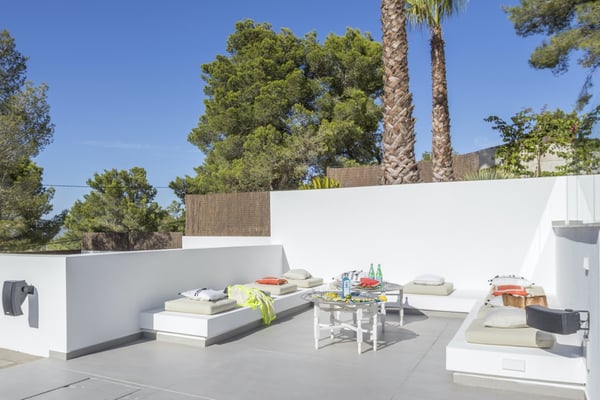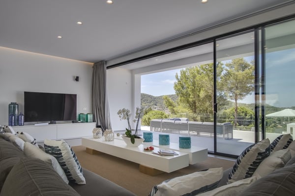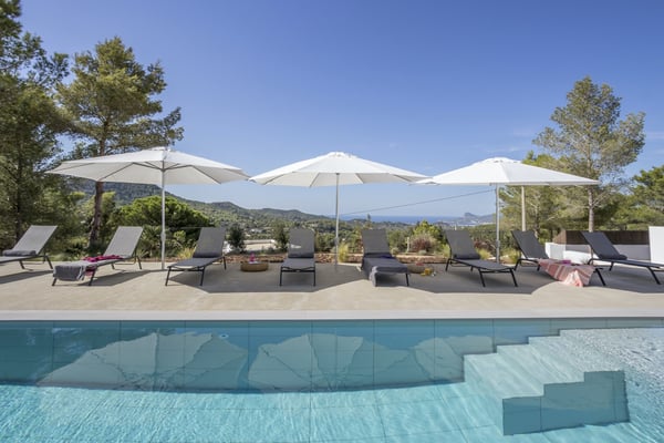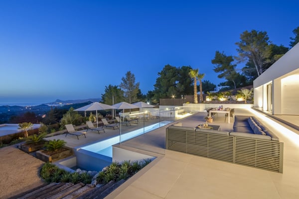 Designer villa for ten with lap infinity pool and stunning views, within walking distance of the village of San Jose and a five-minute drive from Cala Tarida beach. The house has been styled and furnished by a world-famous interior designer with all the latest state-of-the-art equipment and facilities. The wonderful Mediterranean weather can be enjoyed from the large 20 metre infinity pool where you can relax on the spacious sun terrace and appreciate the magnificent uninterrupted countryside, sea and sunset views. There is a large outdoor dining area seating ten people, a spacious chill-out area beside the pool as well as a comfortable outdoor seating area by the outdoor dining table and a roof terrace. Private gates lead to a car parking area large enough for several cars.